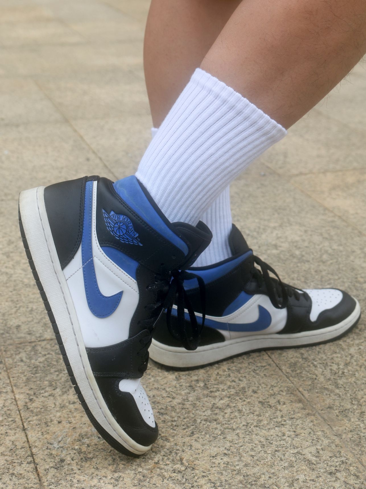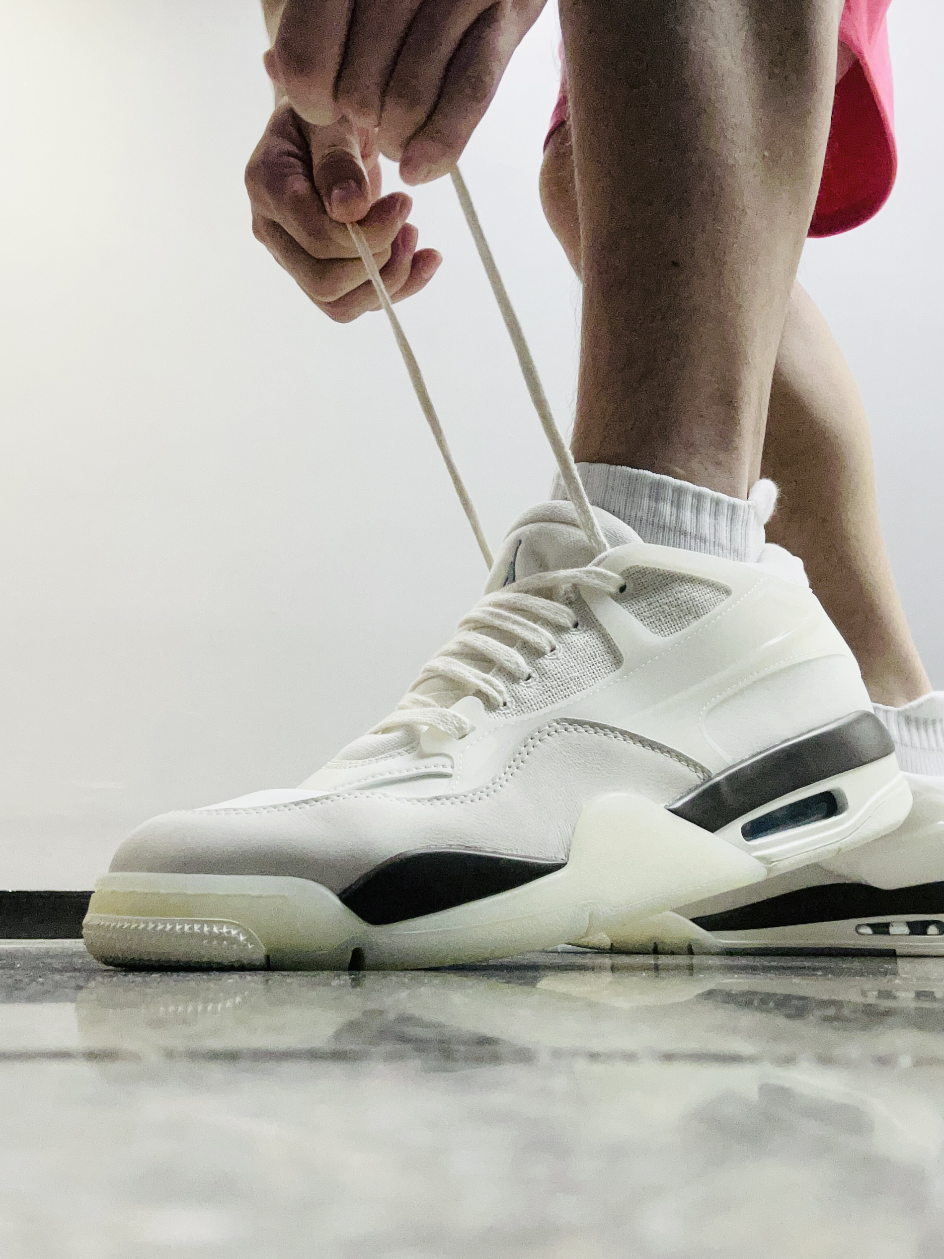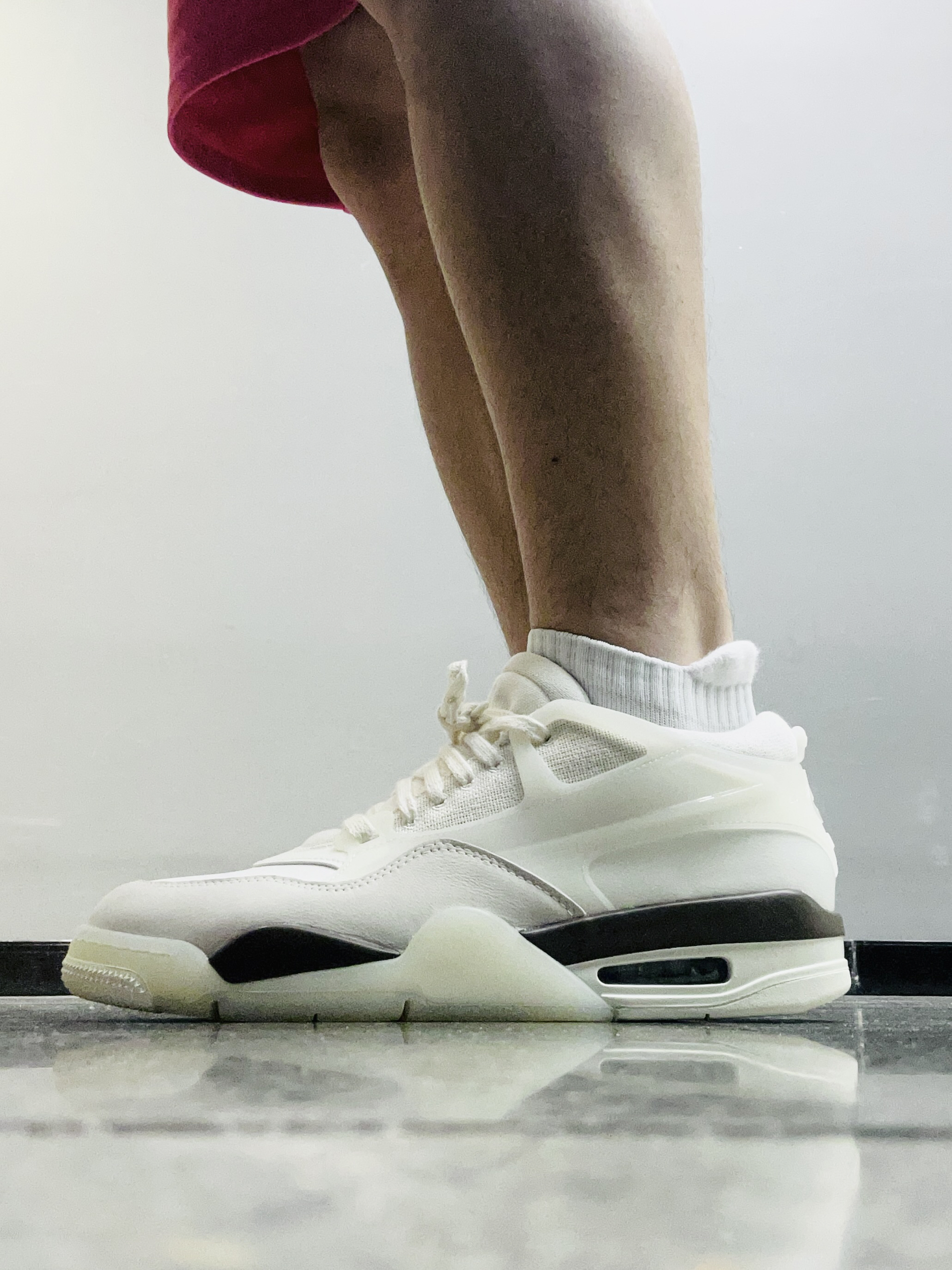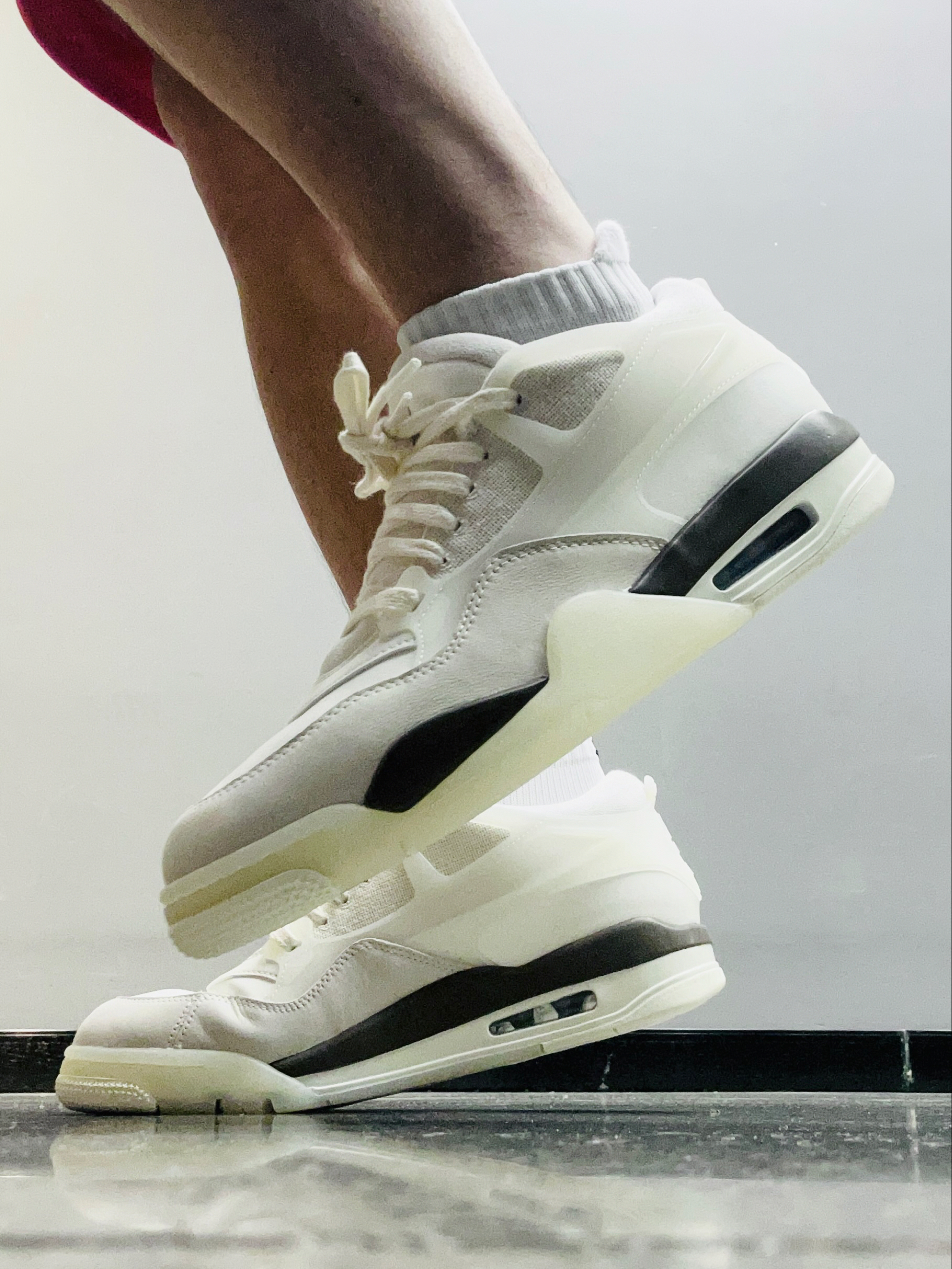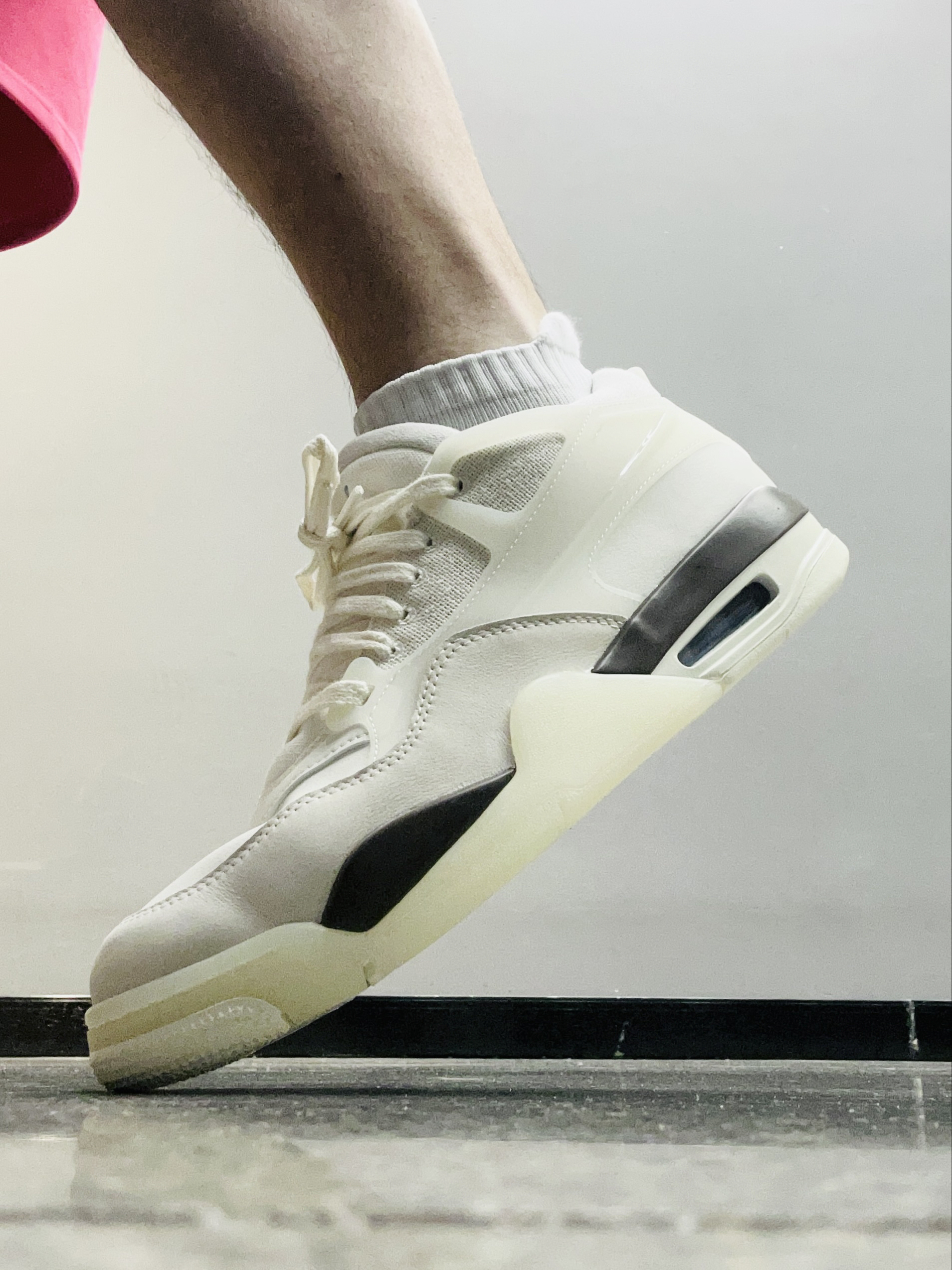 大家好,这里是老张💕 低头拍下今天穿的鞋‼️ Jordan 4 RM 奶白色 🌟:奶白色真的好好看啊!我上脚就觉得百搭又清爽,浅蓝色的飞人LOGO 很有特色! 🌟:鞋面以皮革、尼龙网布或牛仔布等材质拼接,兼顾支撑性与透气性,中底搭载可视化Air Sole气垫,我刚上脚的脚感会有稍微的硬,气垫踩开了就会舒适柔软了! 🌟:尺码正常的,平时搭配运动装、休闲装都可以的!秋冬天很适合穿这双!