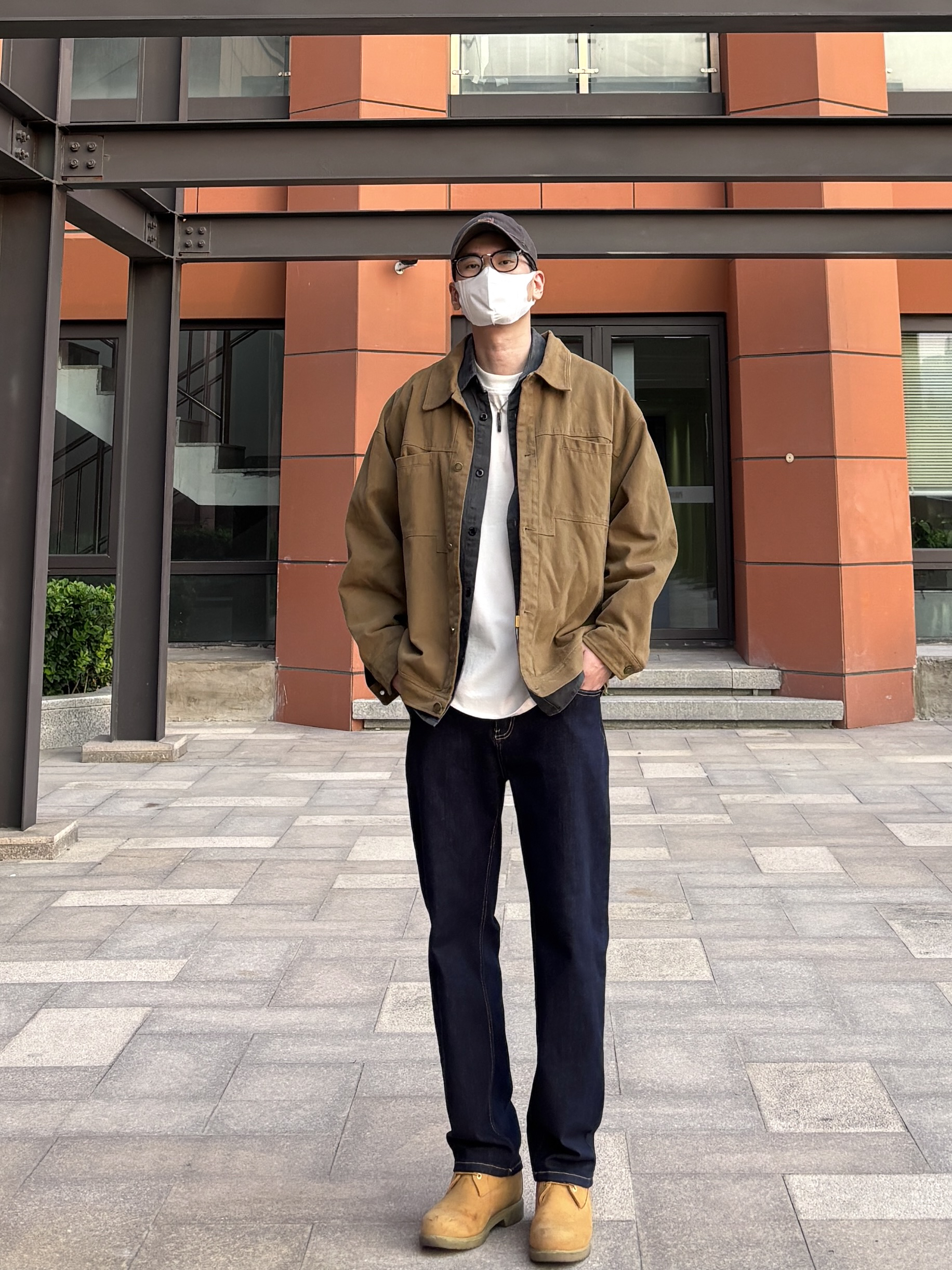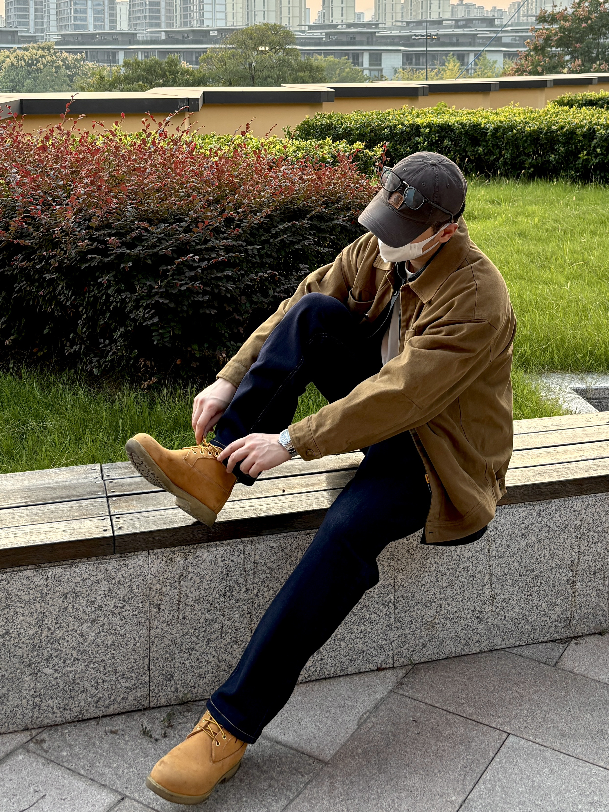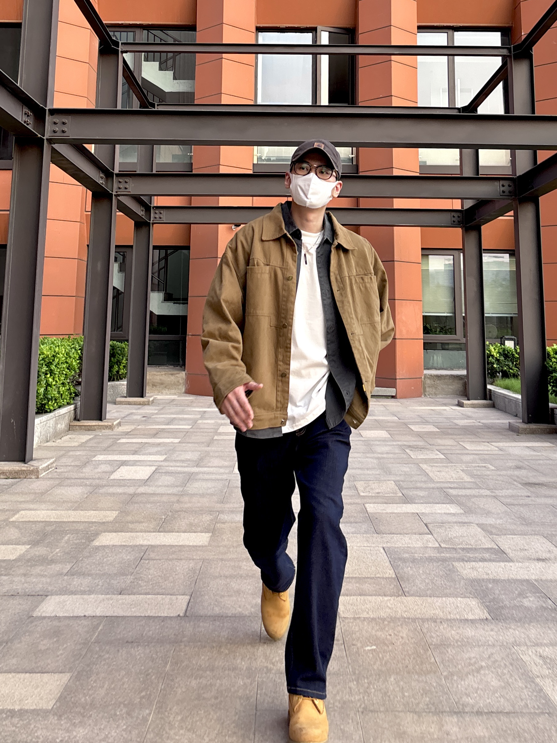 今天上身灰色工装衬衫搭配卡其色工装夹克,搭配原色水洗牛仔裤,主打一个硬帅。 - 今日搭配 衣服裤子都来自:NICE LILI 鞋子:timberland