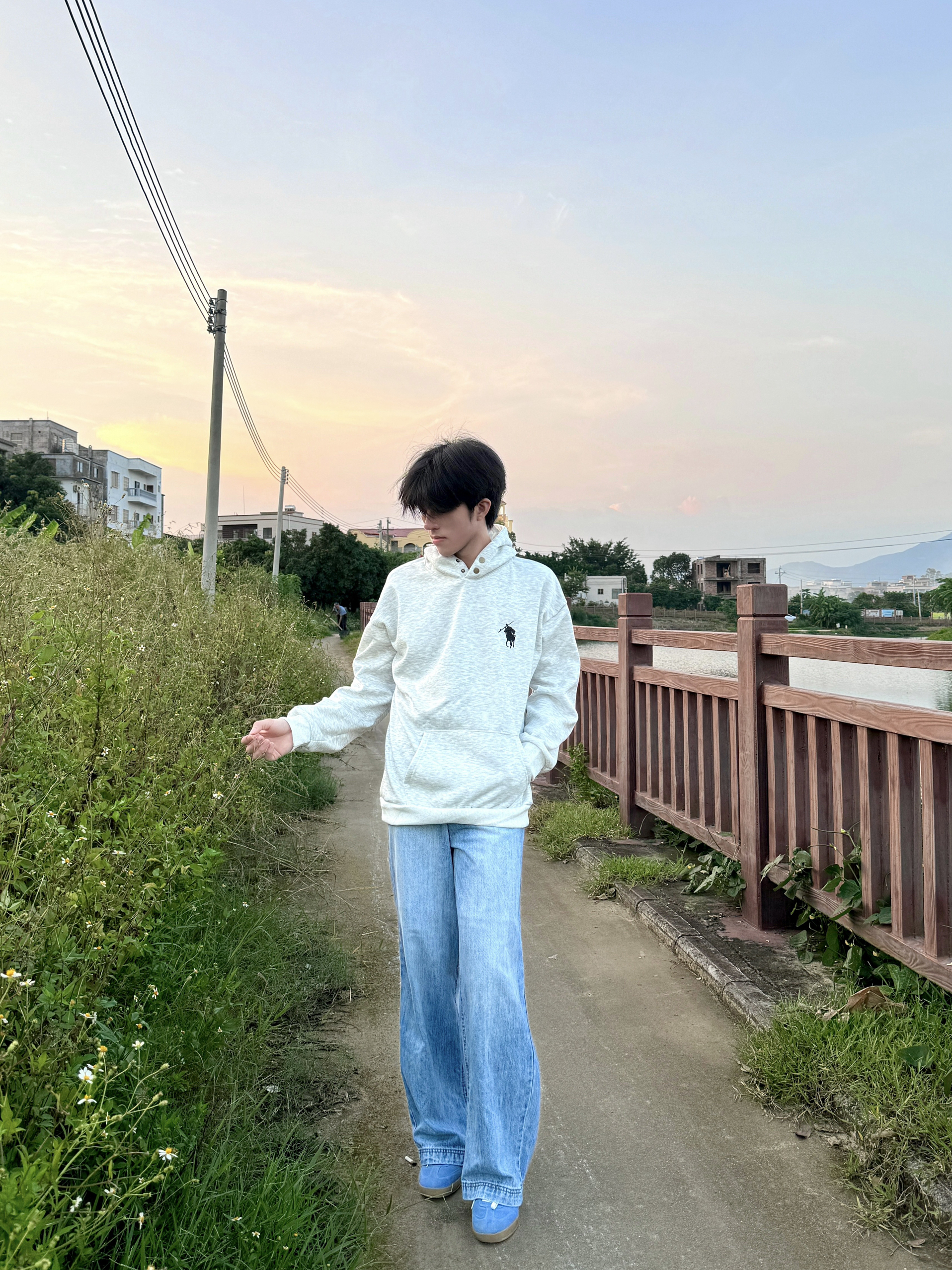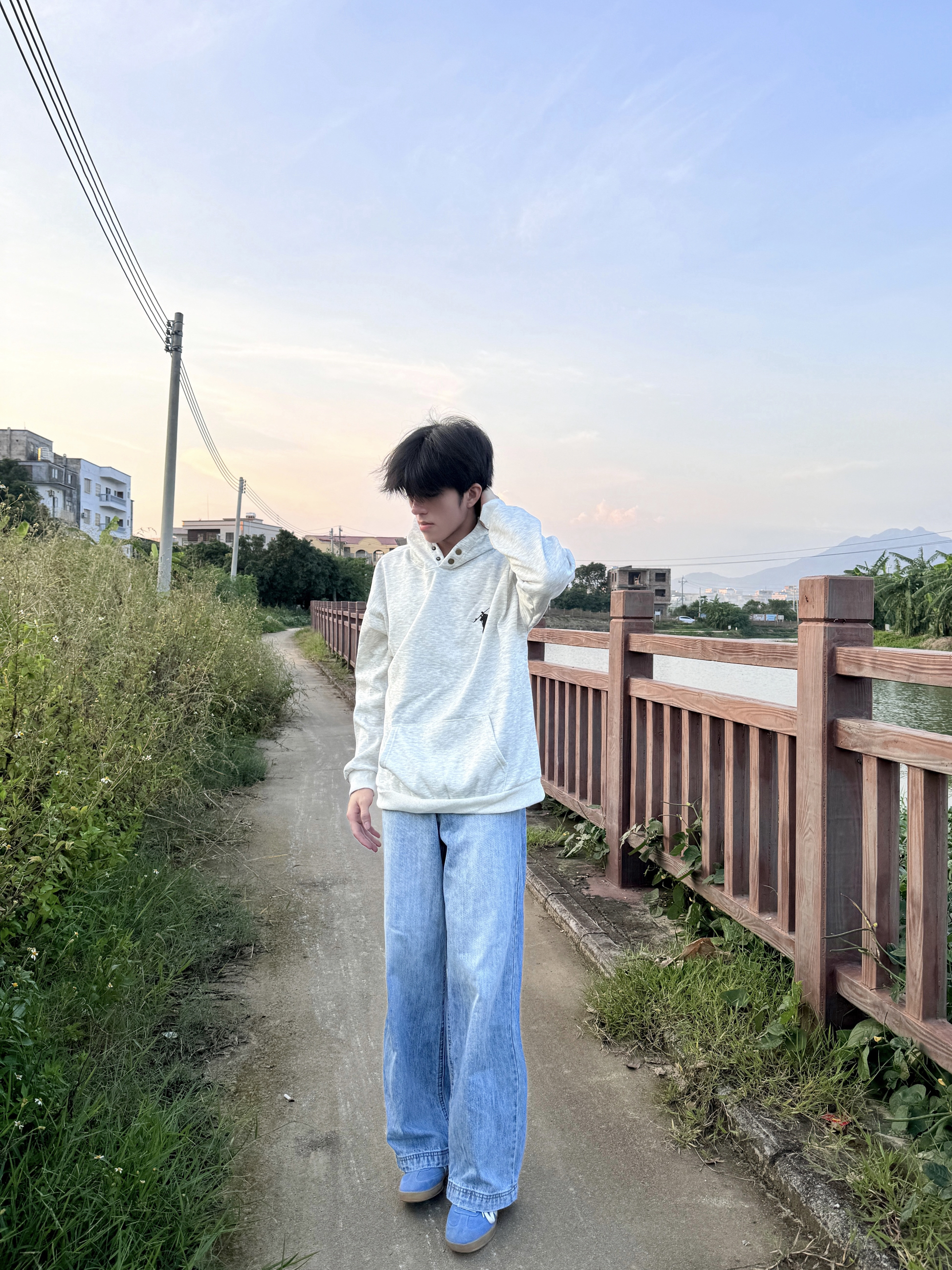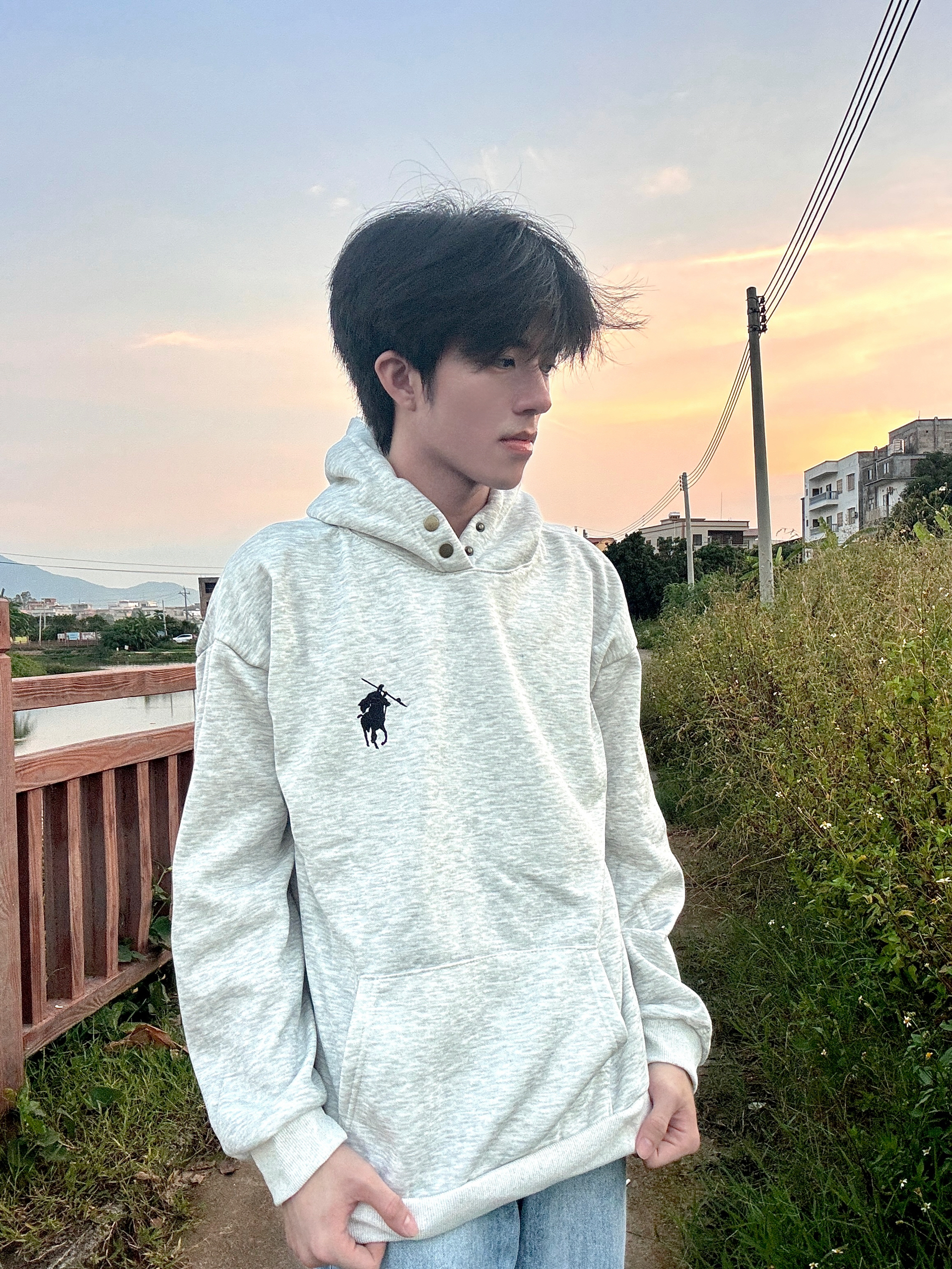 傍晚在河边小路散步时穿了这件燕麦灰连帽衫,面料软得像被风揉过,厚度刚好接住黄昏的微凉。领口的金属扣细节很显质感,不会像普通卫衣那样单调。配阔腿牛仔裤走起来,风灌进衣摆,和河岸的草香混在一起,舒服得想一直晃下去——日常出门随便一搭,这种不费力的松弛感,比刻意扮帅更自在。