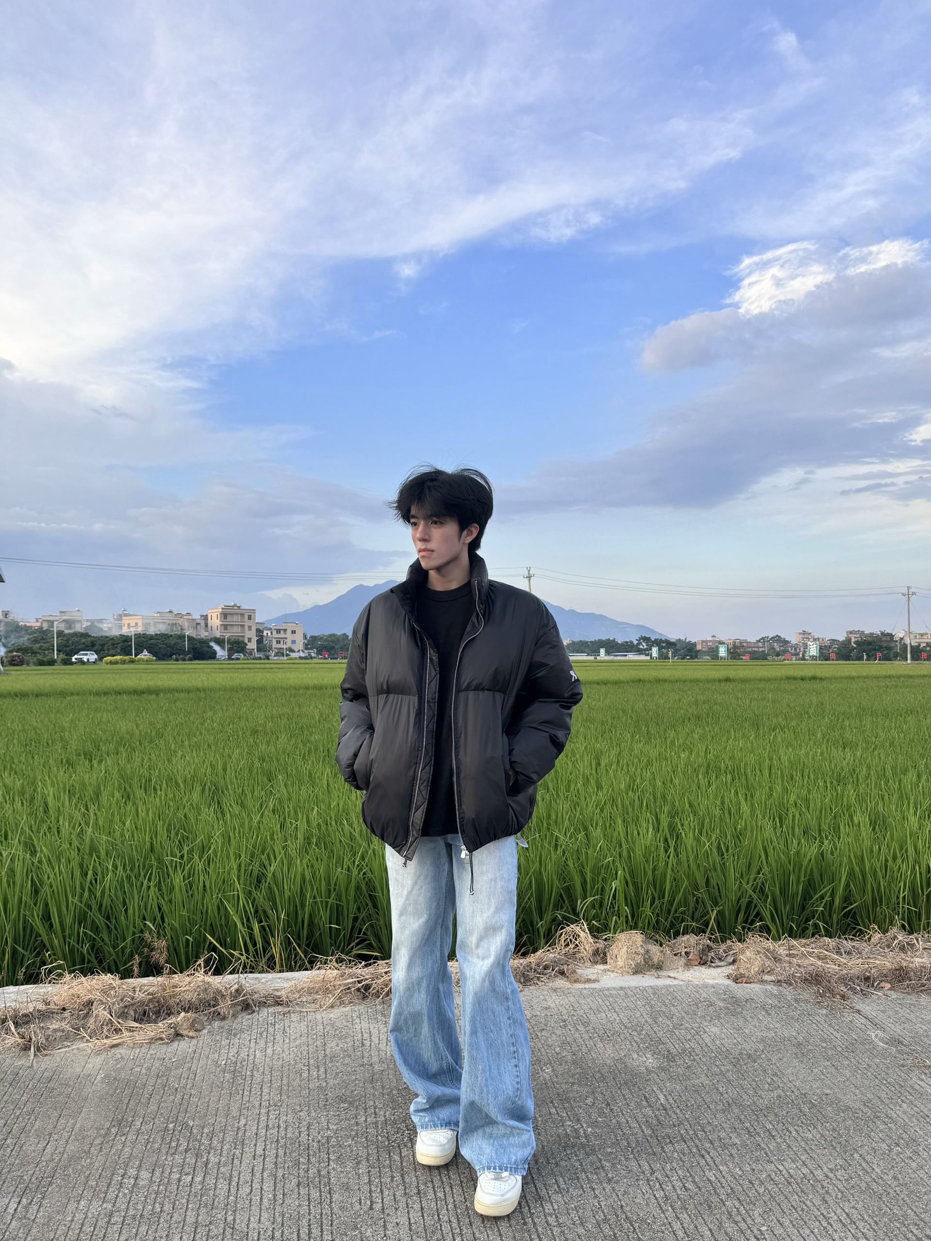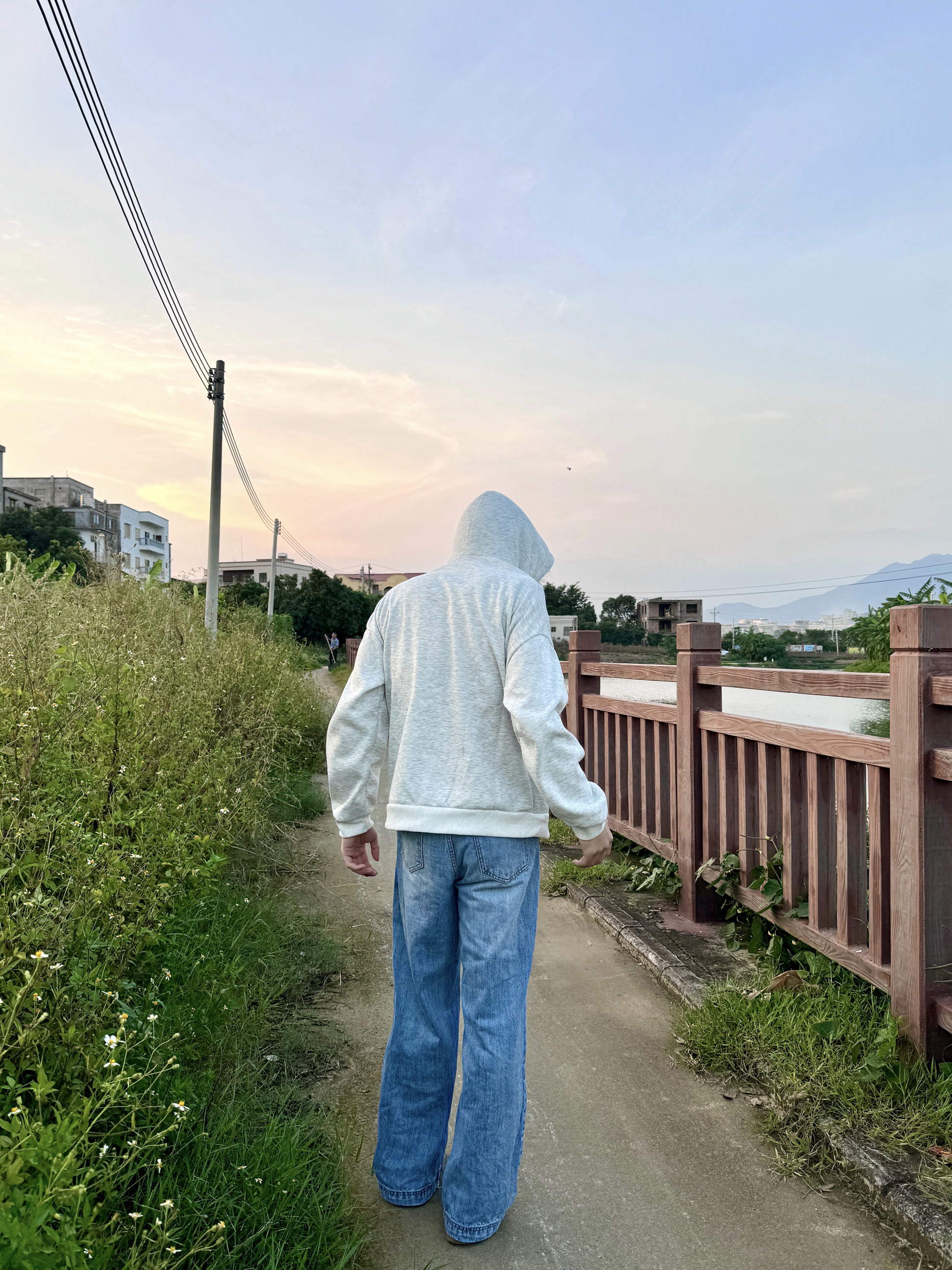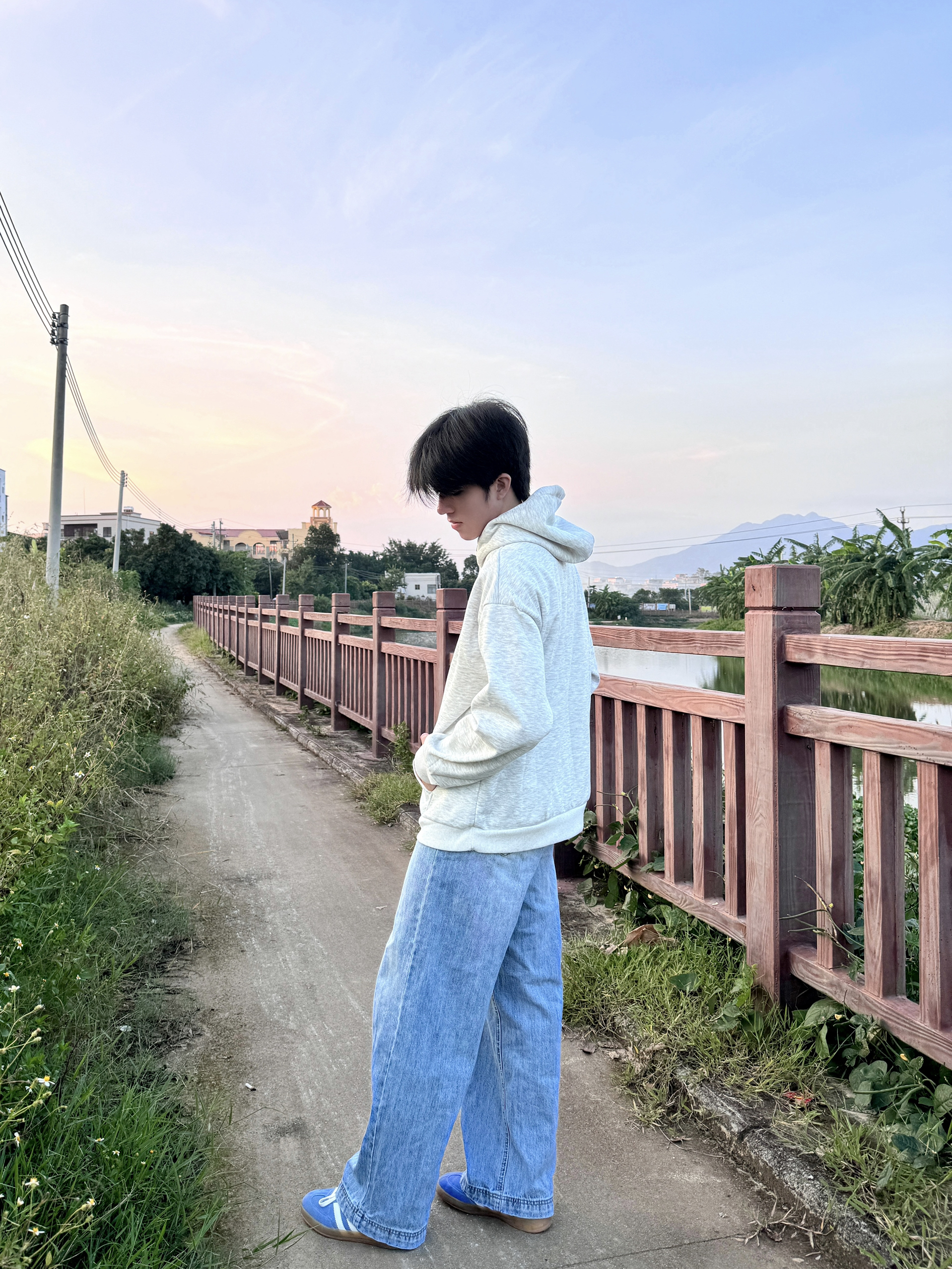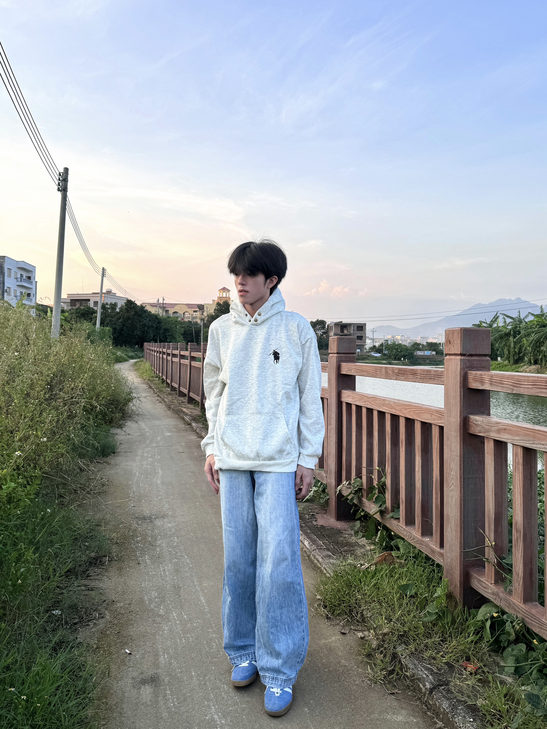 傍晚在河边小路散步时穿了这件燕麦灰连帽衫,面料软得像被风揉过,厚度刚好接住黄昏的微凉。领口的金属扣细节很显质感,不会像普通卫衣那样单调。配阔腿牛仔裤走起来,风灌进衣摆,和河岸的草香混在一起,舒服得想一直晃下去——日常出门随便一搭,这种不费力的松弛感,比刻意扮帅更自在。