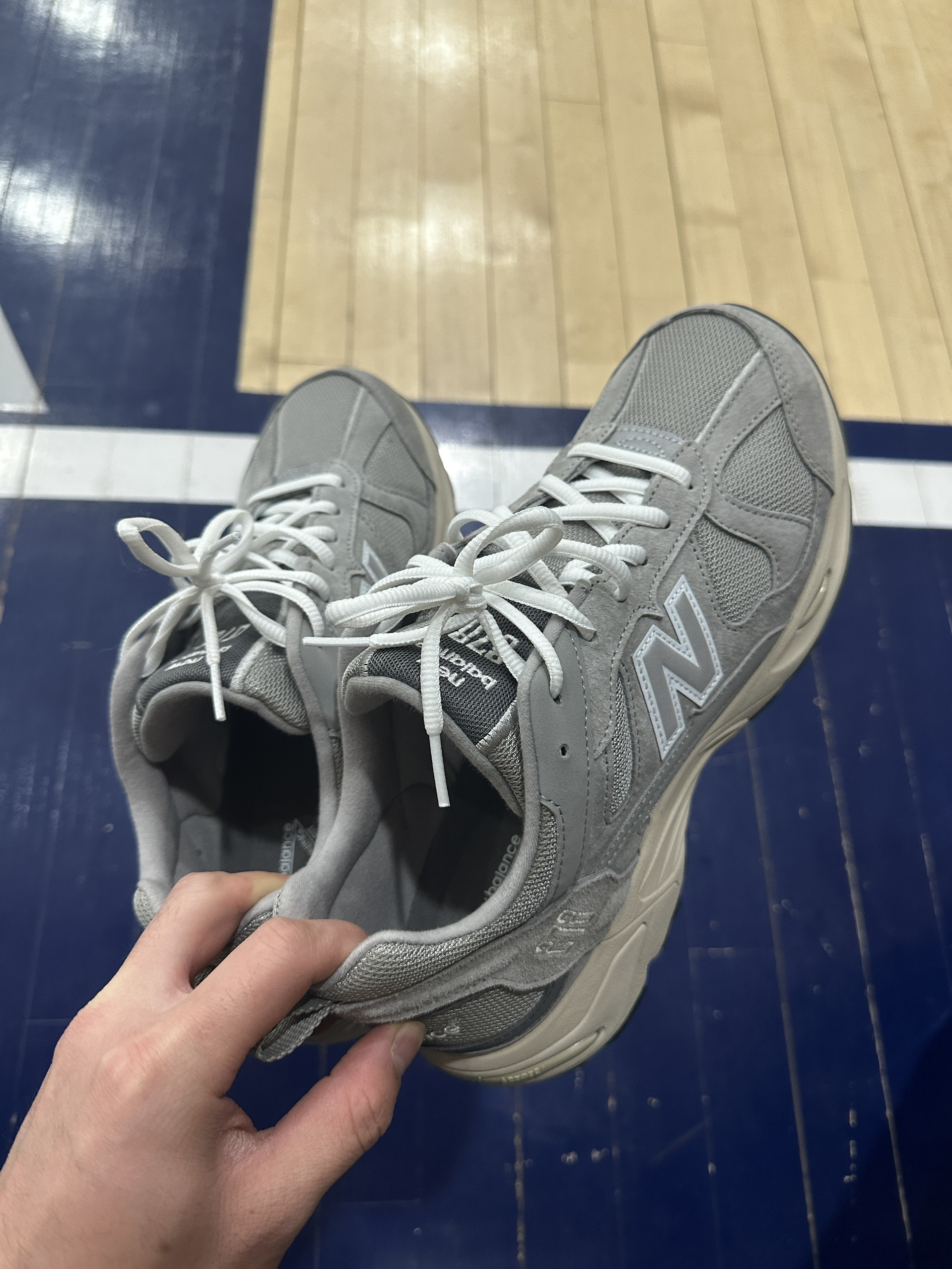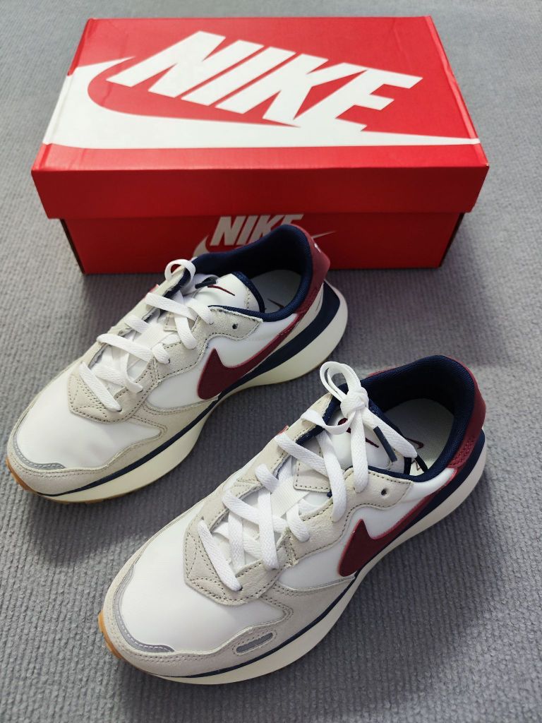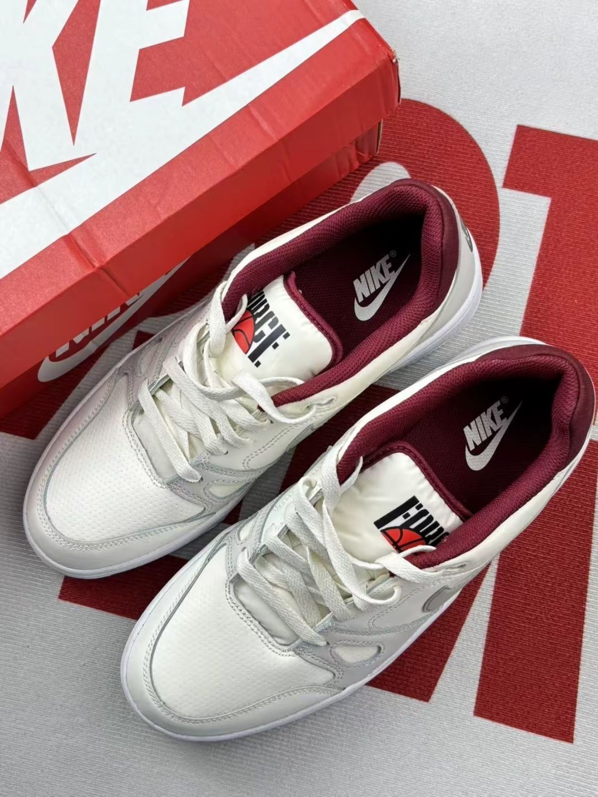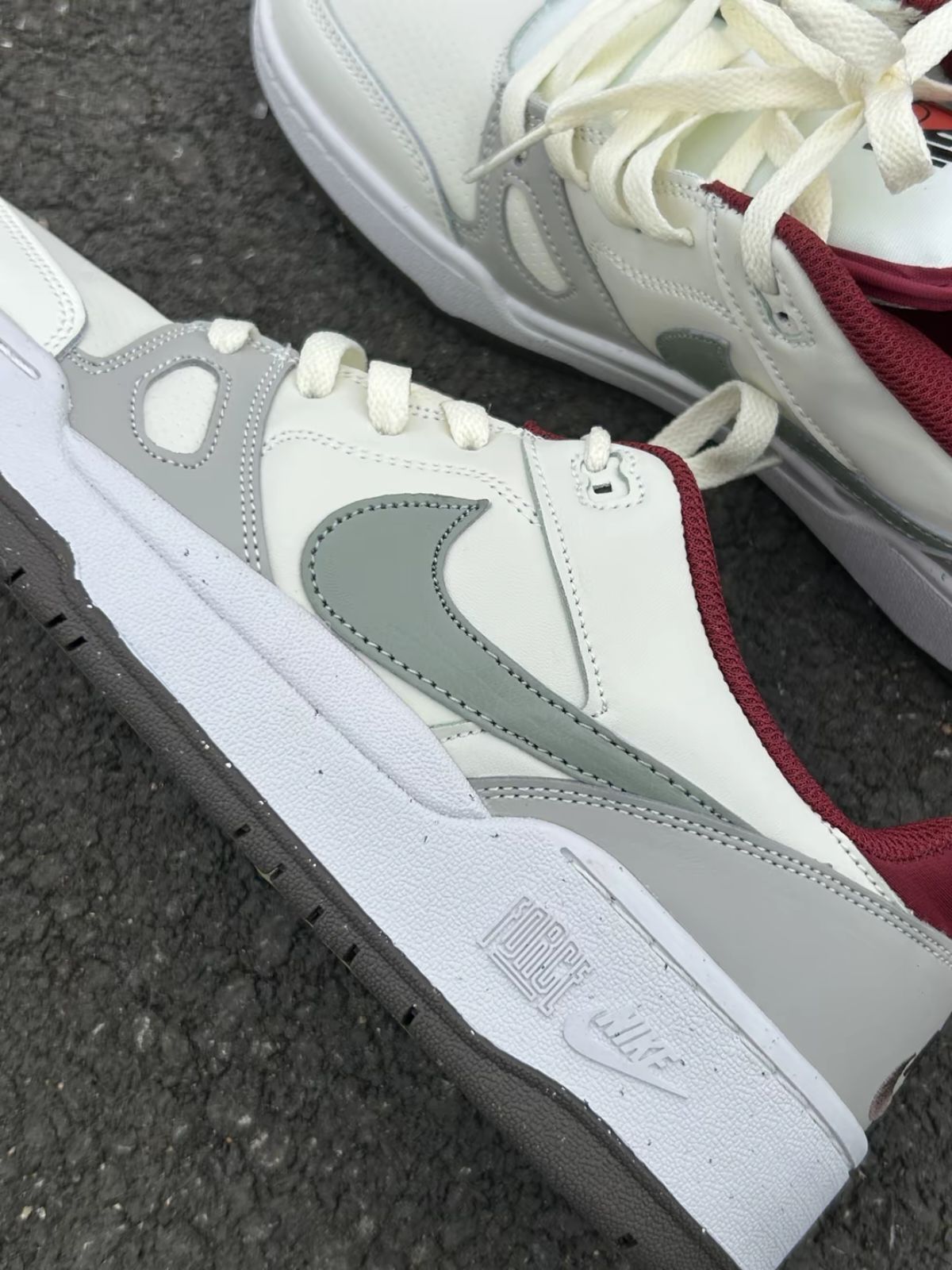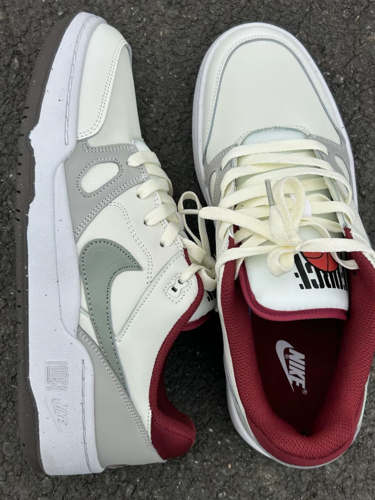 来~分享下我刚上脚的这双Nike Full Force!拿到手就被配色戳中,米白主调搭浅灰Swoosh,后跟那抹酒红特别提气,像给鞋子加了点睛笔~上脚第一感觉是轻,皮革面摸着软乎乎的,低帮设计把脚踝线条衬得特好看。 昨天穿它去逛了下午街,走久了也没觉得累,鞋底是那种软软的脚感。搭配方面,我试了搭束脚运动裤,休闲感拉满;今天换了条直筒牛仔裤,又有点复古那味儿了,感觉这双鞋能承包我开春大半的穿搭~