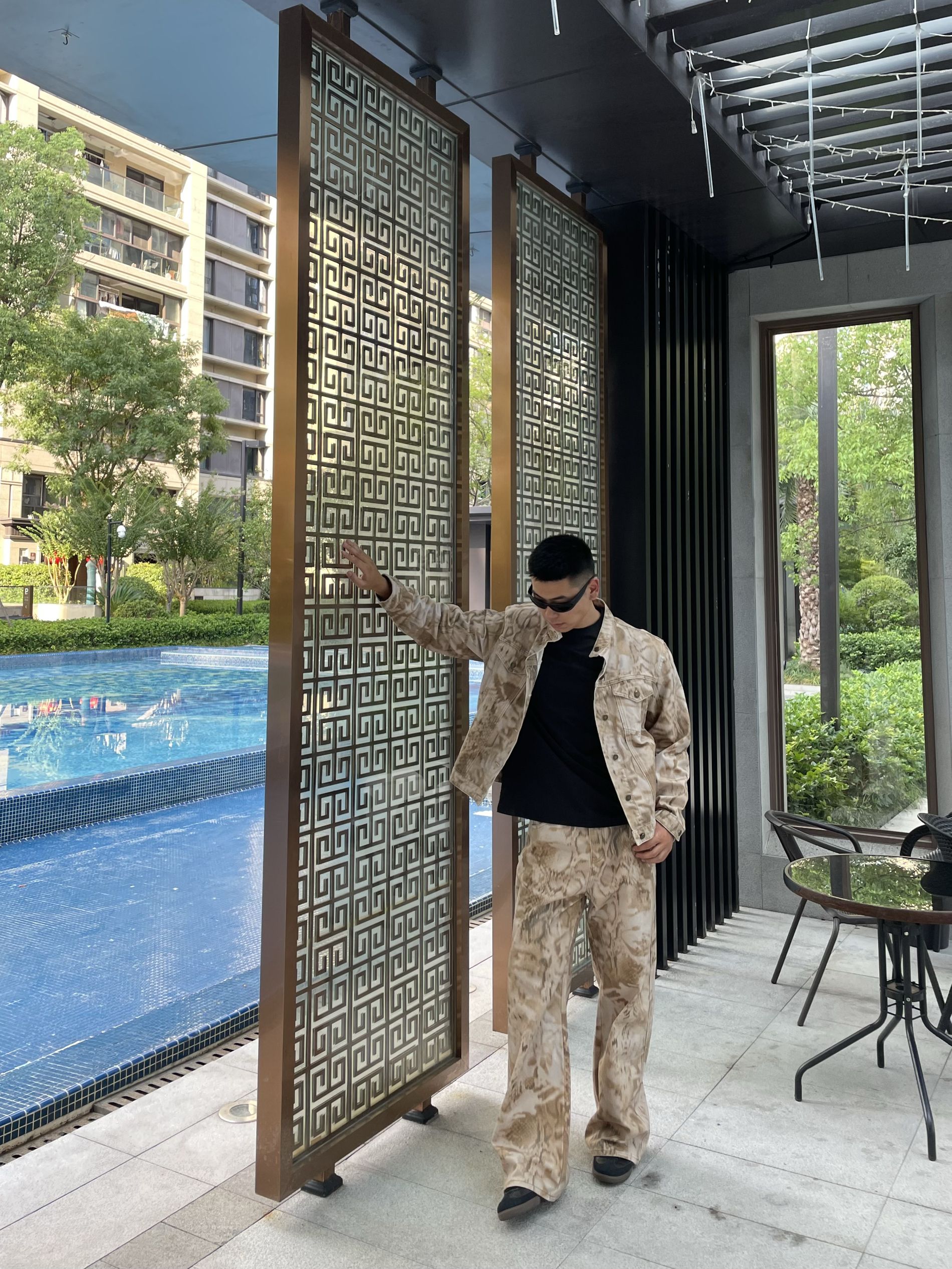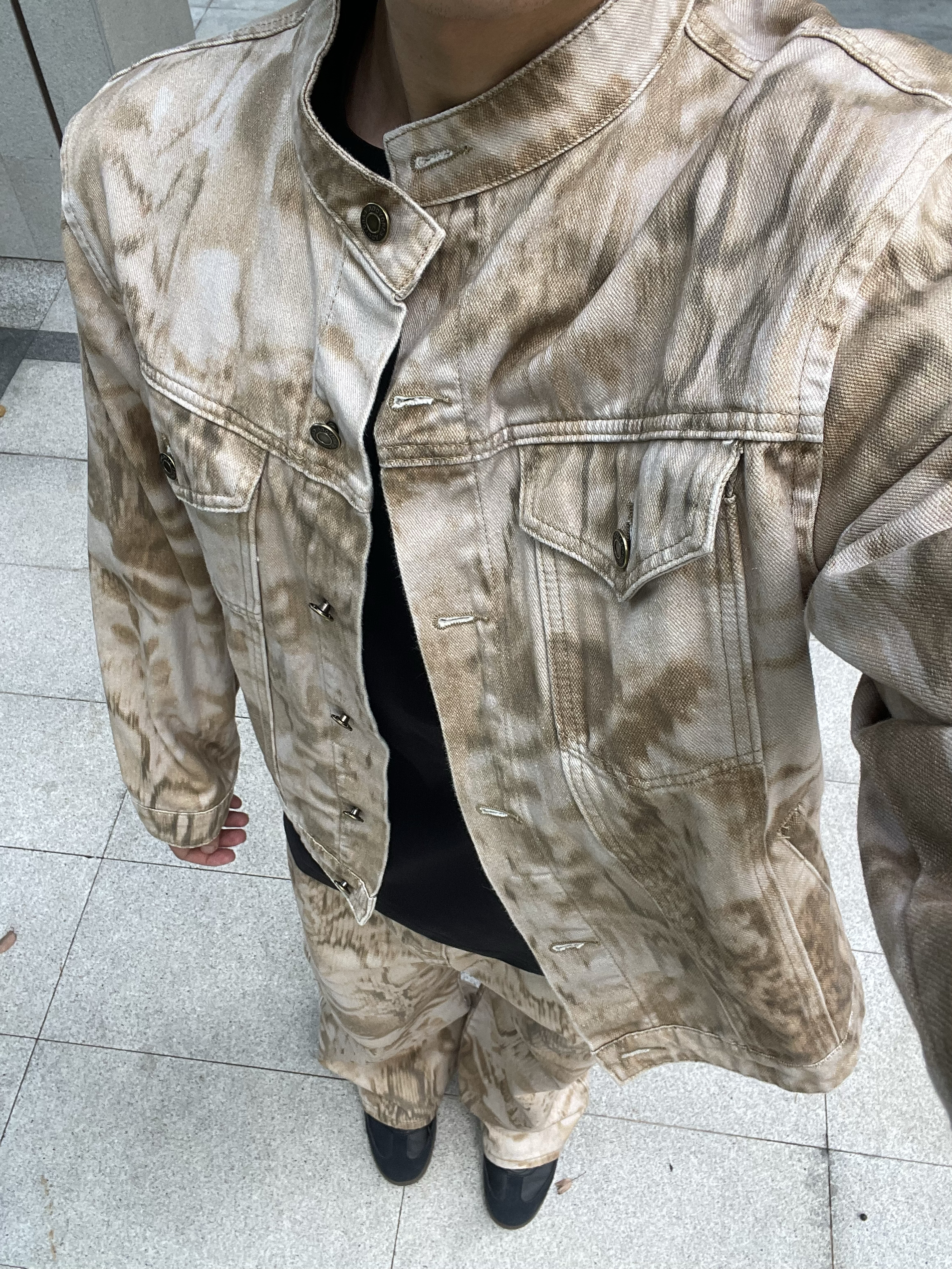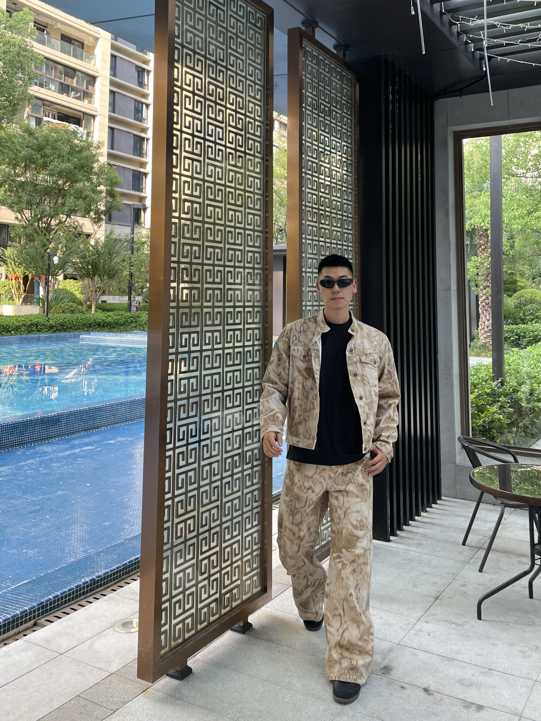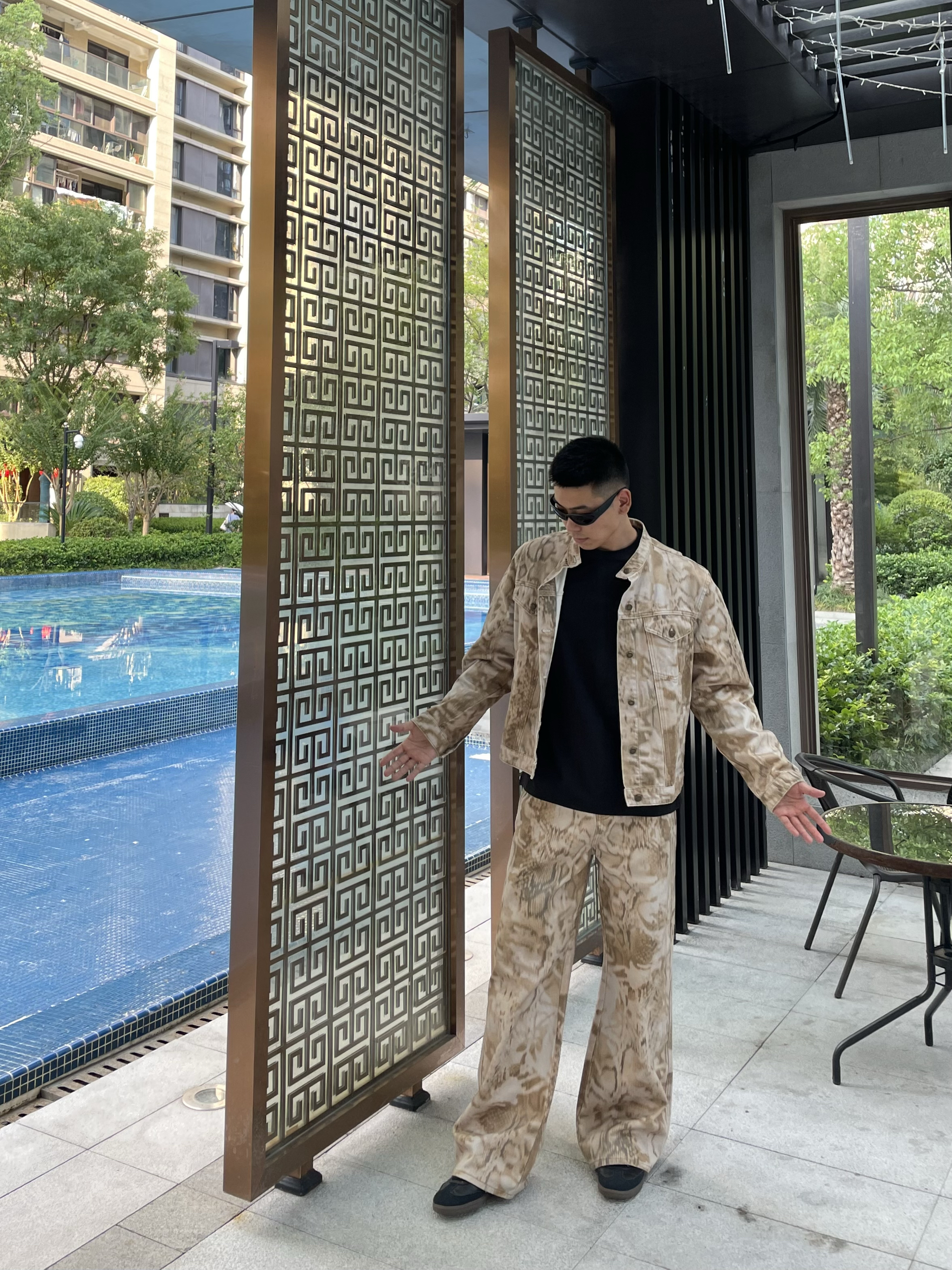 holo 今日穿搭分享🤩 不知道什么花纹的🤠牛仔套装! 整体是深卡其和浅卡其渐变的一个颜色~ 一套真的太好穿呜~ 随意搭配小板鞋➕纯色短袖就很吸睛😍 逛街这么穿~ 回头率确实高啊🤨 🙋 181cm 75kg 穿着2XL宽松效果✅