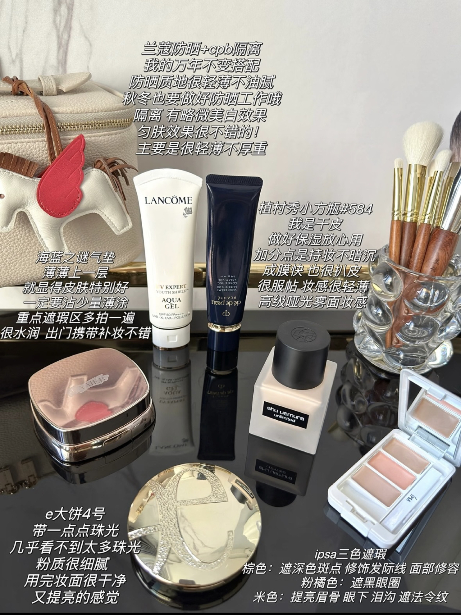 我给大家精挑细选了一期我爱用的彩妆好物! 都是日常使用频率比较高的彩妆~ 底妆篇:兰蔻防晒 cpb 隔离 植村秀小方瓶 ipsa遮瑕 海蓝之谜气垫e大饼 眼影修容口红化妆刷:tf20 tf31彩棠三色修容盘 阿玛尼口红 艾诺琪化妆刷!
