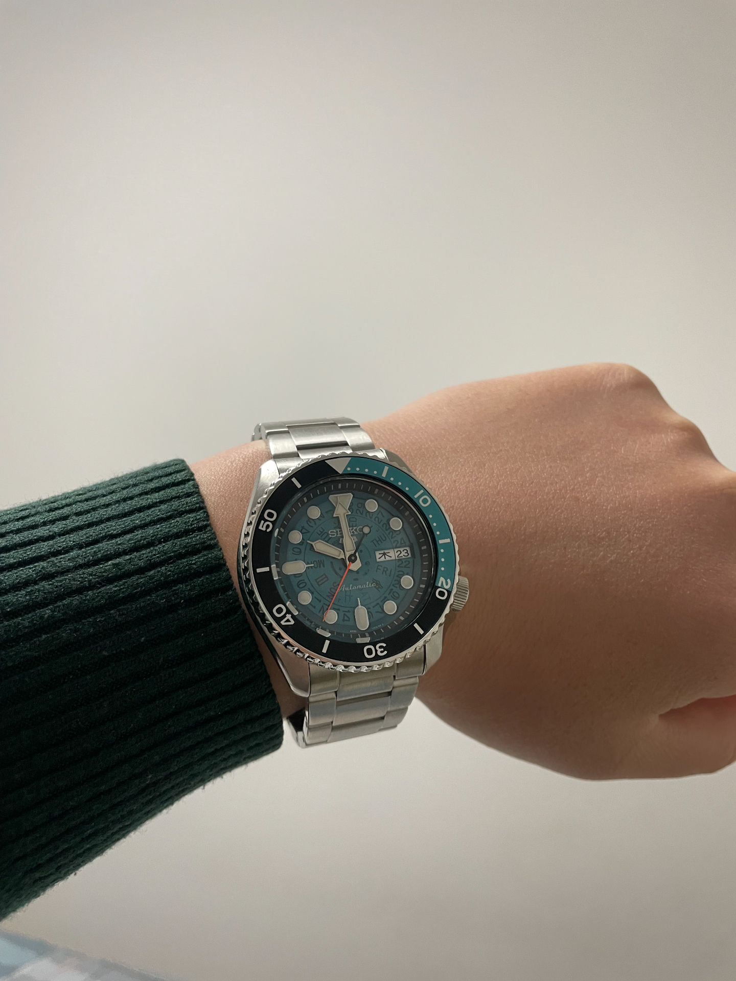 戴了段时间这表,忍不住来分享~它颜值好高,蓝绿配色很特别,日常搭正装、休闲装都不违和👍。我白天戴着,一天误差不到10秒,走时还挺准的~表带是精钢的,重量合适,戴着手也不硌得慌👏。不过要是表盘能再小一丢丢,对细手腕星人会更友好~
