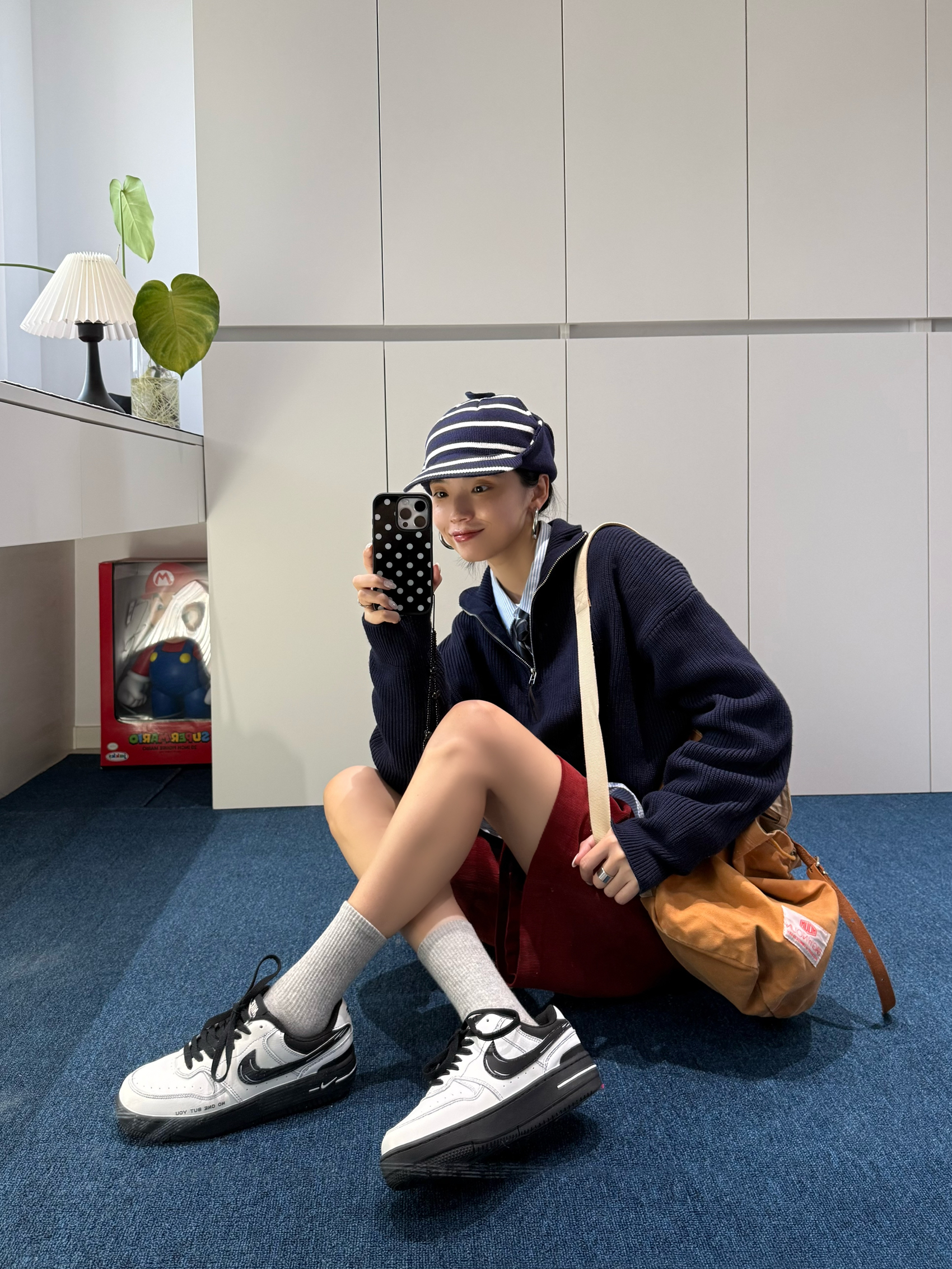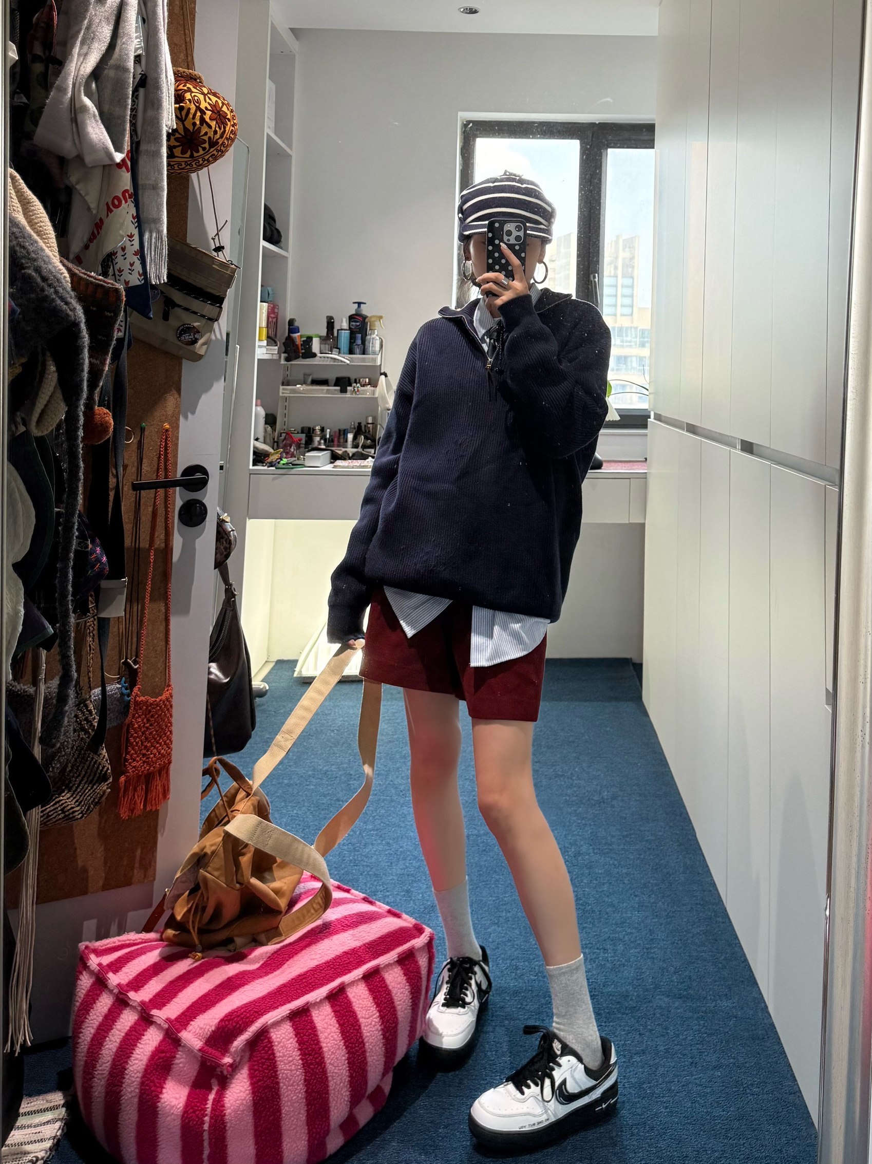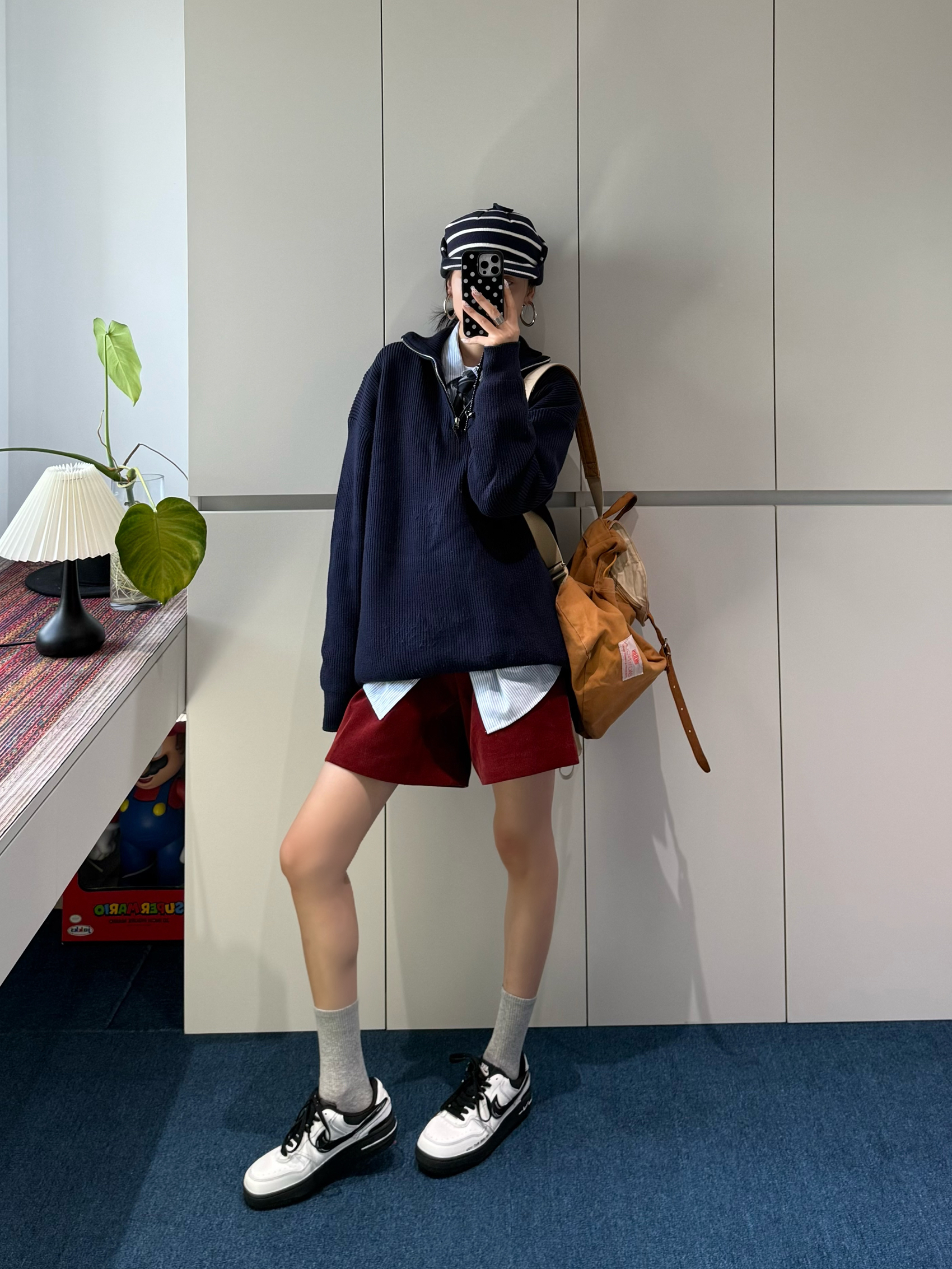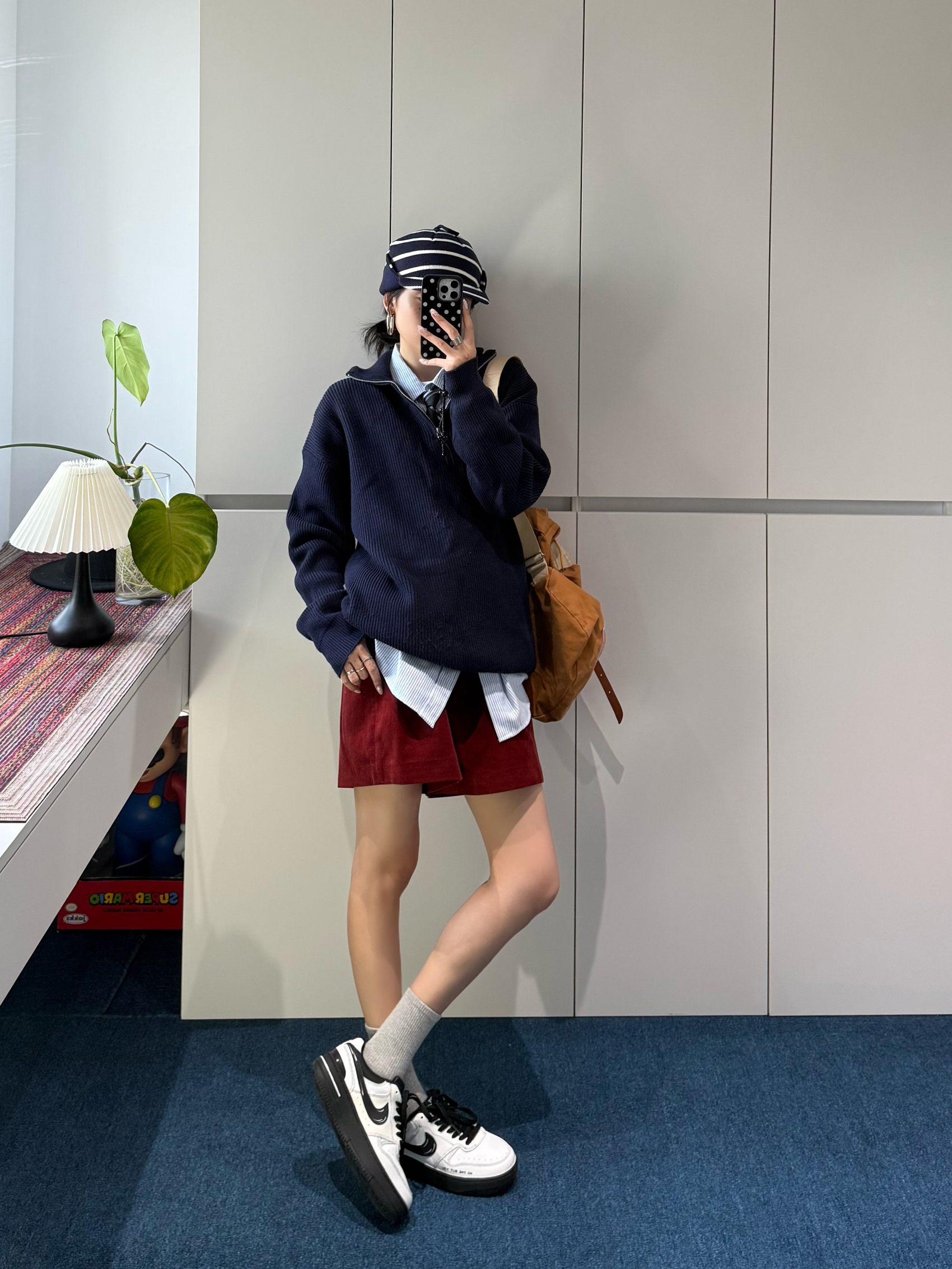 藏青半拉链毛衣叠穿条纹衬衫👔 酒红短裤提亮造型🌹 脚上的Nike经典黑白配色百搭又有复古质感,脚感舒适还能适配多种风格✅ 这种混搭的学院风里还藏了很多小心思你们发现了么?