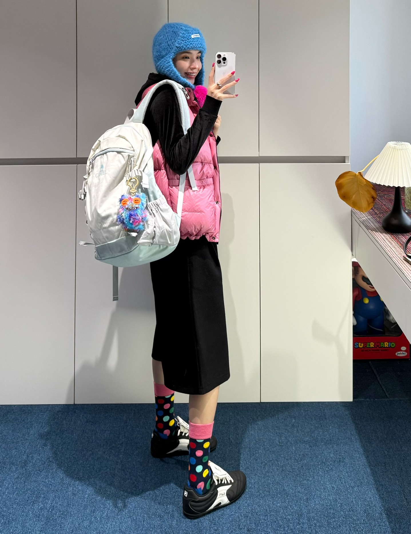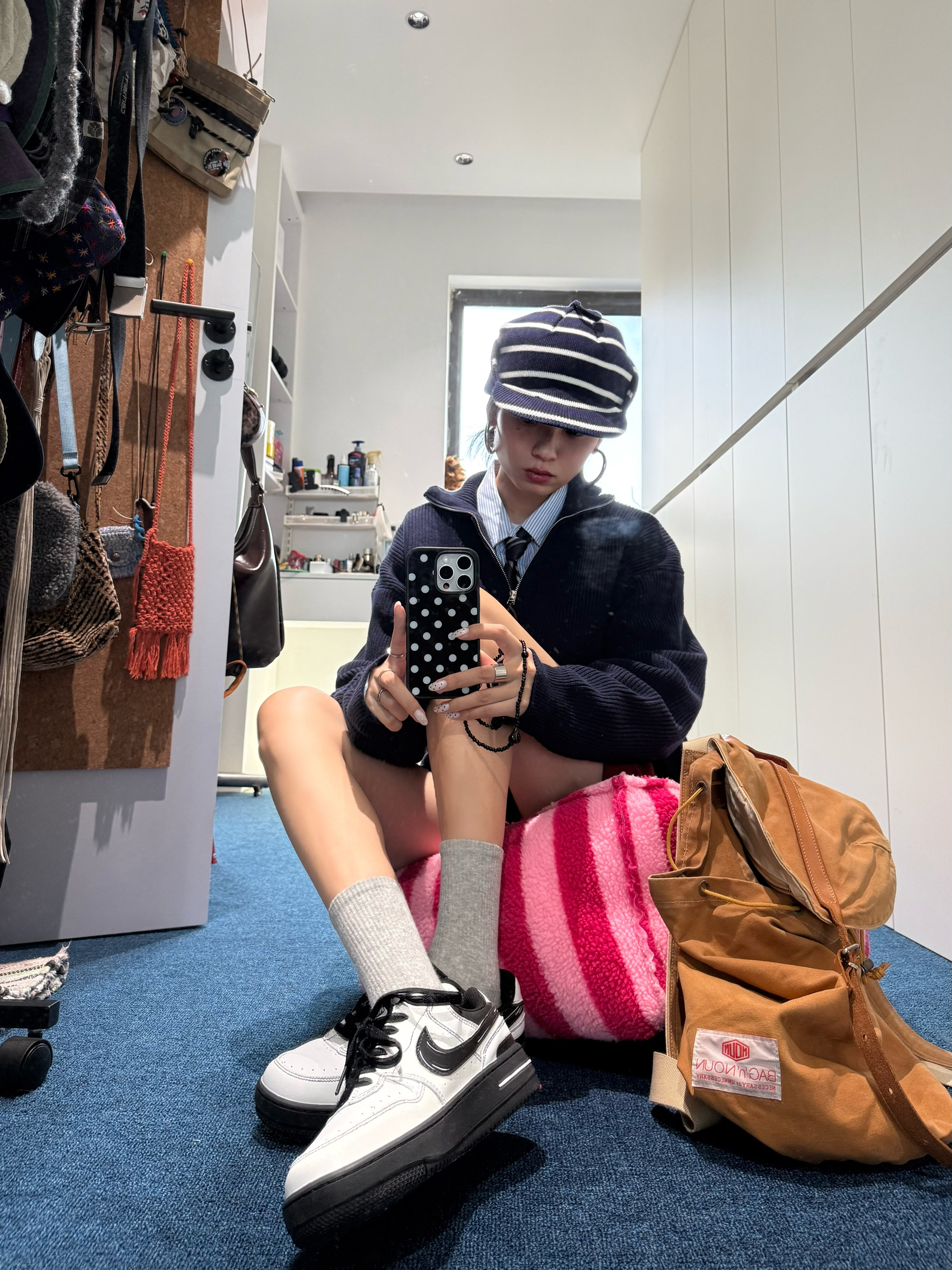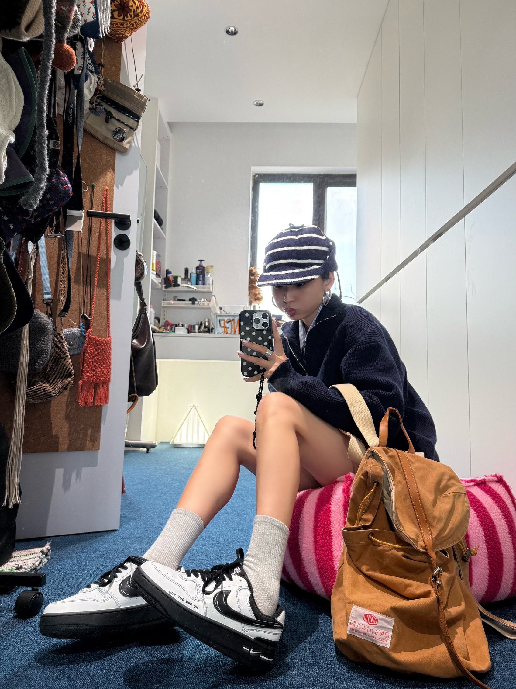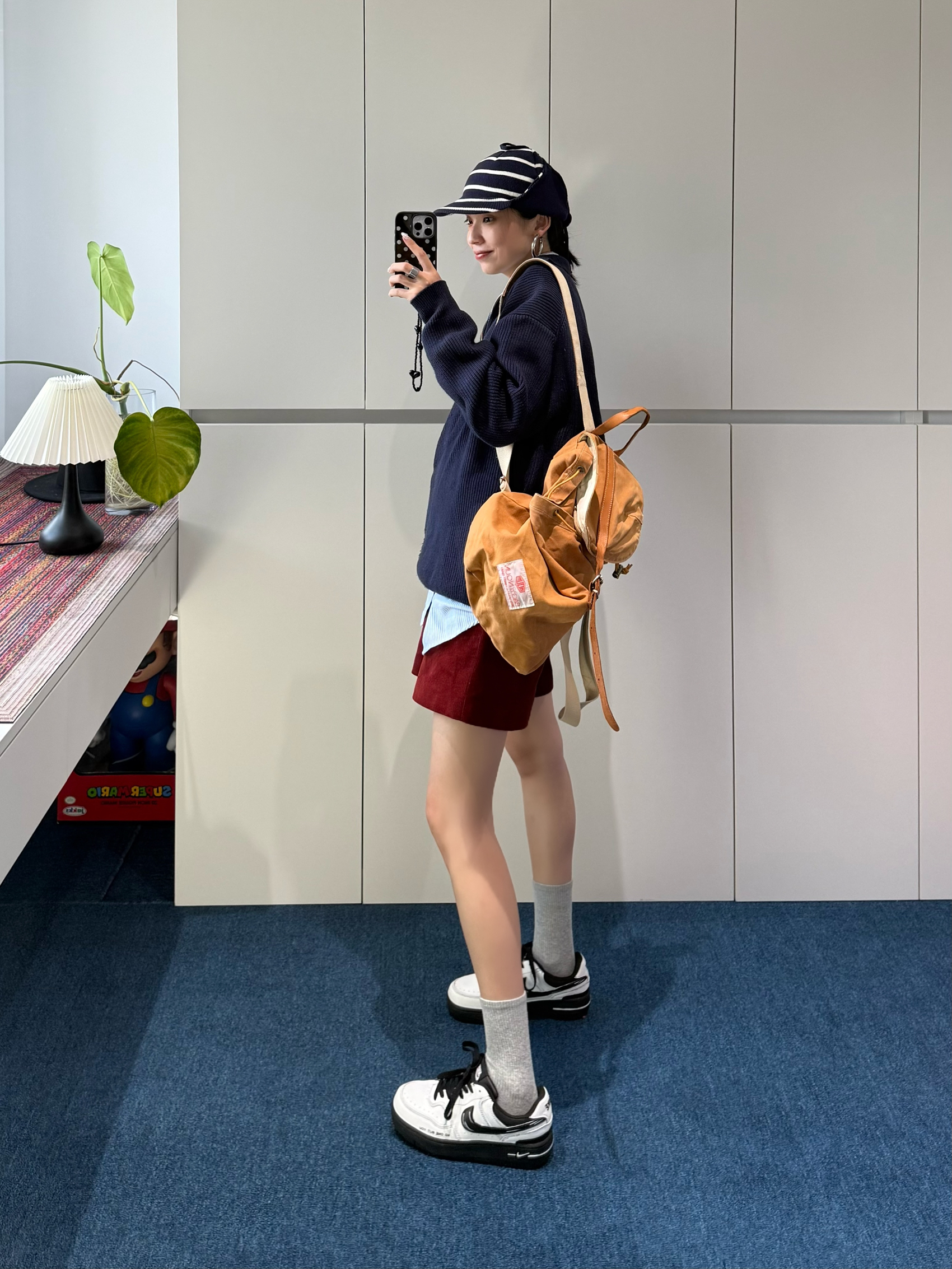 藏青半拉链毛衣叠穿条纹衬衫👔 酒红短裤提亮造型🌹 脚上的Nike经典黑白配色百搭又有复古质感,脚感舒适还能适配多种风格✅ 这种混搭的学院风里还藏了很多小心思你们发现了么?