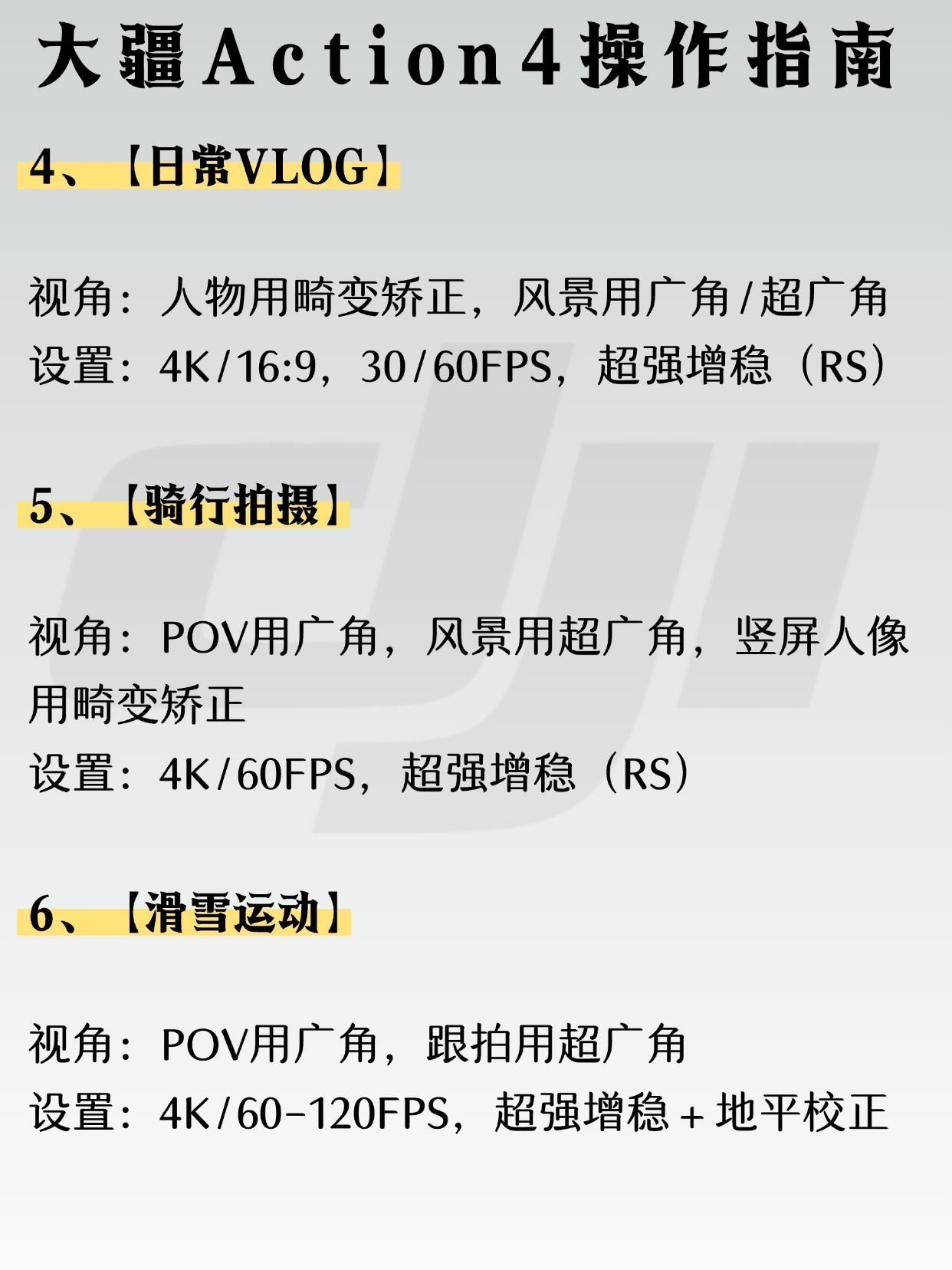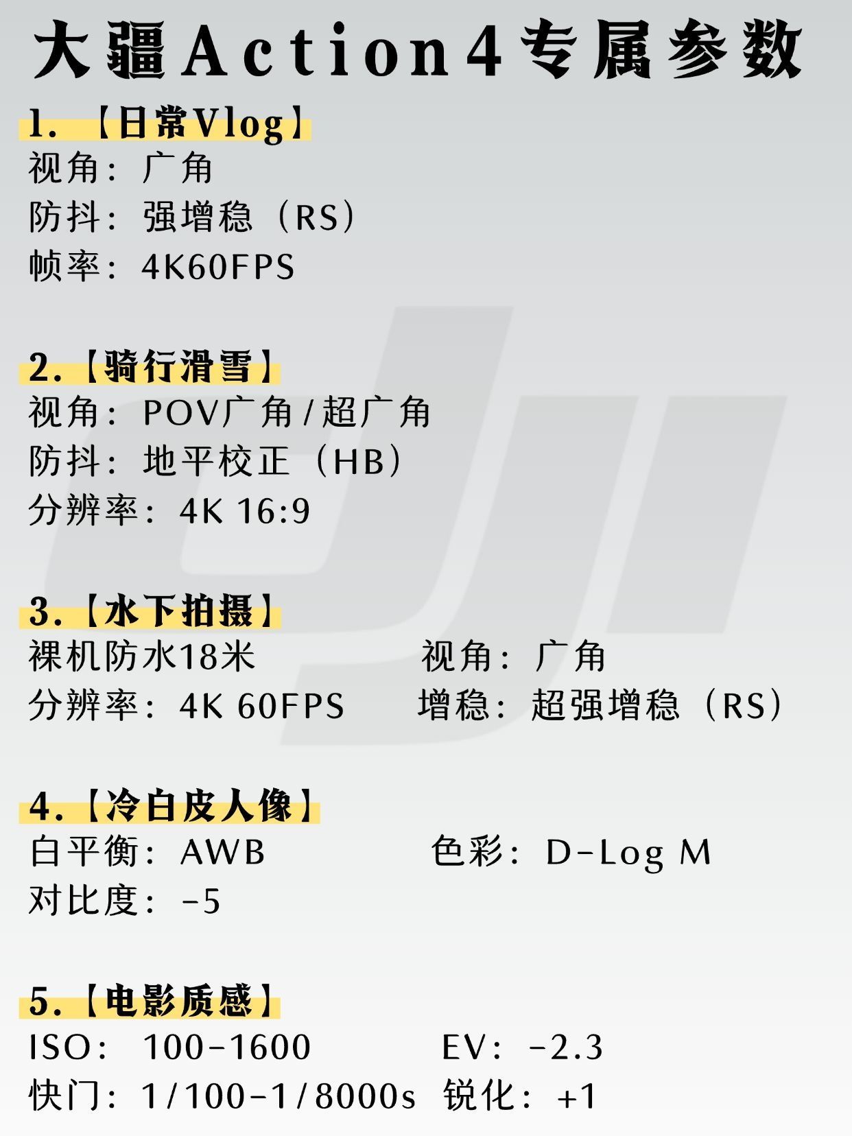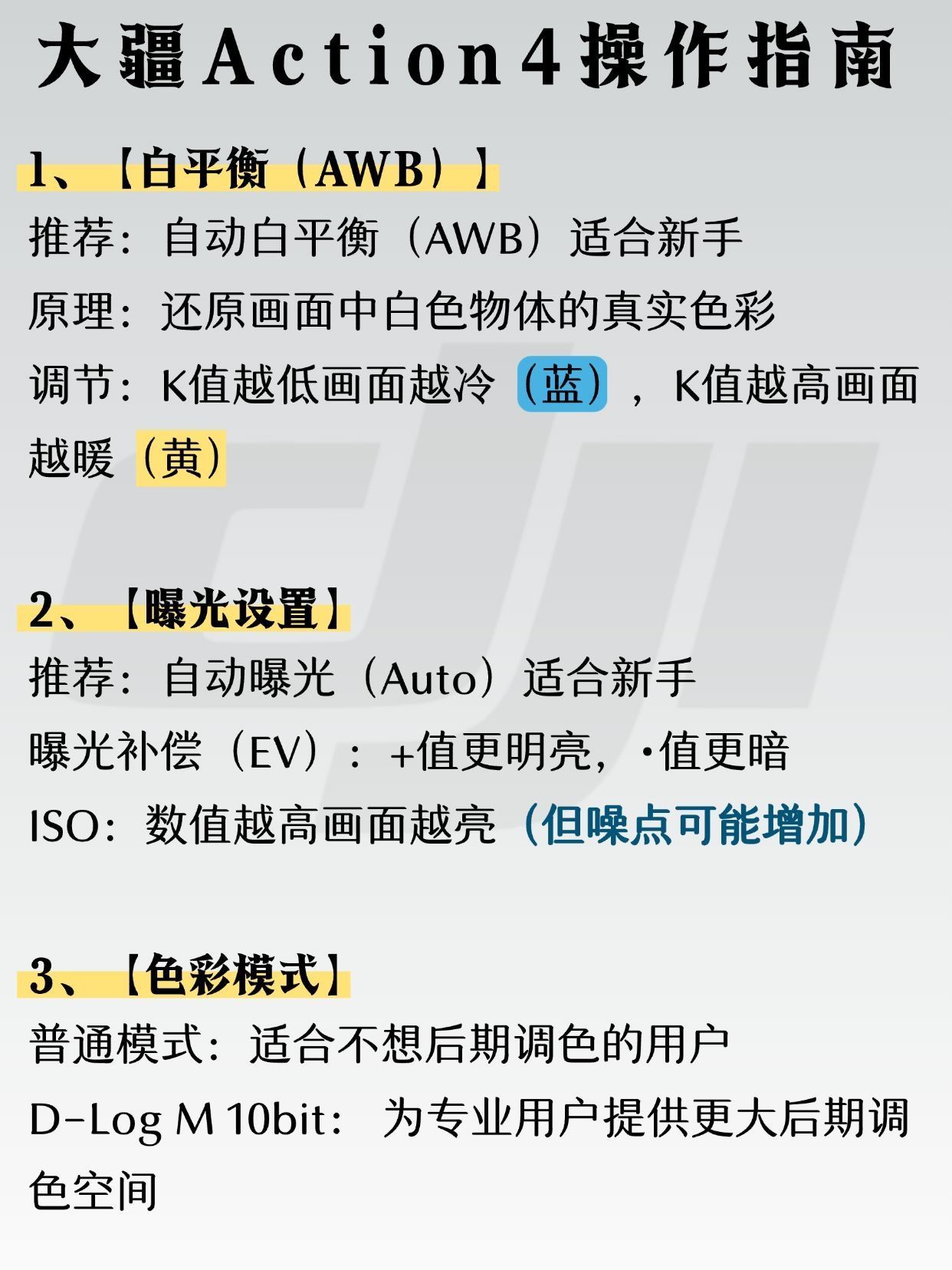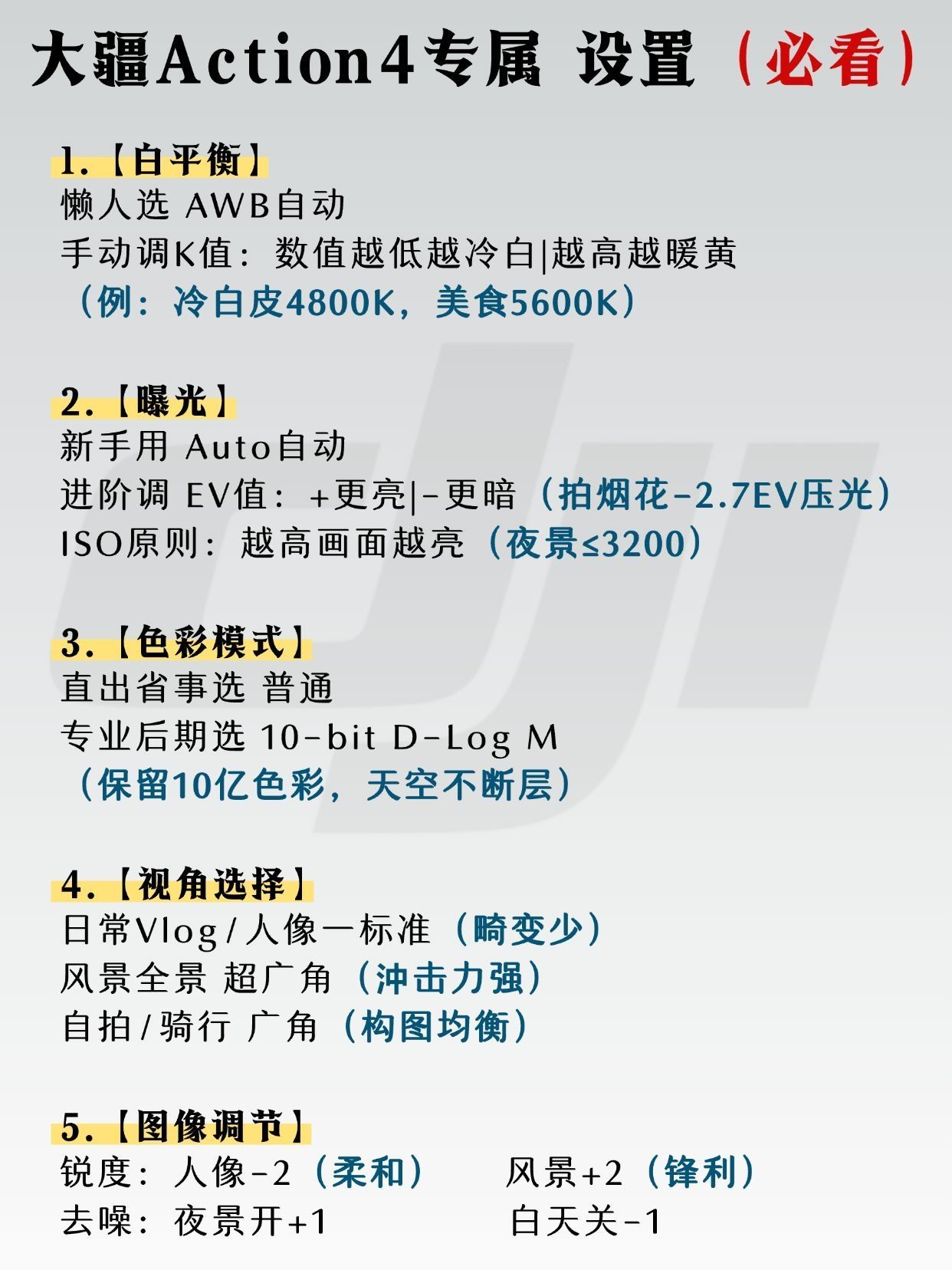 宝子们!谁懂啊!大疆Action 4都快被我盘包浆了,才发现这些超实用的功能! 之前光知道它画质顶,没想到还有这么多隐藏玩法,不会用真的太浪费了! 今天必须给你们整理一份新手快速上手指南,照着调,小白也能轻松出大片! 📸 核心参数抄作业 直接照着调,告别参数纠结症! • 传感器:1/1.3英寸大底真不是盖的! 暗光拍摄噪点少,夜拍直出都很清晰。 进光量比前代多70%,这点太爱了! • 色彩模式:选...
