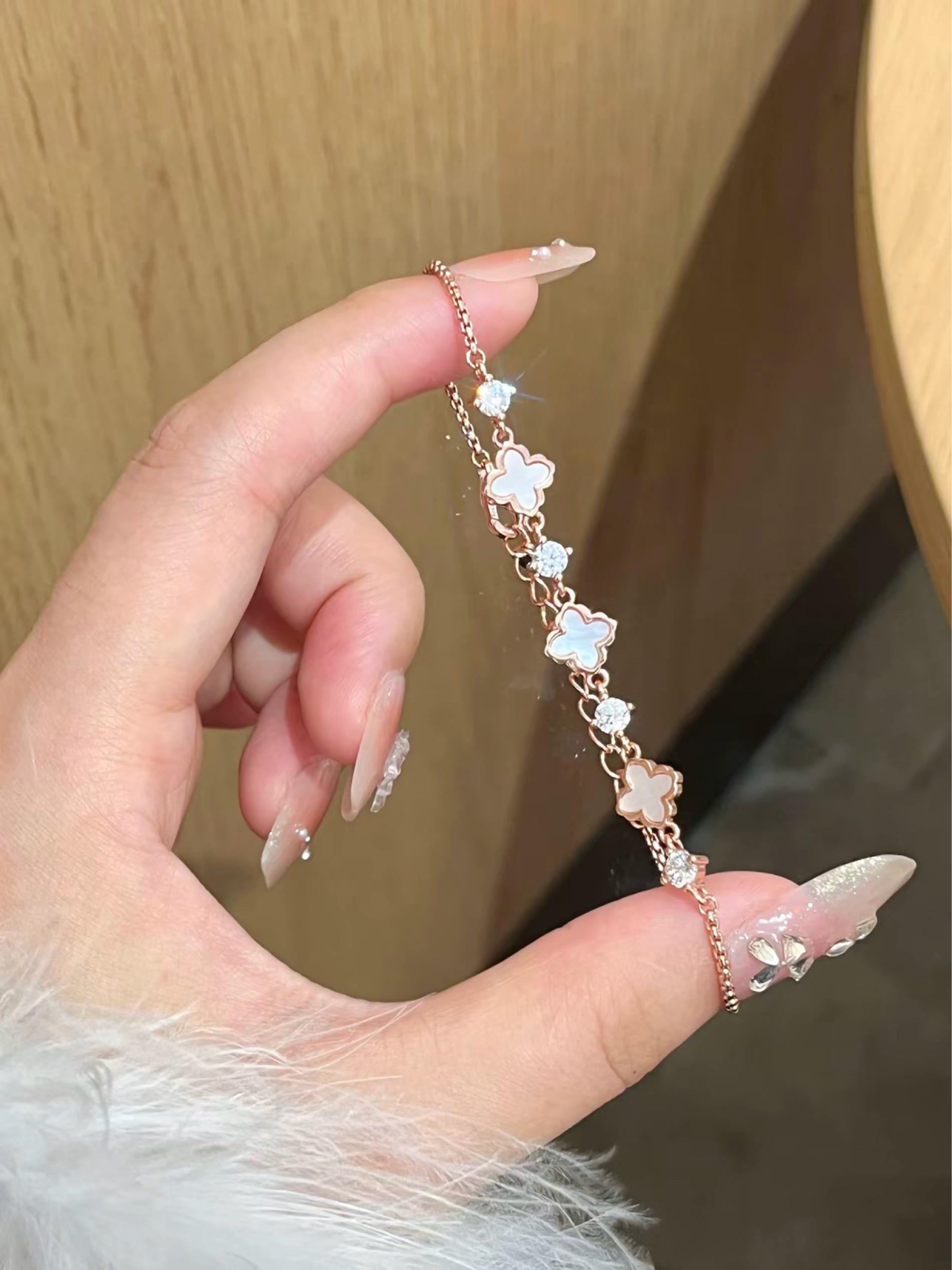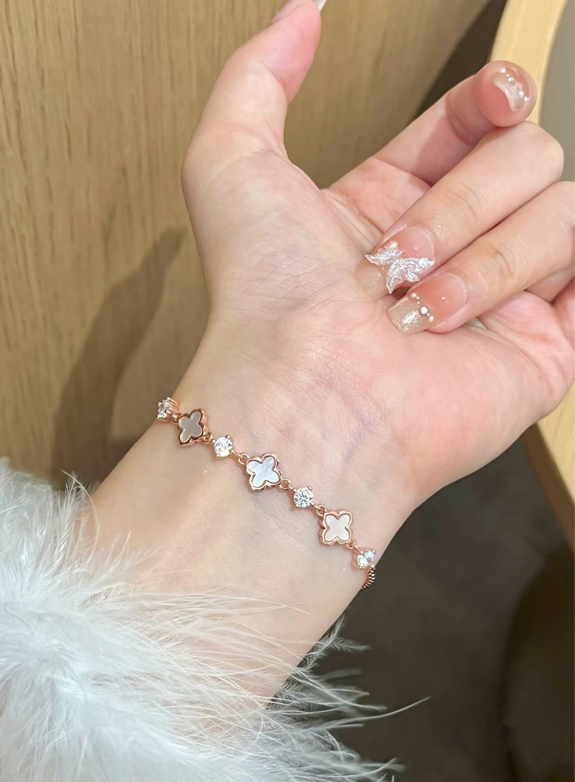 闪闪不掉色的手链被我找到咯 香槟金色很有富家千金感 经典四叶草造型 镶嵌布灵布灵的锆石✨ 你们觉得是搭配毛衣还是卫衣更好看呢