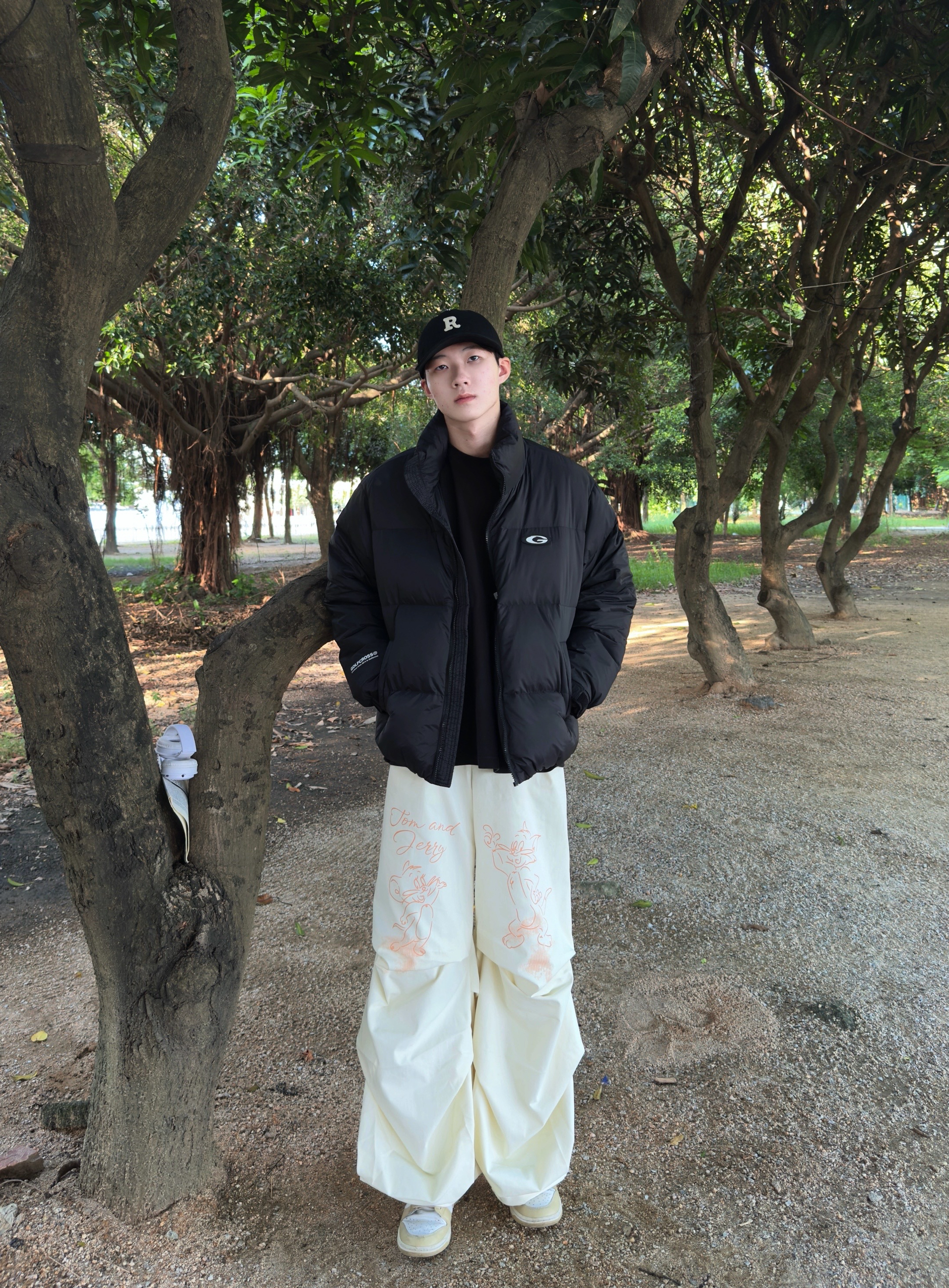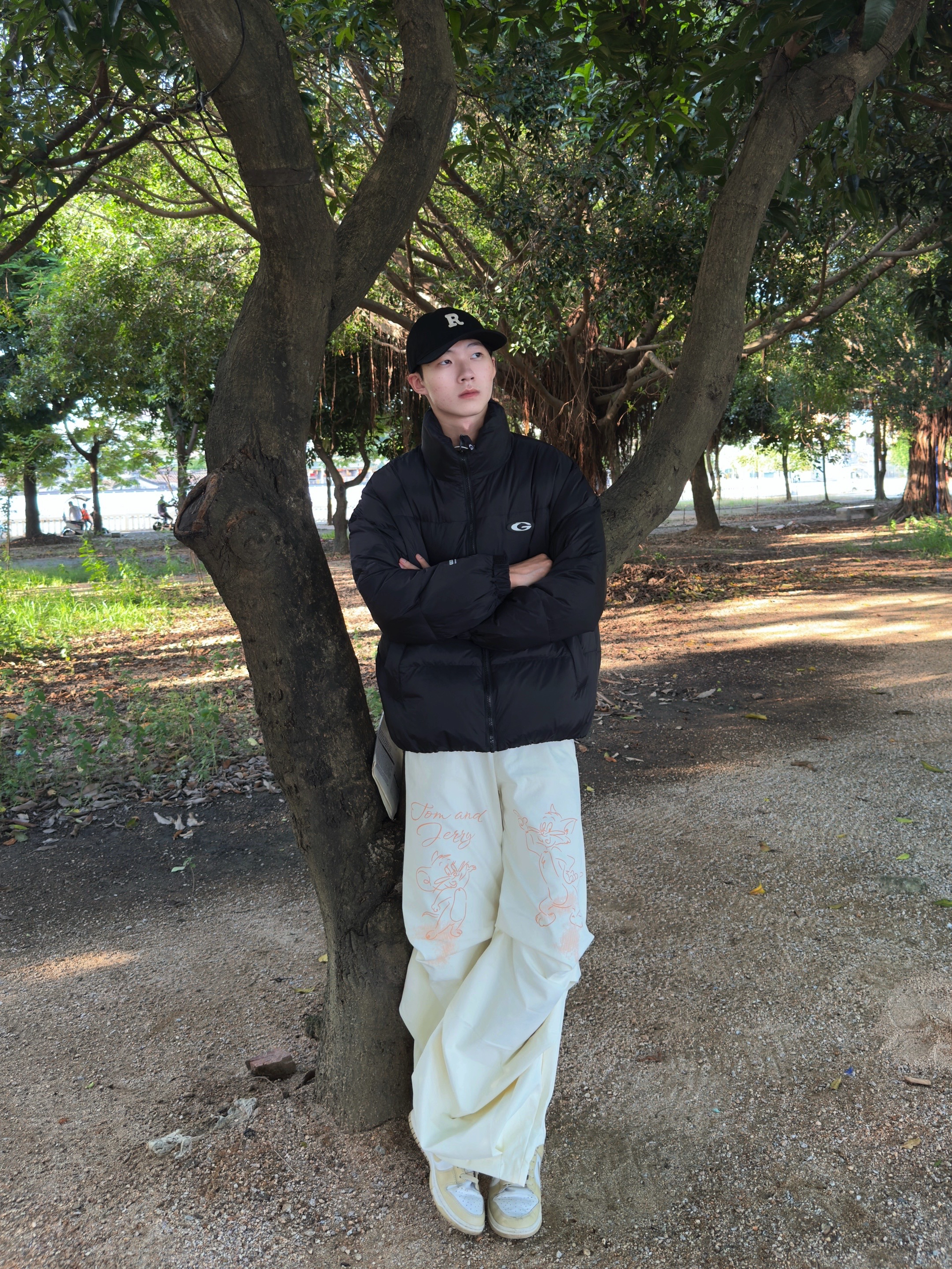 黑色立领羽绒服像面包一样软fufu~ 搭配白色阔腿裤清爽又松弛 黑白碰撞超有层次感 保暖不臃肿 走路带风❄️