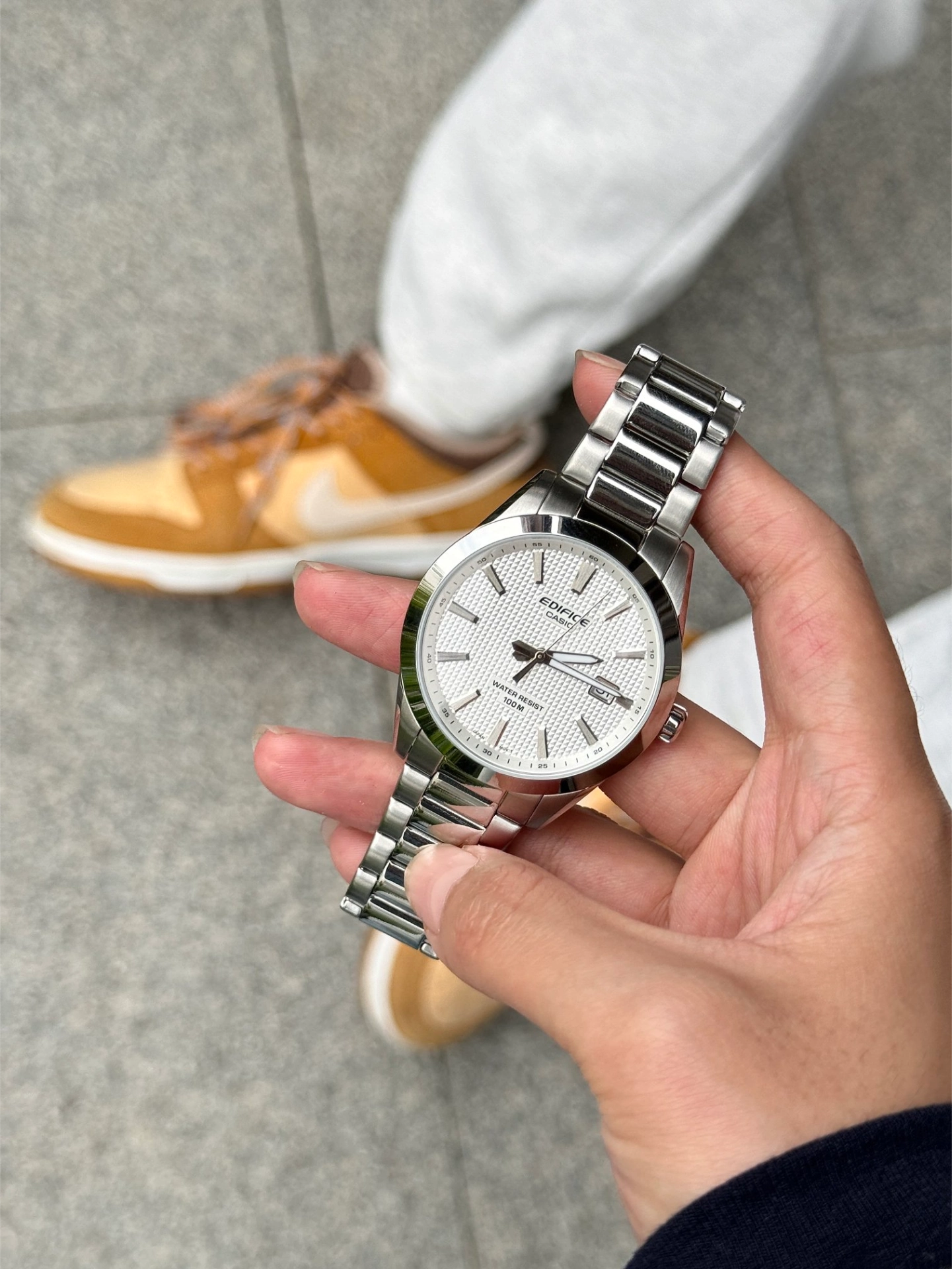 这手表我戴好久了 最近出门不管穿啥, 我手腕上都得戴着这块卡西欧。 40 毫米的不锈钢表壳, 戴着手感挺舒服, 也不会显得笨重。 平时洗手、 下雨啥的也不怕, 100 米防水还挺实用。 三针加日期显示, 看时间看日期都清楚。 我现在已经习惯戴它了, 没戴就总觉得少点东西。