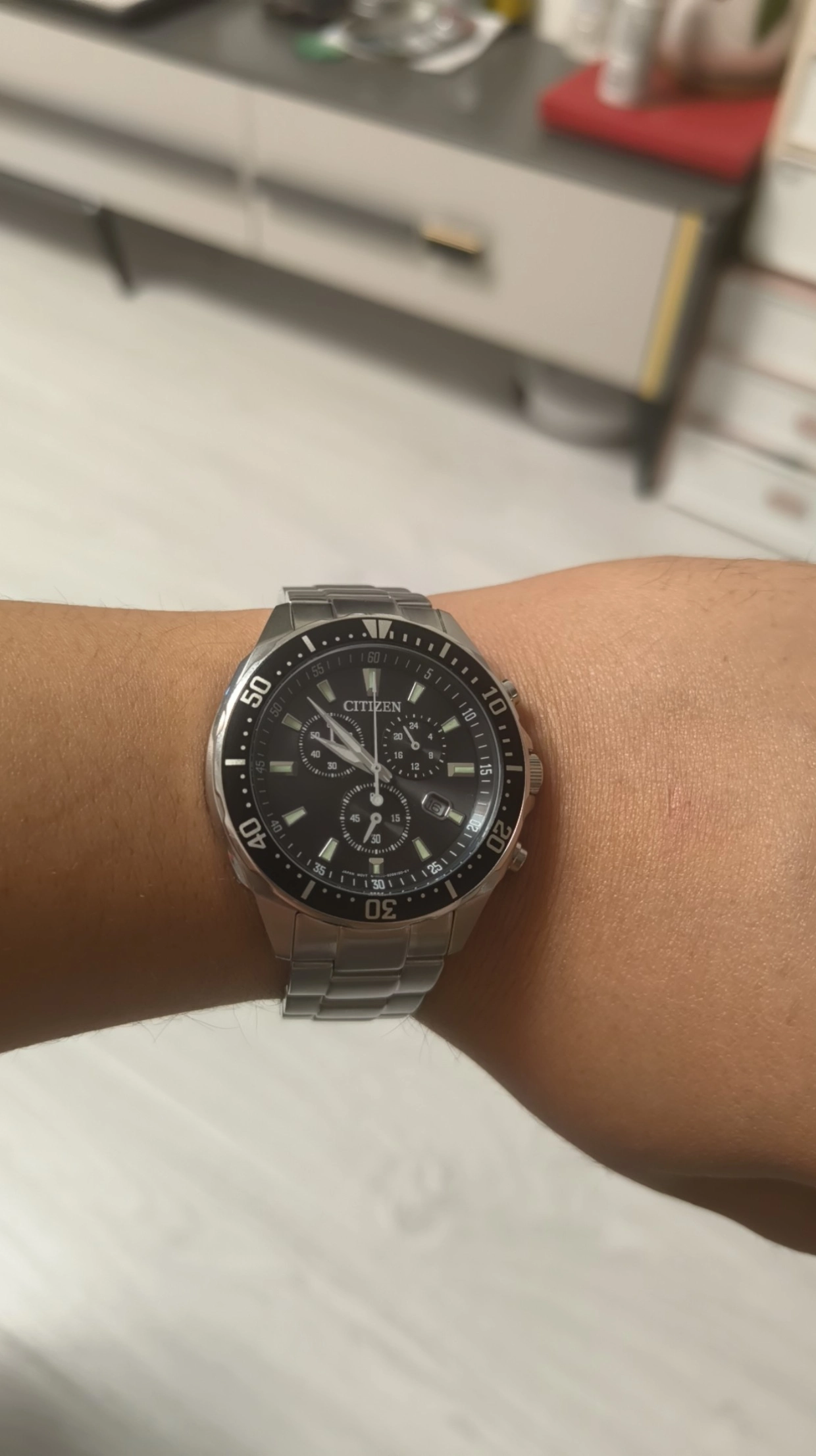 我很喜欢这块表的颜值,圆形表盘配钢带,日常搭正装挺合适~ 收了一个多月才下手