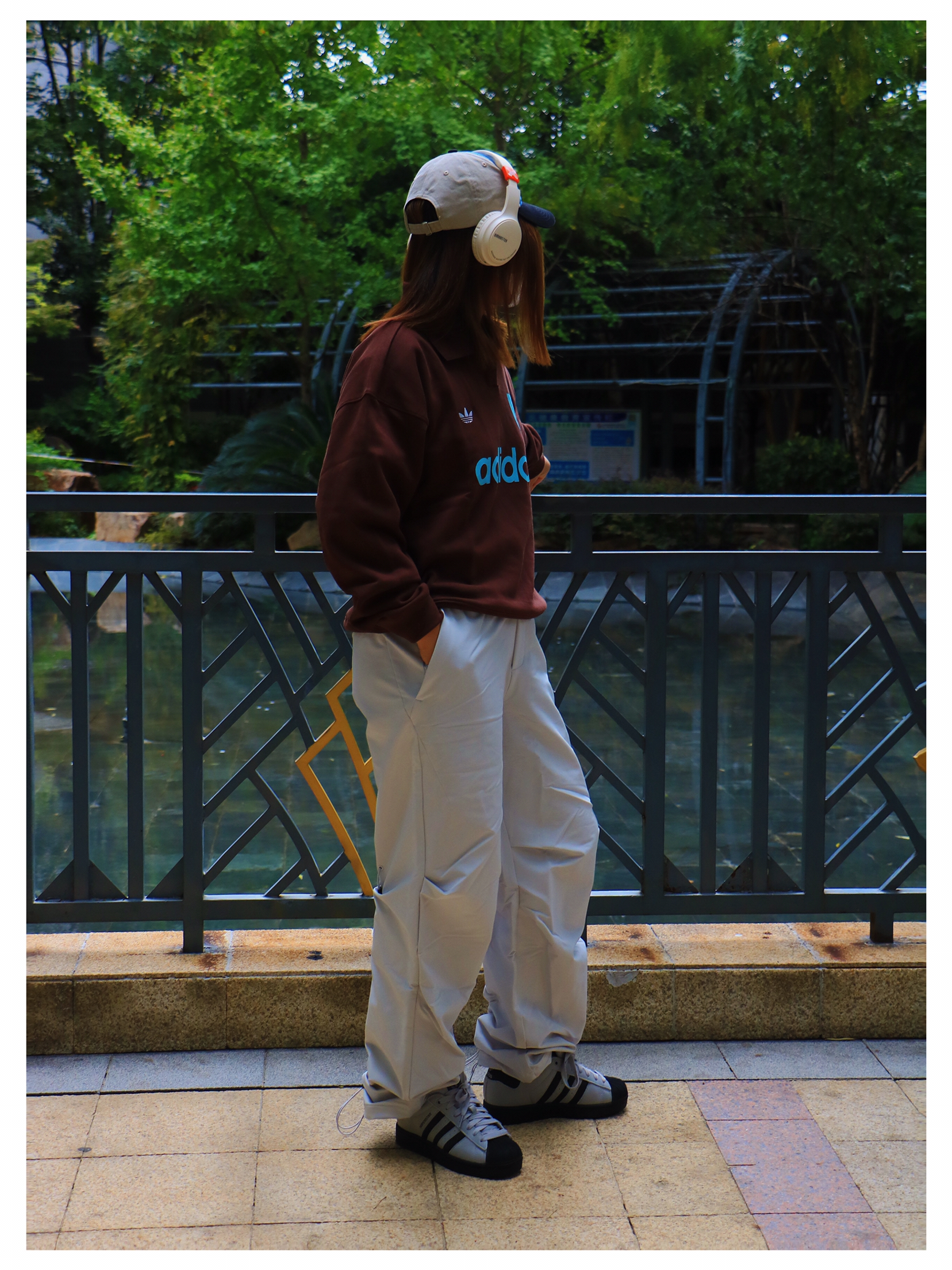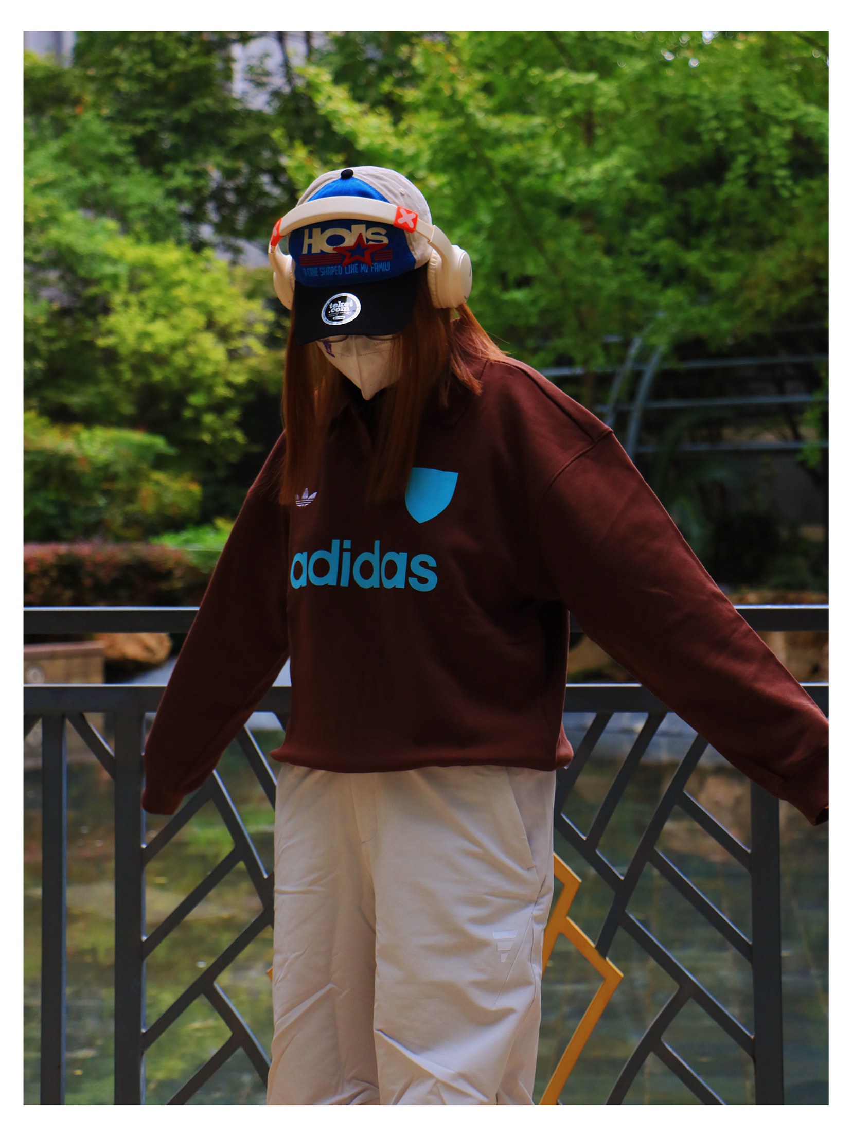 休闲舒适户外运动风穿搭 上衣:adidas 字母印花 长袖卫衣 裤子:adidas 户外风束腿休闲裤 鞋子:adidas 户外风贝壳头板鞋