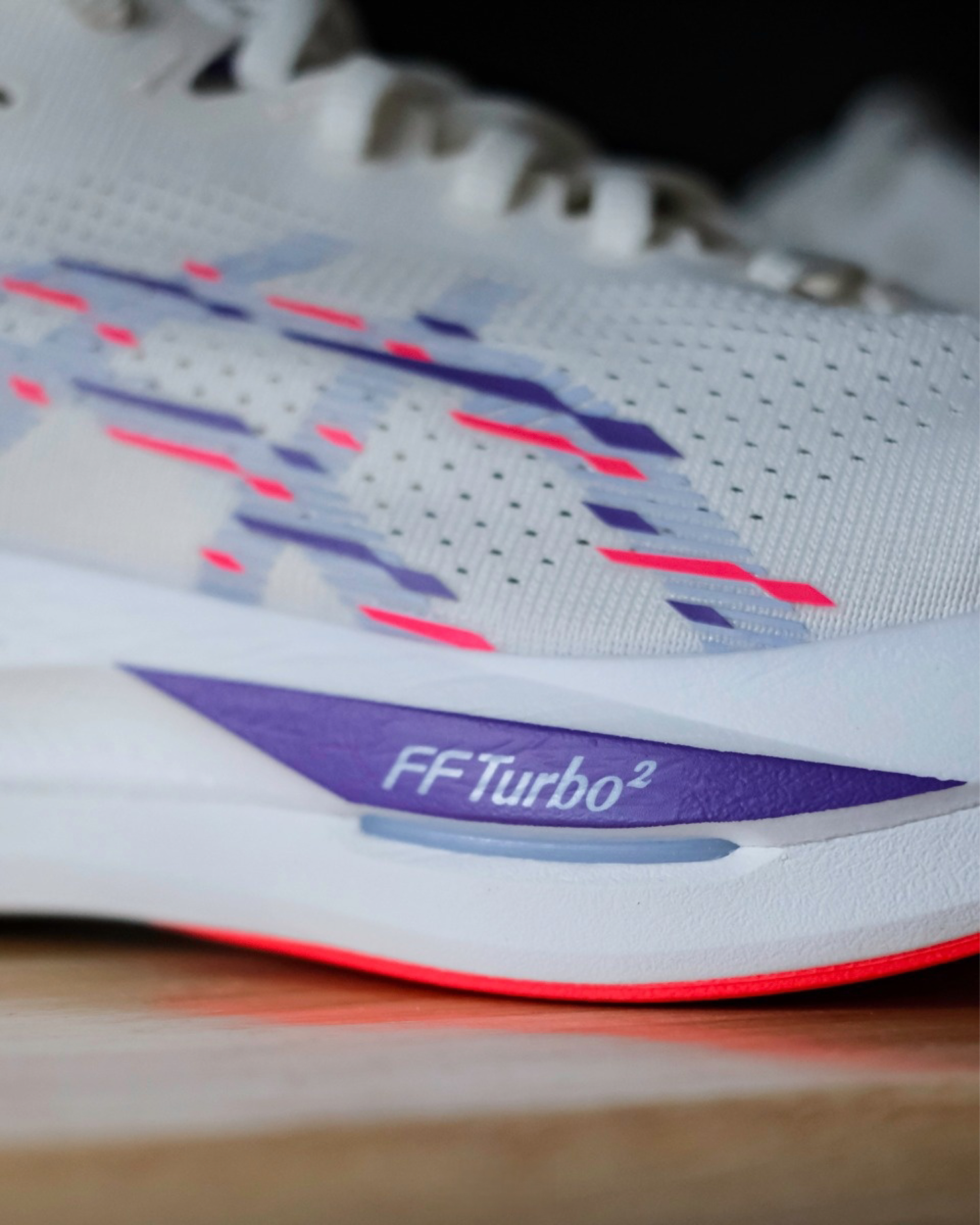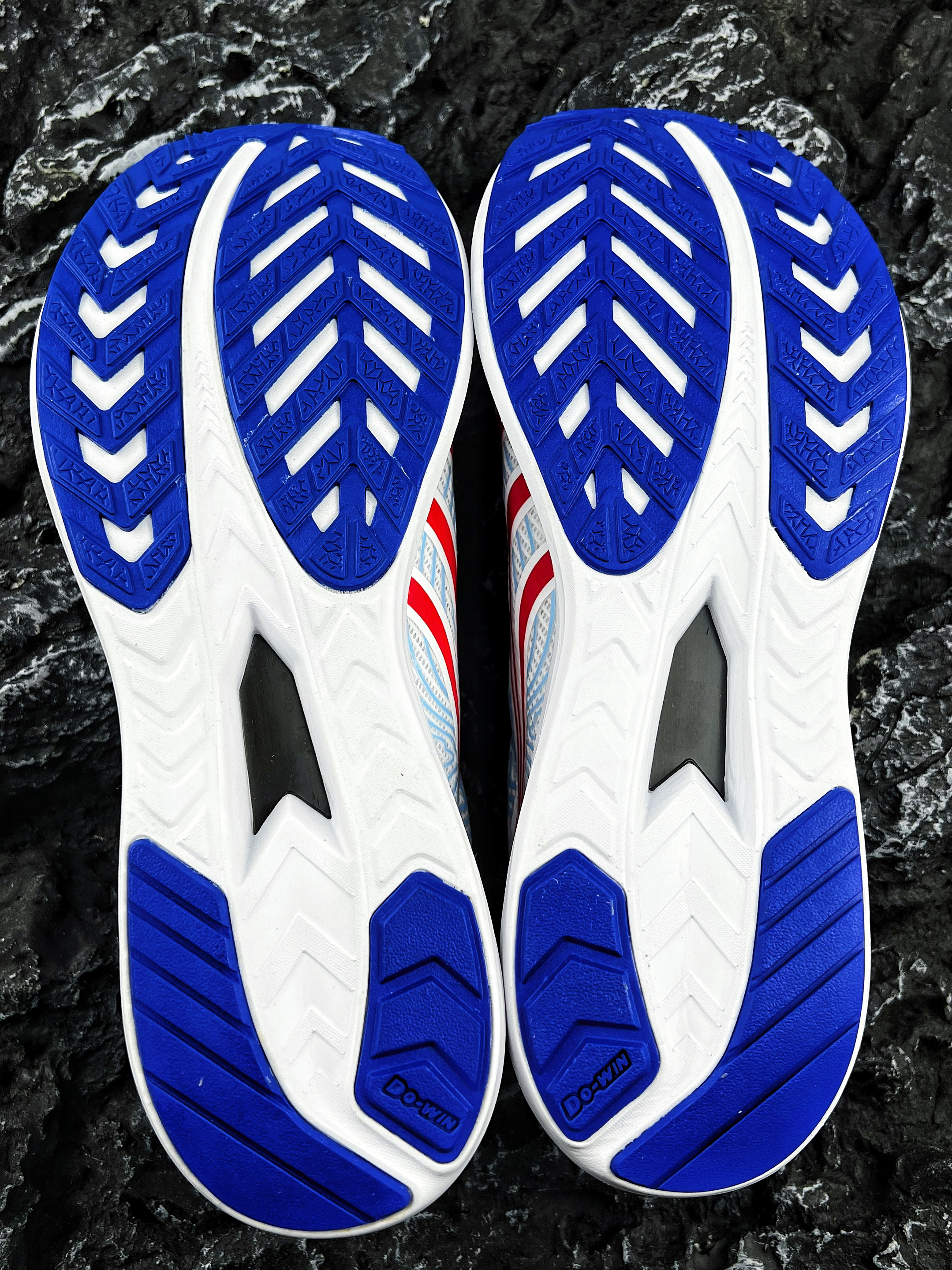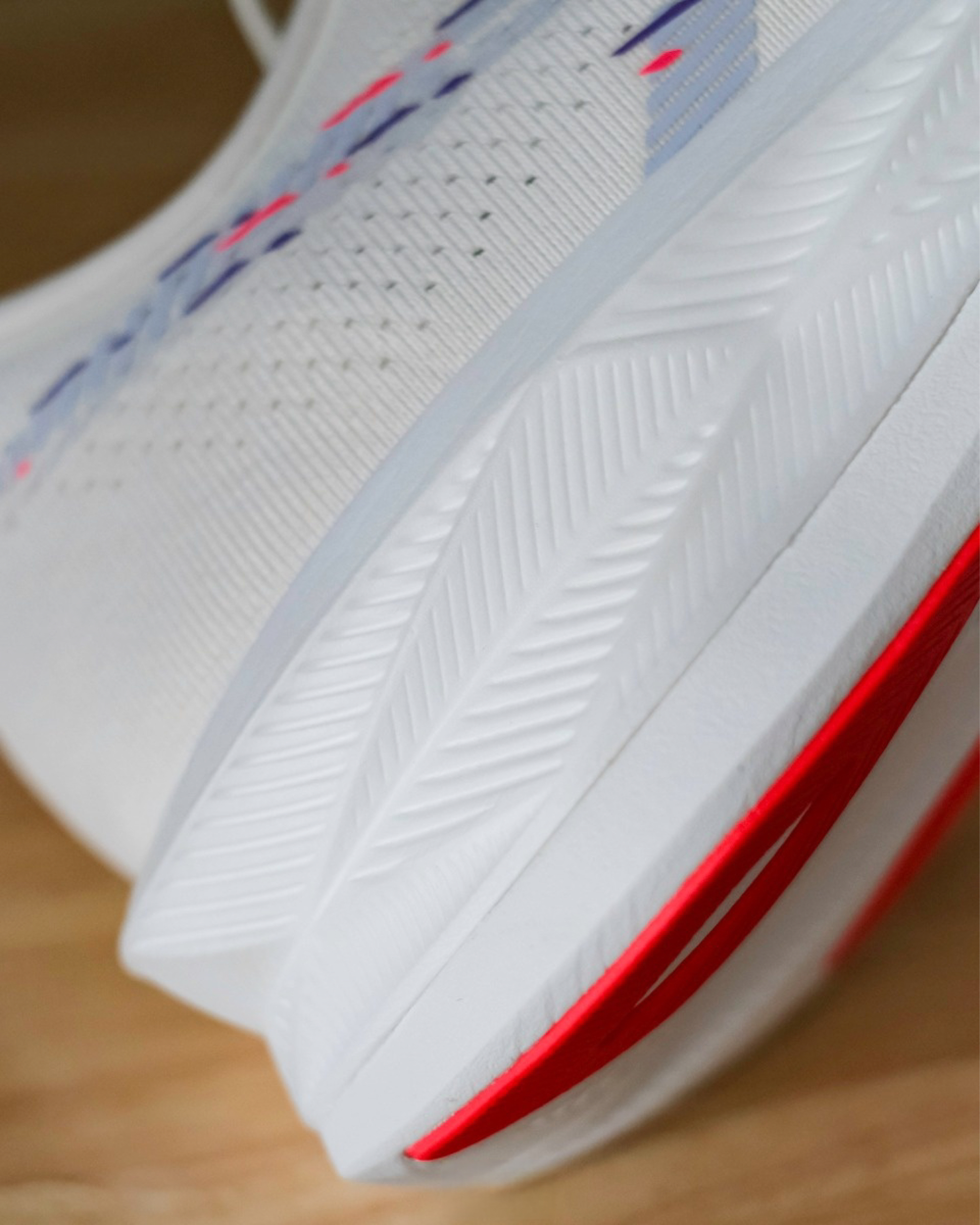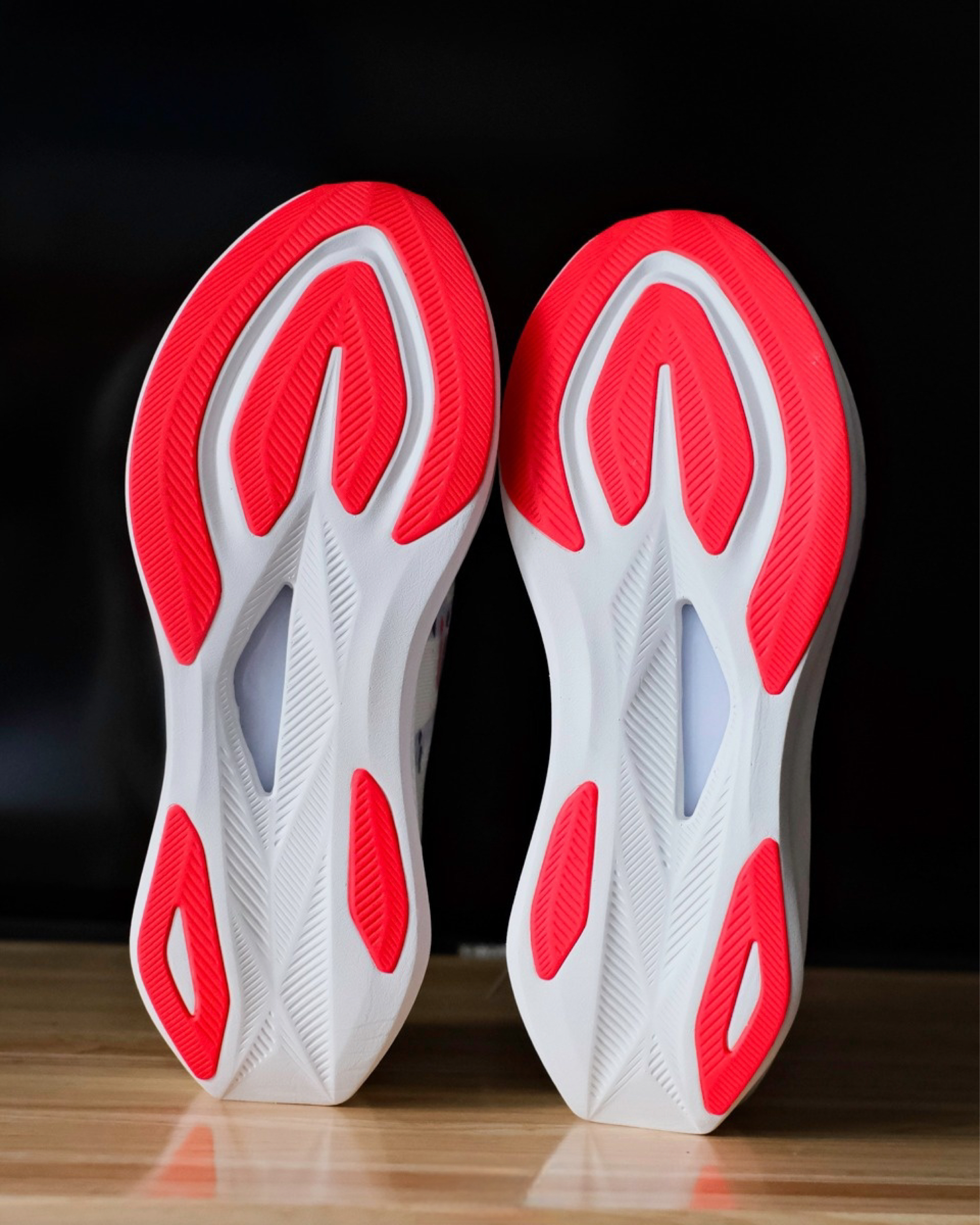初穿这双ASICS时,其所采用的SONICBLAST 中底双层设计我就印象深刻。上层搭载 FF TURBO²,带来明显的弹性回馈;下层则是 FF BLAST MAX,提供柔弹舒适的缓震脚感,并采用ASTROPLATE 推进板(注意!不是碳板)。 这样的组合让脚感升级,不仅减缓了冲击,也保留了推进的力量。鞋跟差落在 8mm,比起纯竞速鞋更自然,让步伐得以更稳定自然,不过度发力。 此外,ASICS GRIP 大底兼具抓地力与耐磨度,在不同路况下都蛮稳定的。 有朋友会与 ASICS Magic Speed 4去相比,我觉得两者在脚感上确实有些相似,可能来自相近的中底配置。但Magic Speed 4 采用全掌碳板,推进感更直接;SONICBLAST 更软、更弹,缓震充足且硬度适中,能给关节更多保护与缓冲,更适合长时间训练使用。