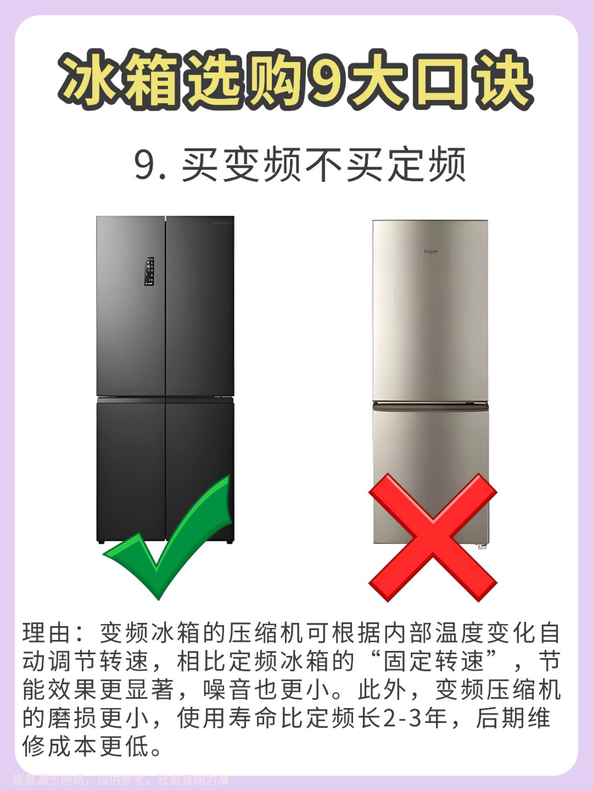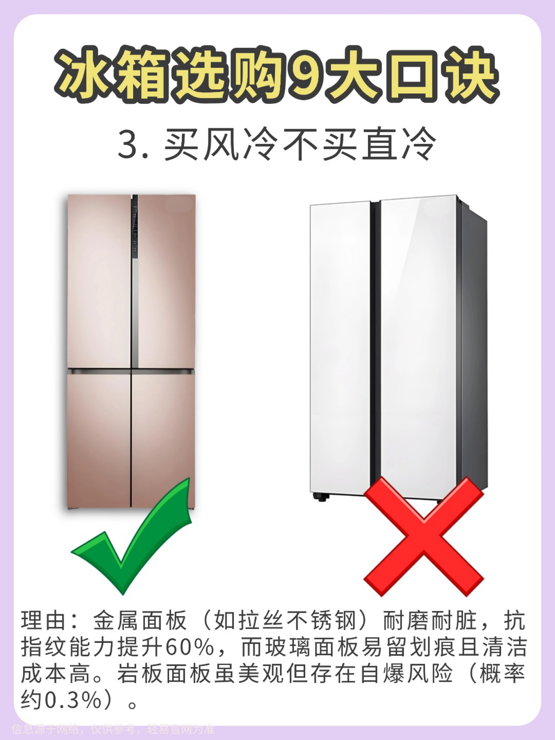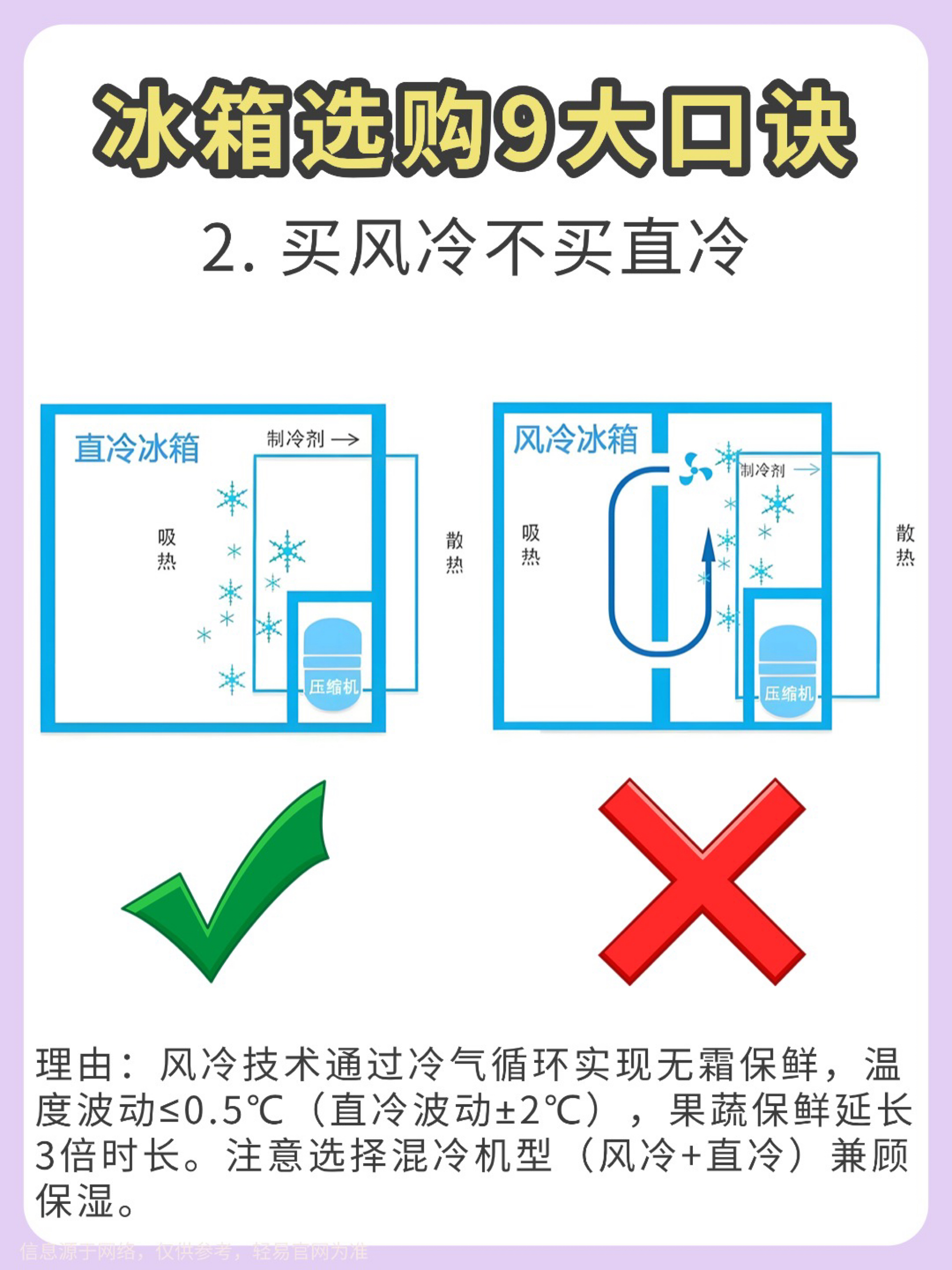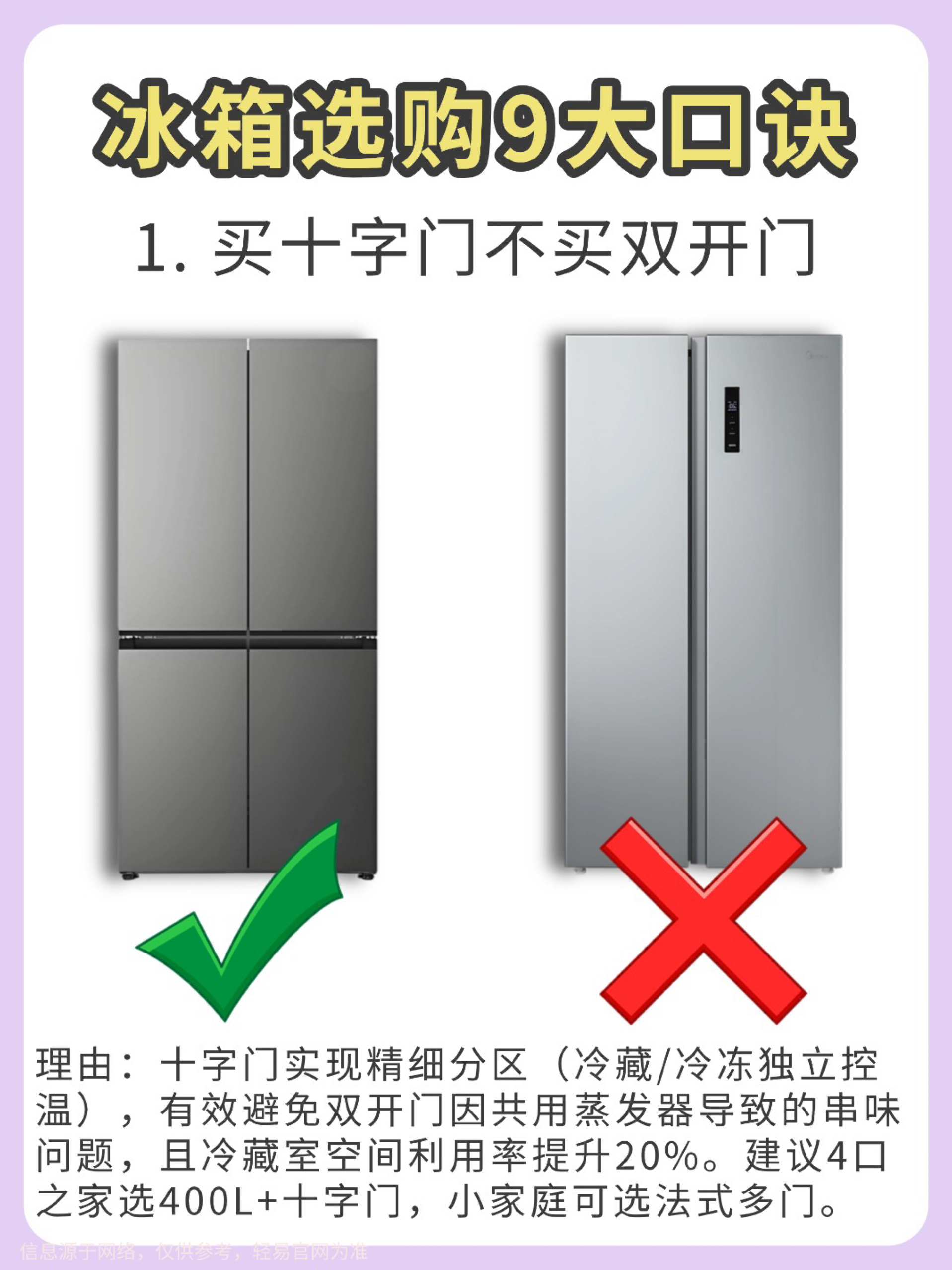 【冰箱选购避坑指南】宝子们选冰箱真的不能只看颜值! 试了几款才发现门型、制冷方式这些细节太重要了💡 以下是我总结的9个选冰箱的重点,希望能帮到你: 1️⃣ 冰箱门 ❌ 对开门:制冷耗电多,容易串味,但容量大,适合喜欢囤货的人。 ✅ 十字开门:更省电,分区清晰,还能防止串味,适合不同食材的分格存放。 2️⃣ 制冷方式 ❌ 直冷式:容易结霜,温度分布不均匀,制冷速度慢。 ✅ 风冷式:不容易结霜,温度均...