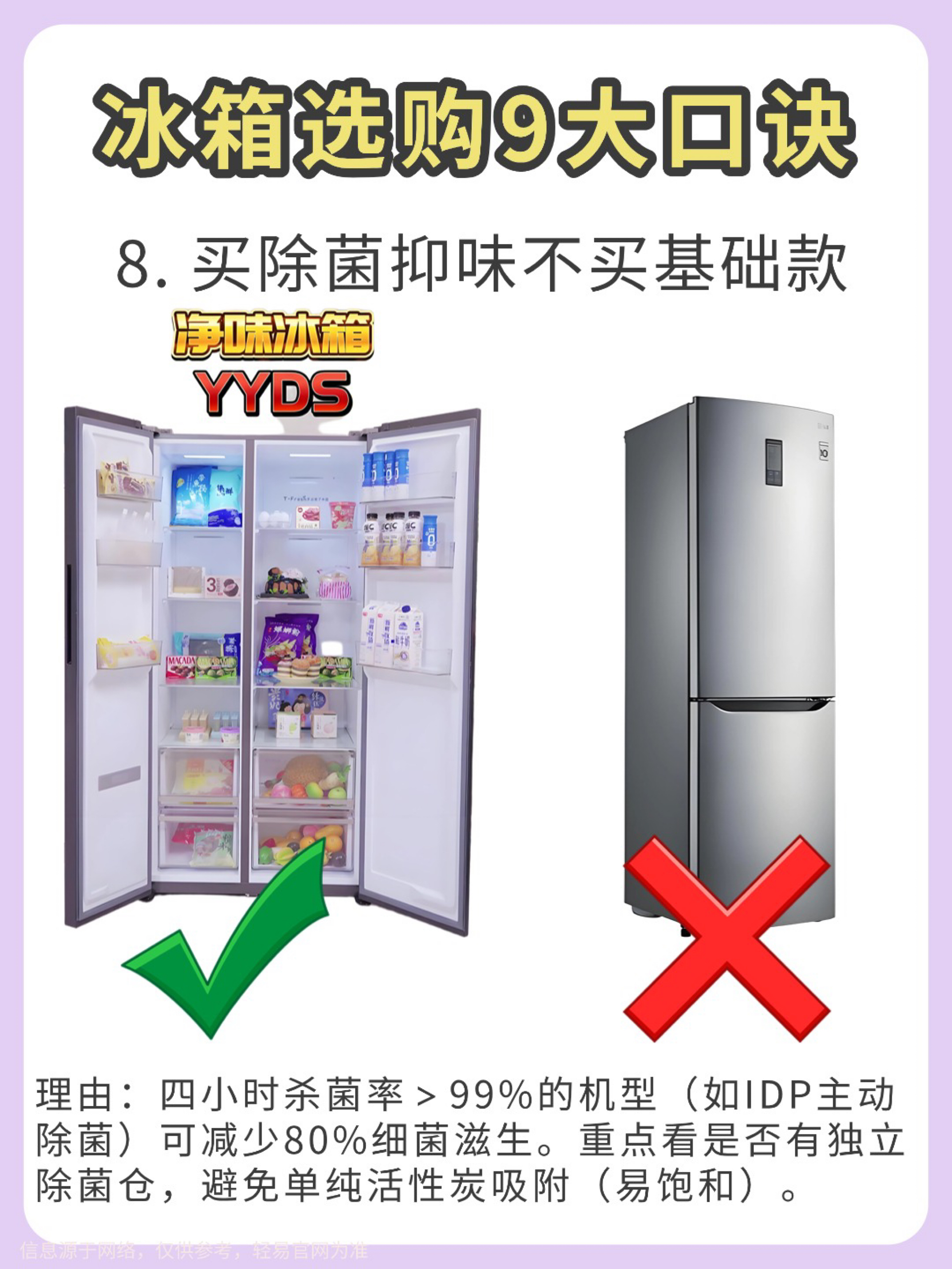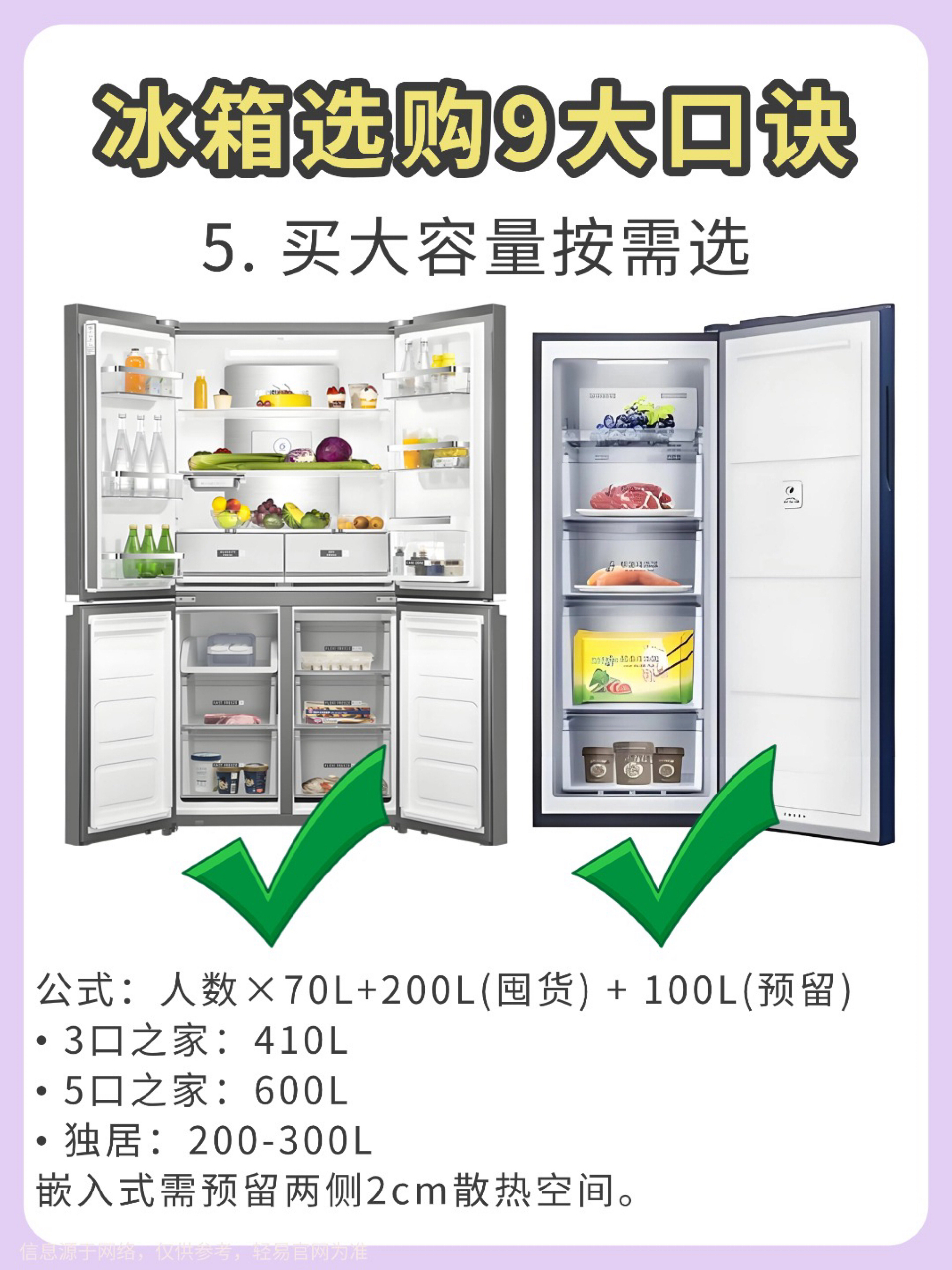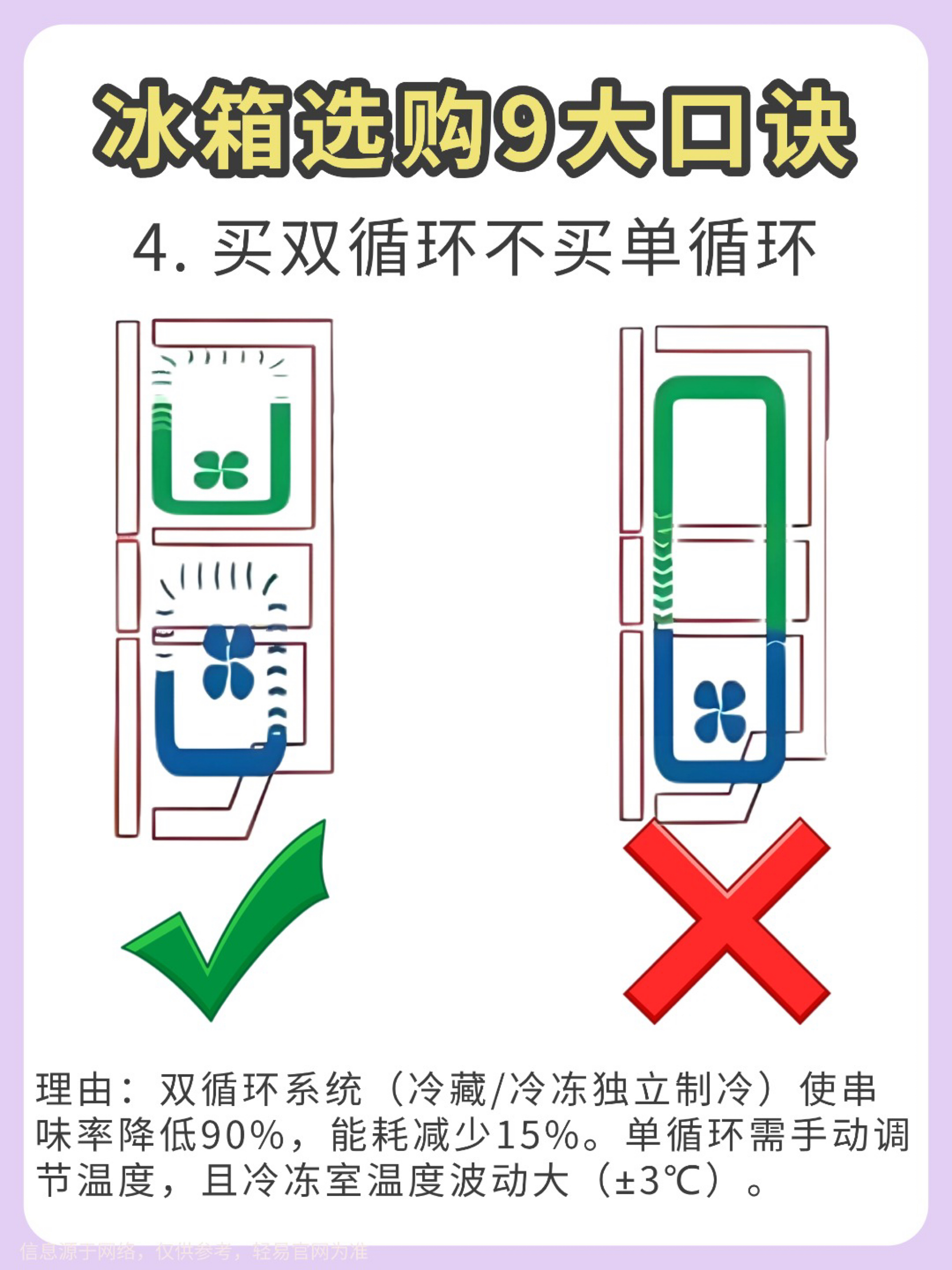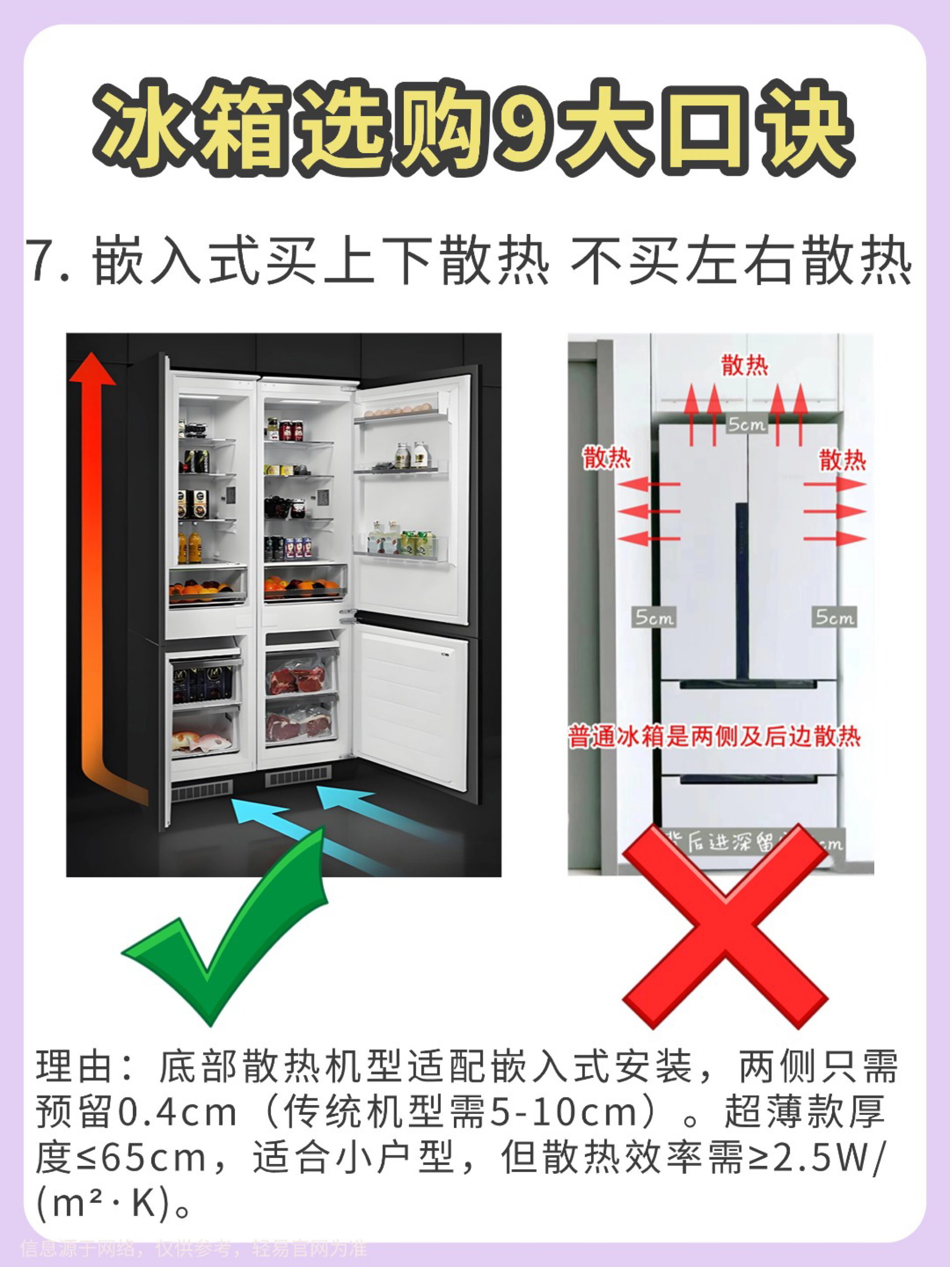 【冰箱选购避坑指南】宝子们选冰箱真的不能只看颜值! 试了几款才发现门型、制冷方式这些细节太重要了💡 以下是我总结的9个选冰箱的重点,希望能帮到你: 1️⃣ 冰箱门 ❌ 对开门:制冷耗电多,容易串味,但容量大,适合喜欢囤货的人。 ✅ 十字开门:更省电,分区清晰,还能防止串味,适合不同食材的分格存放。 2️⃣ 制冷方式 ❌ 直冷式:容易结霜,温度分布不均匀,制冷速度慢。 ✅ 风冷式:不容易结霜,温度均...