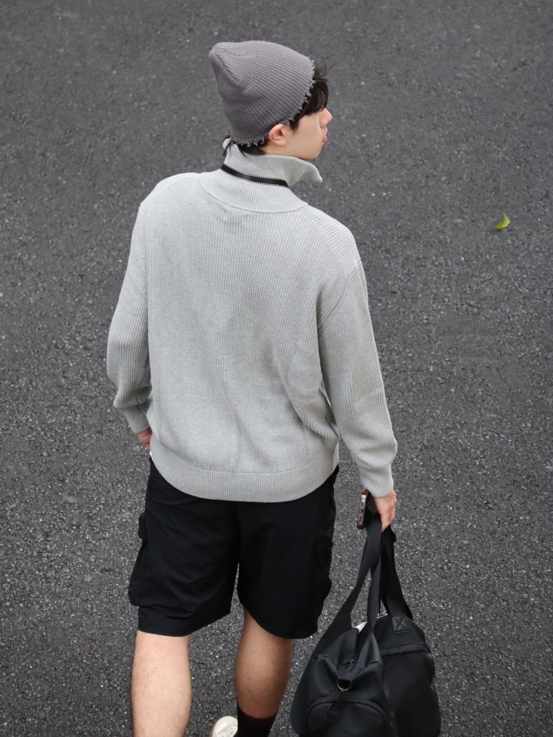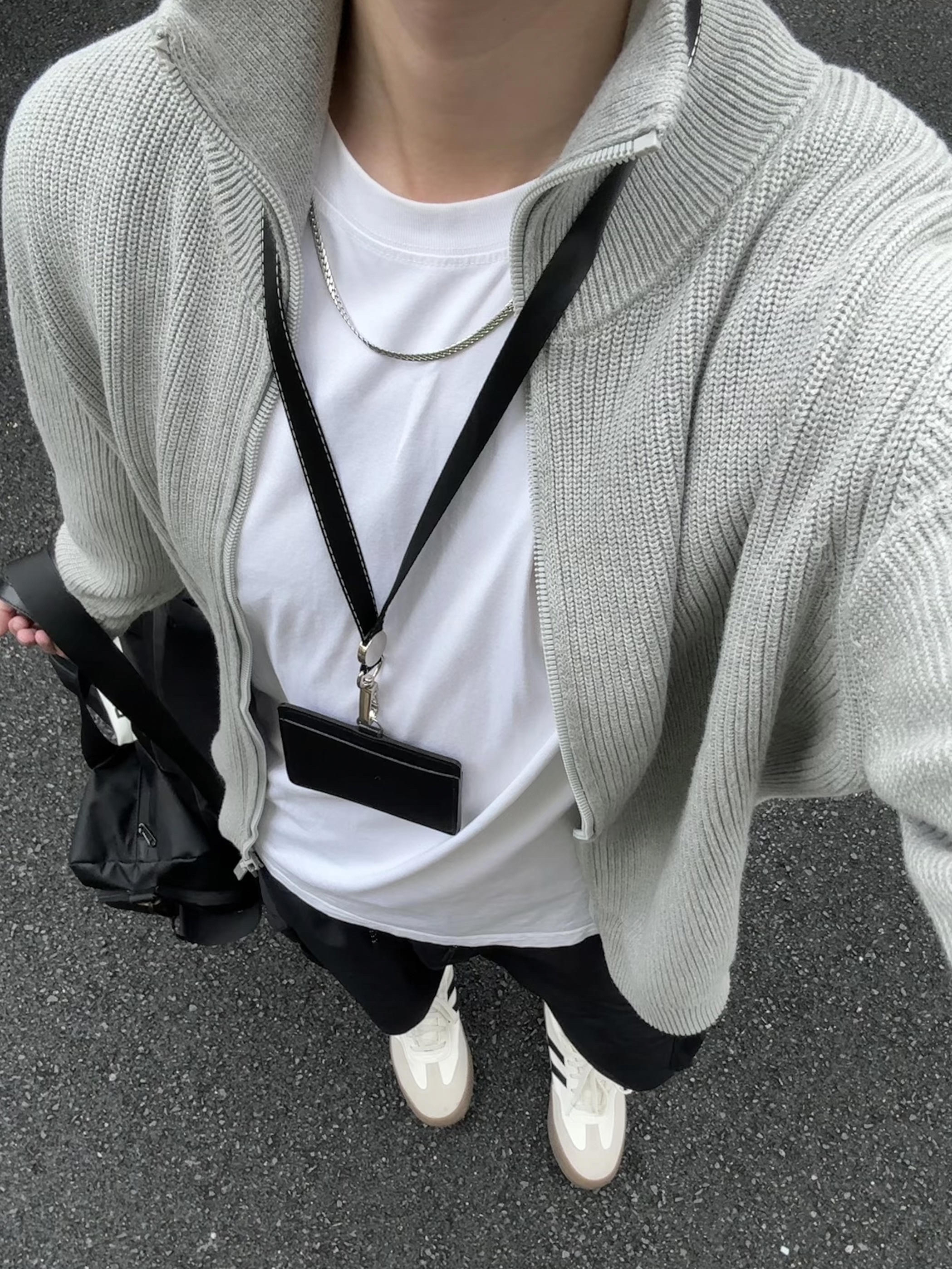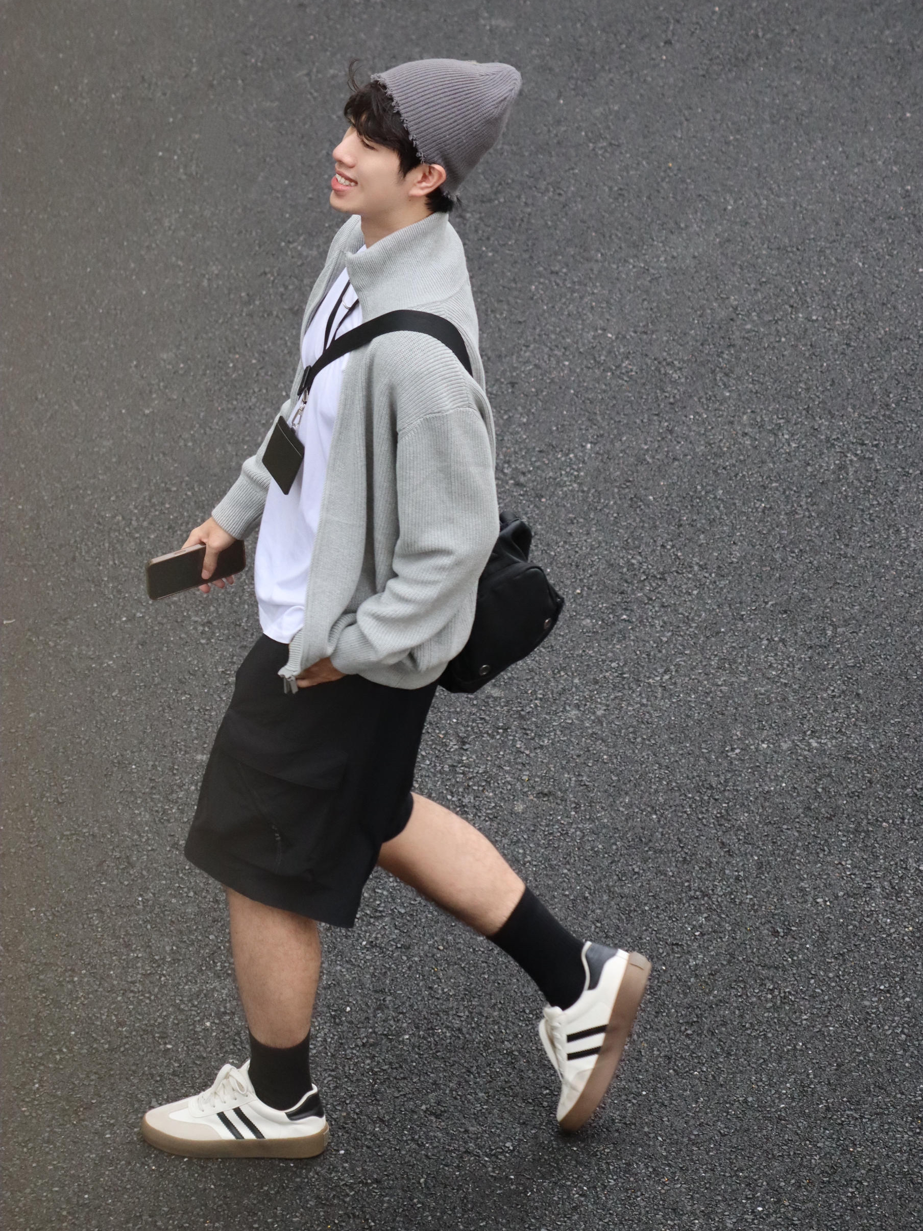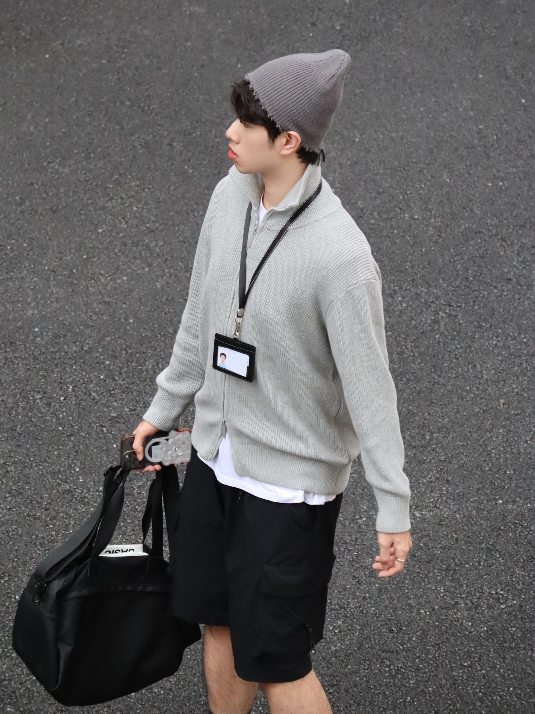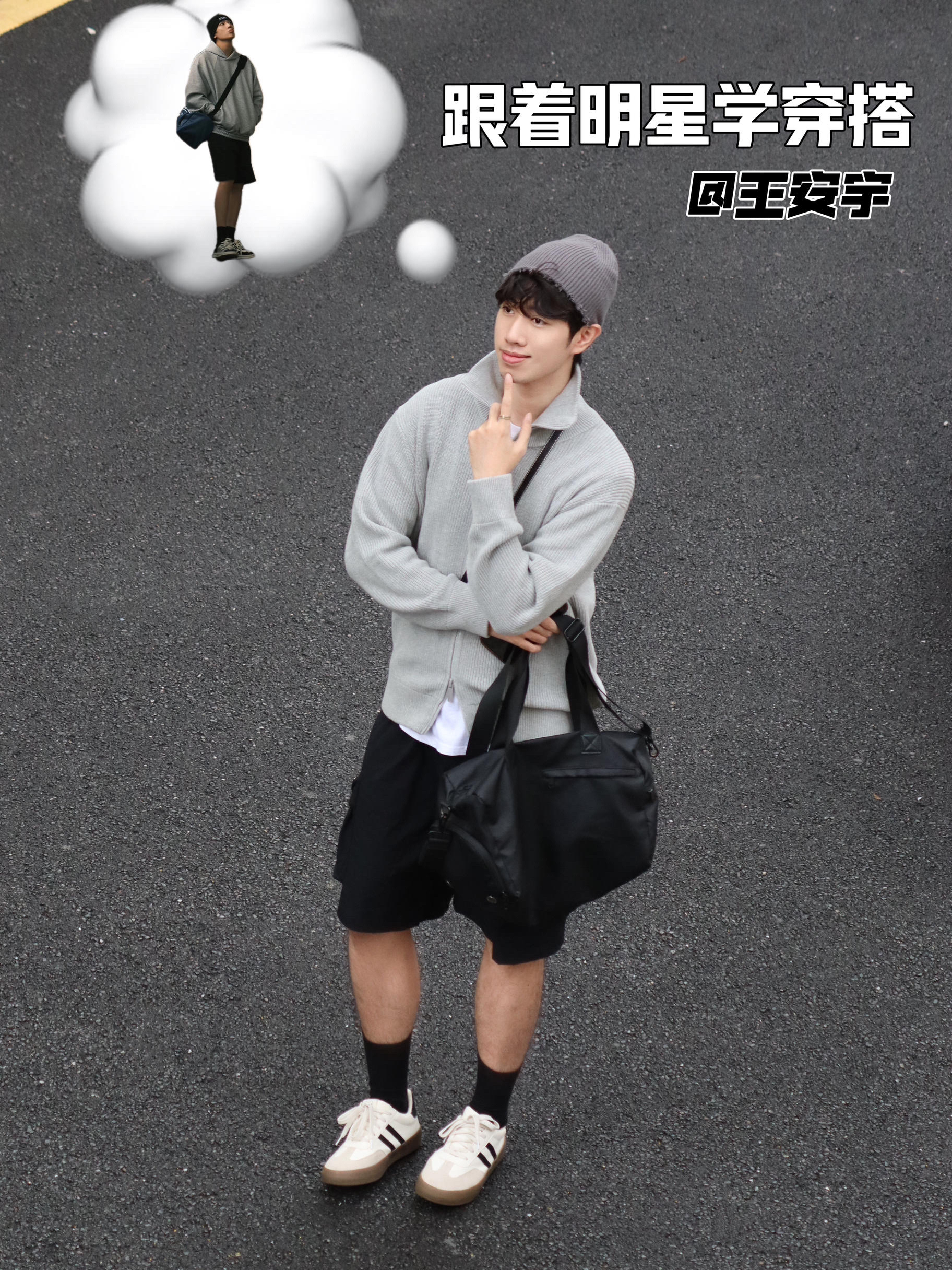 🧍♂️跟着王安宇学穿搭,黑灰白一键上身💥静默复古风焊身上,出街秒变行走的穿搭模板😃 👔上衣:浅灰色立领针织开衫叠穿白色内搭,层次感MAX‼️针织的质感也不戳🩶内搭的白T是穿搭的“万金油”,叠穿在里面让整体造型更有层次‼️ 🩳下装:黑色工装短裤,口袋设计潮酷又实用🖤宽松的版型对各种腿型友好✅街头vibe 🧢冷帽:边缘的毛边设计细节感拉满,瞬间给造型注入复古灵魂📷