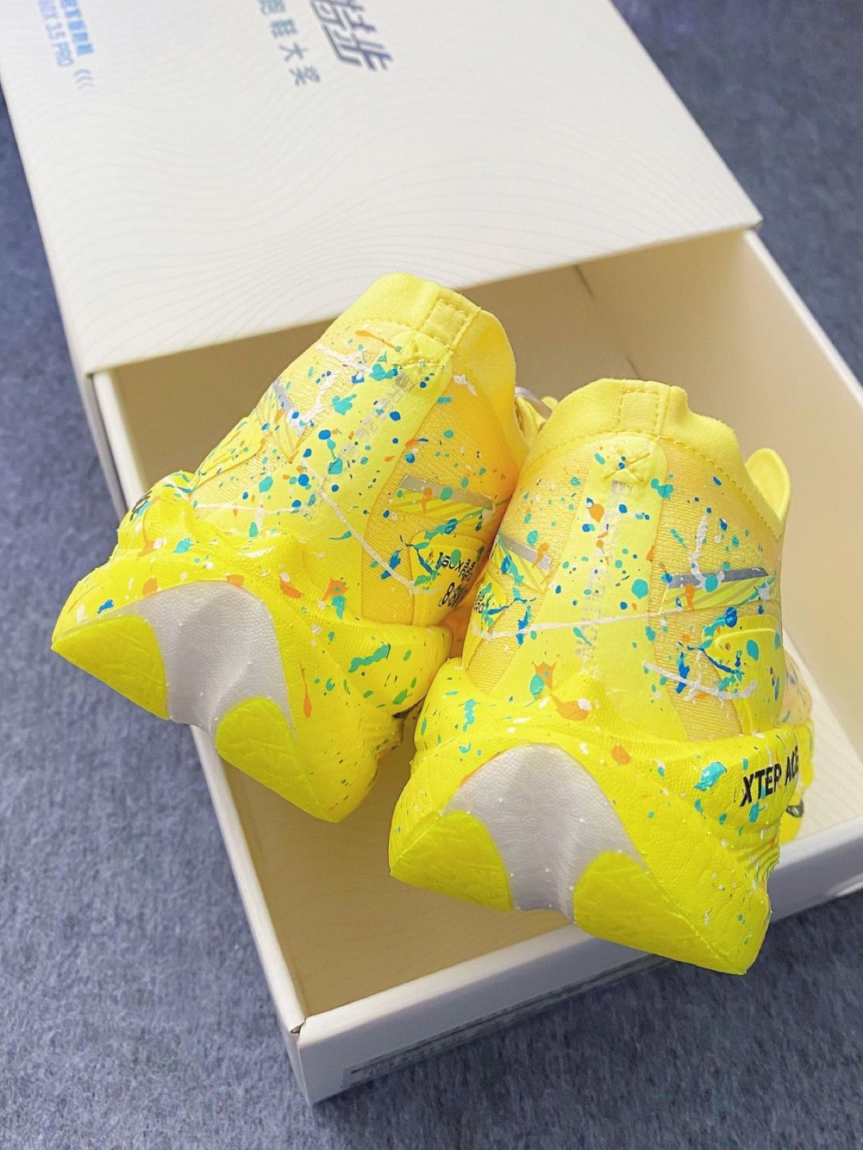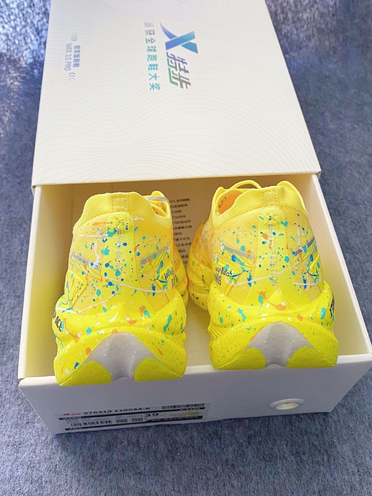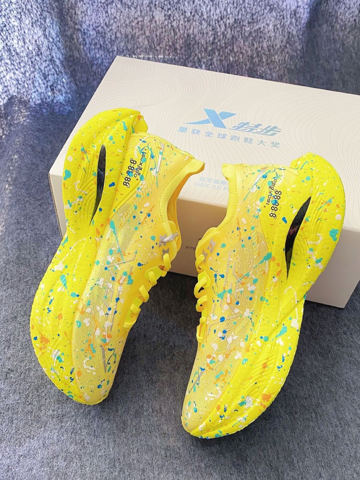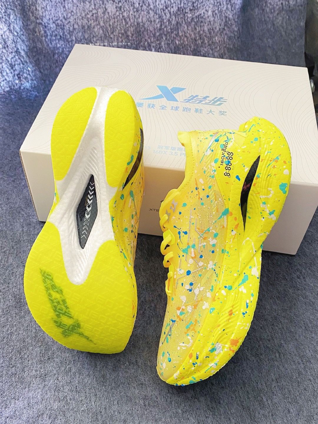 当跑鞋撞上泼墨艺术,特步160X 3.5 PRO化身「竞速界的色彩狂想」。亮黄鞋身泼洒蓝橙白彩点,像把颜料盘踩在脚下;碳板中底+轻弹科技,每一步都迸发“弹射起飞”的快感。日常出街是吸睛炸街款,赛场竞速是破PB的利器,穿上它,让奔跑的每一秒都在创作属于你的速度艺术。