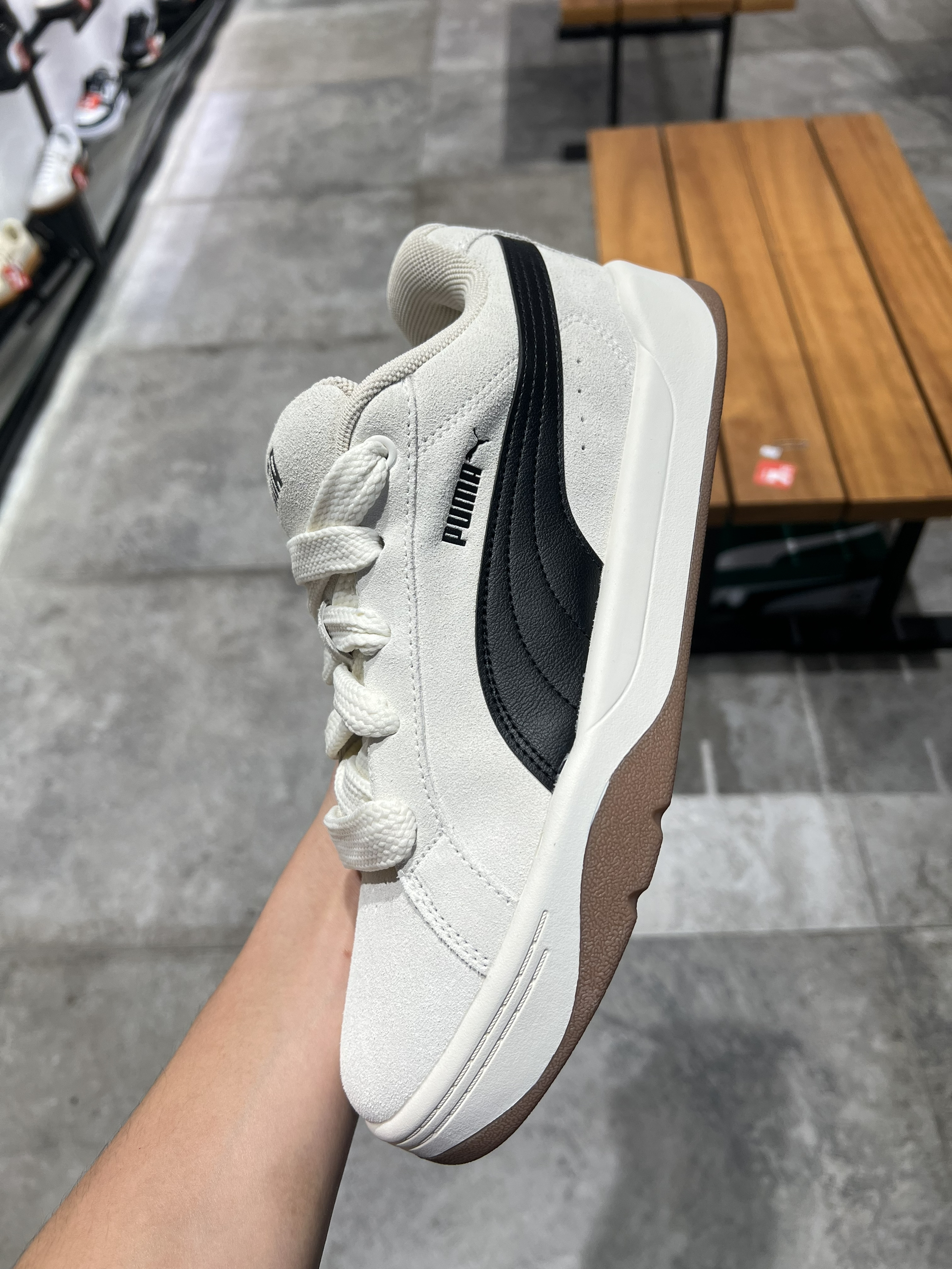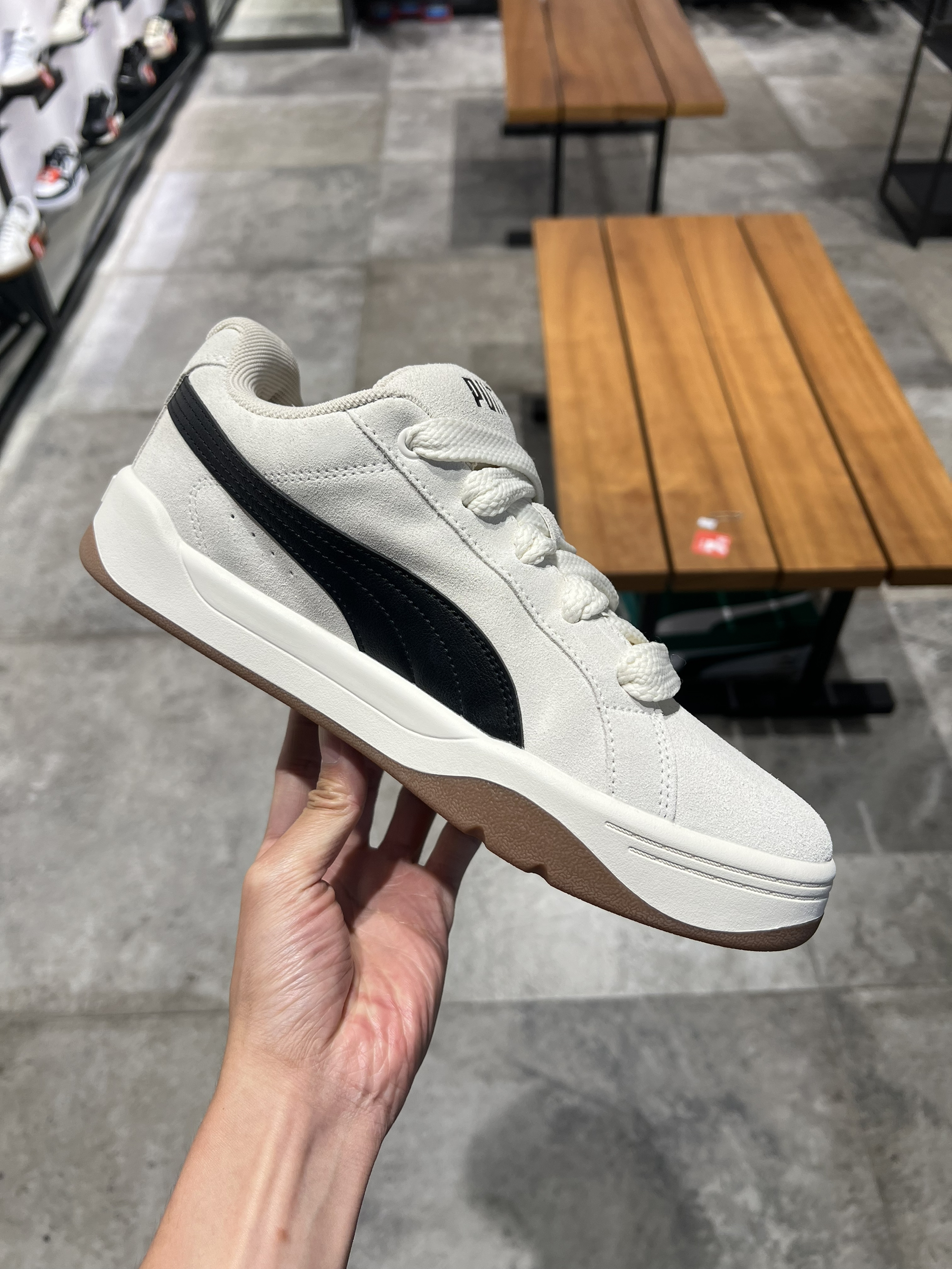 米白麂皮搭配经典黑色跑道线,复古感直接拉满💯 鞋型设计超显脚小,厚底还能悄悄增高,日常搭配牛仔裤、连衣裙都很绝~ 细节也很戳人,加粗鞋带可以解锁多种绑法,后跟的美洲狮Logo和大底的“SEE YOU AT THE PARK”字样,处处都是小心机✨
