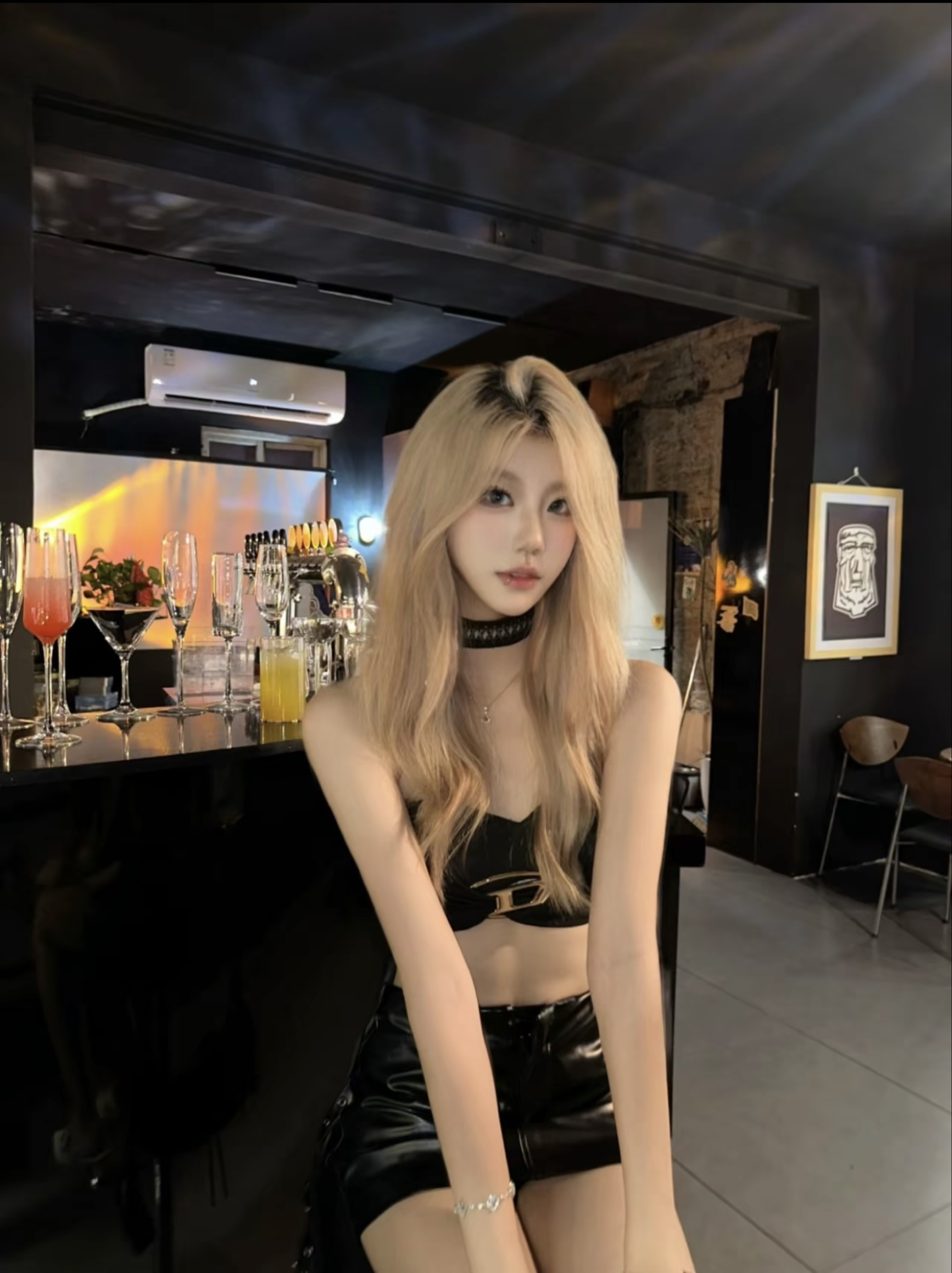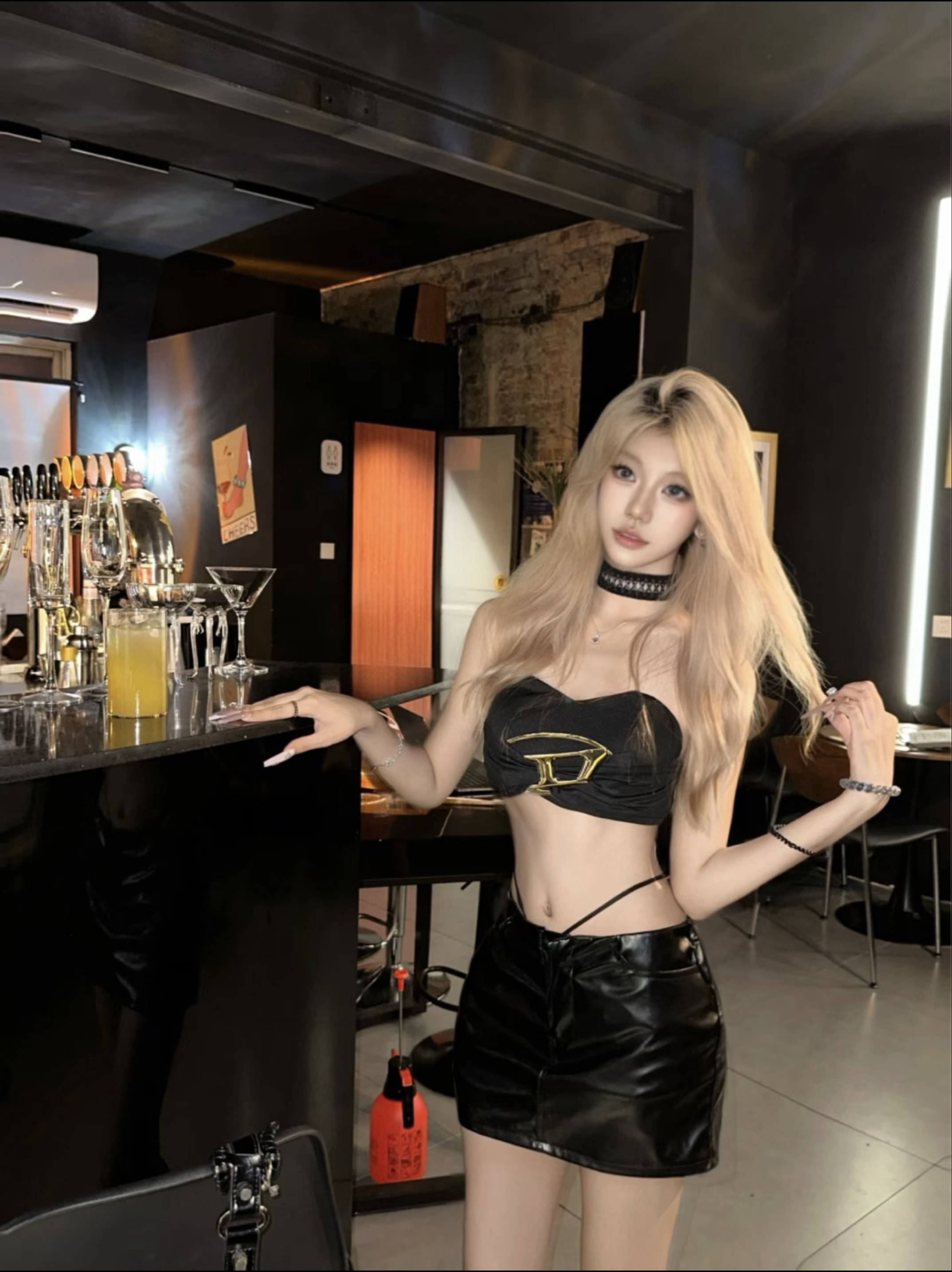 这一套暗黑甜酷风穿搭,真的越看越喜欢~ 亮面小皮裙搭配同色系金属扣抹胸,自带高光滤镜,再叠带黑色蕾丝choker,又A又媚。 穿这一身去酒吧或者和朋友小酌氛围感直接拉满~##夜晚氛围感拉满##甜辣女生ootd#