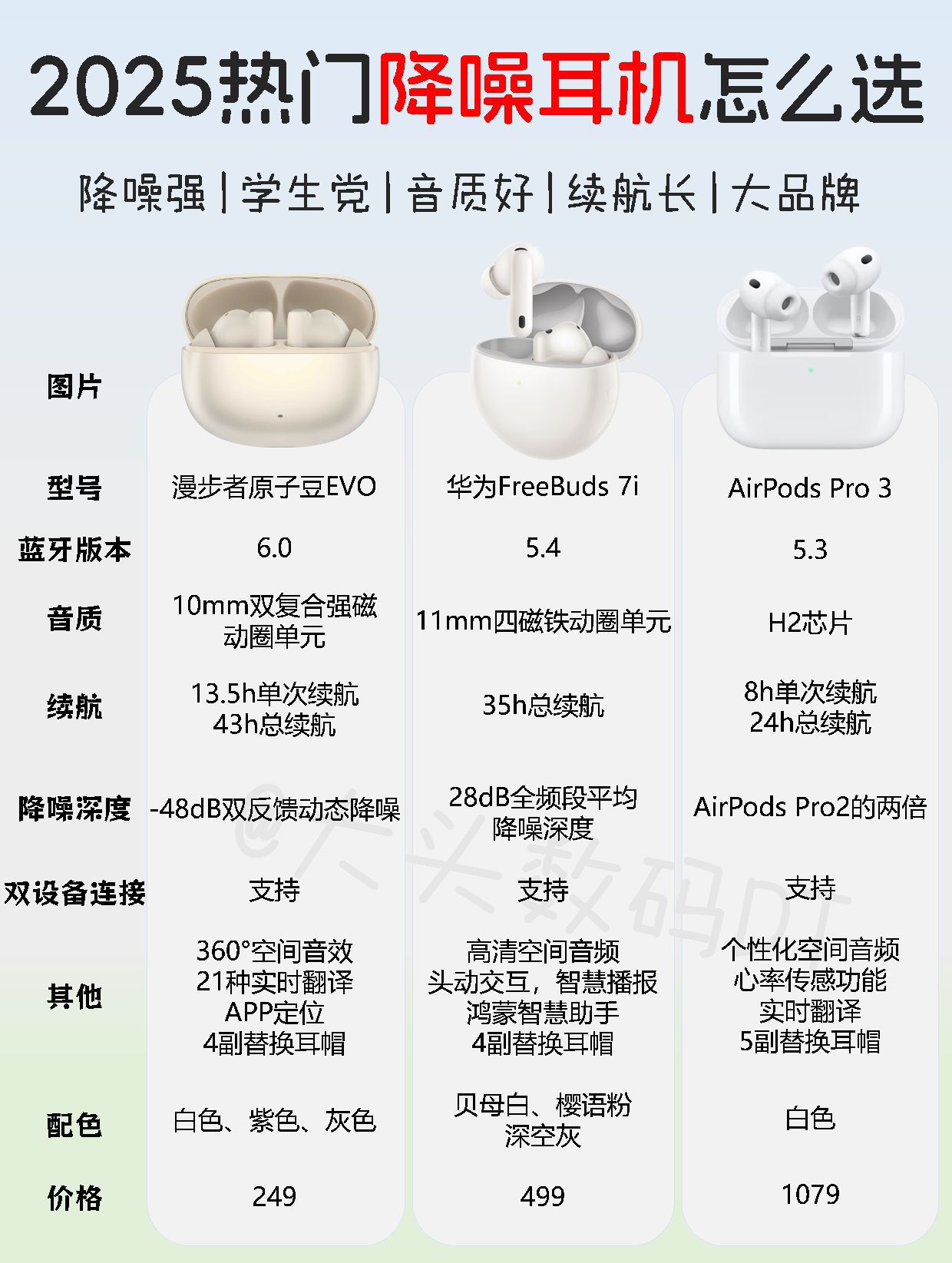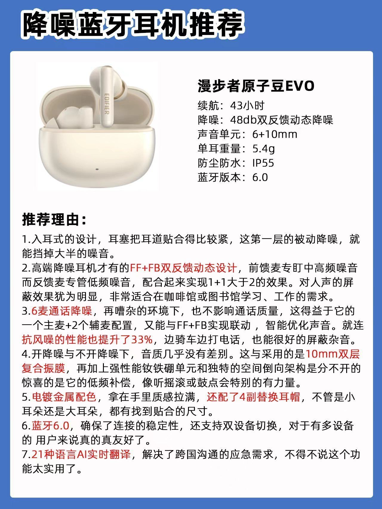 太吵闹的环境总是让人静不下心来,除了逃离我们还可以选择一款合适的降噪耳机,隔绝通勤路上的喇叭声,隔绝隔壁桌的喧闹声,想要还自己一个清静世界的小伙伴一定要看过来。 1.漫步者原子豆evo 入耳式设计 + FF+FB 双反馈降噪,被动挡噪 + 双麦分工(前馈降中高频、反馈降低频),人声屏蔽强,适配咖啡馆 / 图书馆场景;6 麦通话降噪联动双馈,抗风噪升 33%,嘈杂环境通话清晰。开降噪不损音质,10...