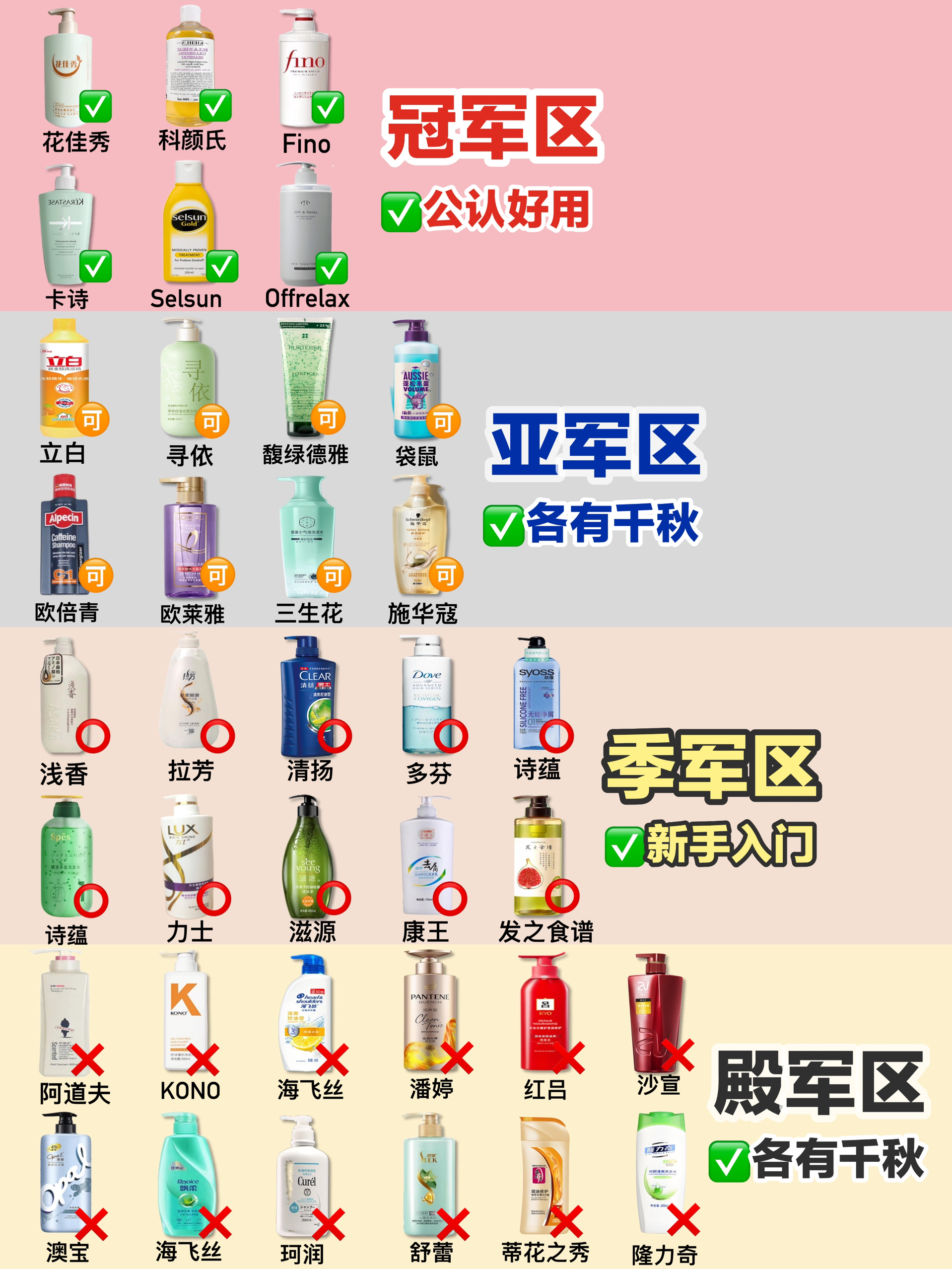 真心奉劝大家选洗发水别盲目冲动啦!功课做不好,选到不适合还会造成头发出油/头屑/发痒/毛躁等问题,今天专门为大家整理了不同需求对应的洗发水,不会选的直接码住 洗发水功效参考【附功效】 -花佳秀洗发水:控油去屑 -卡诗洗发水:温和清洁 -欧莱雅洗发水:补水保湿 -诗华寇洗发水:多效修复 -蜂花洗发水:日常清洁