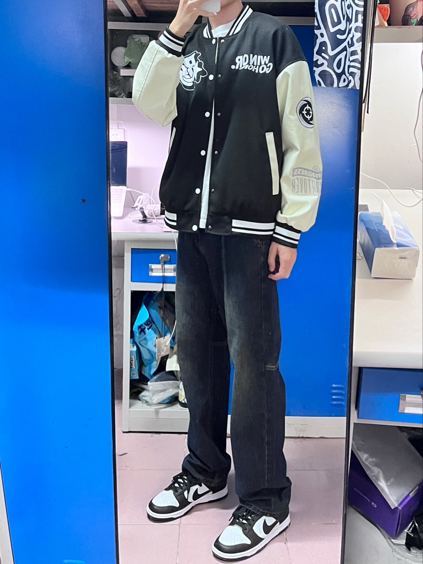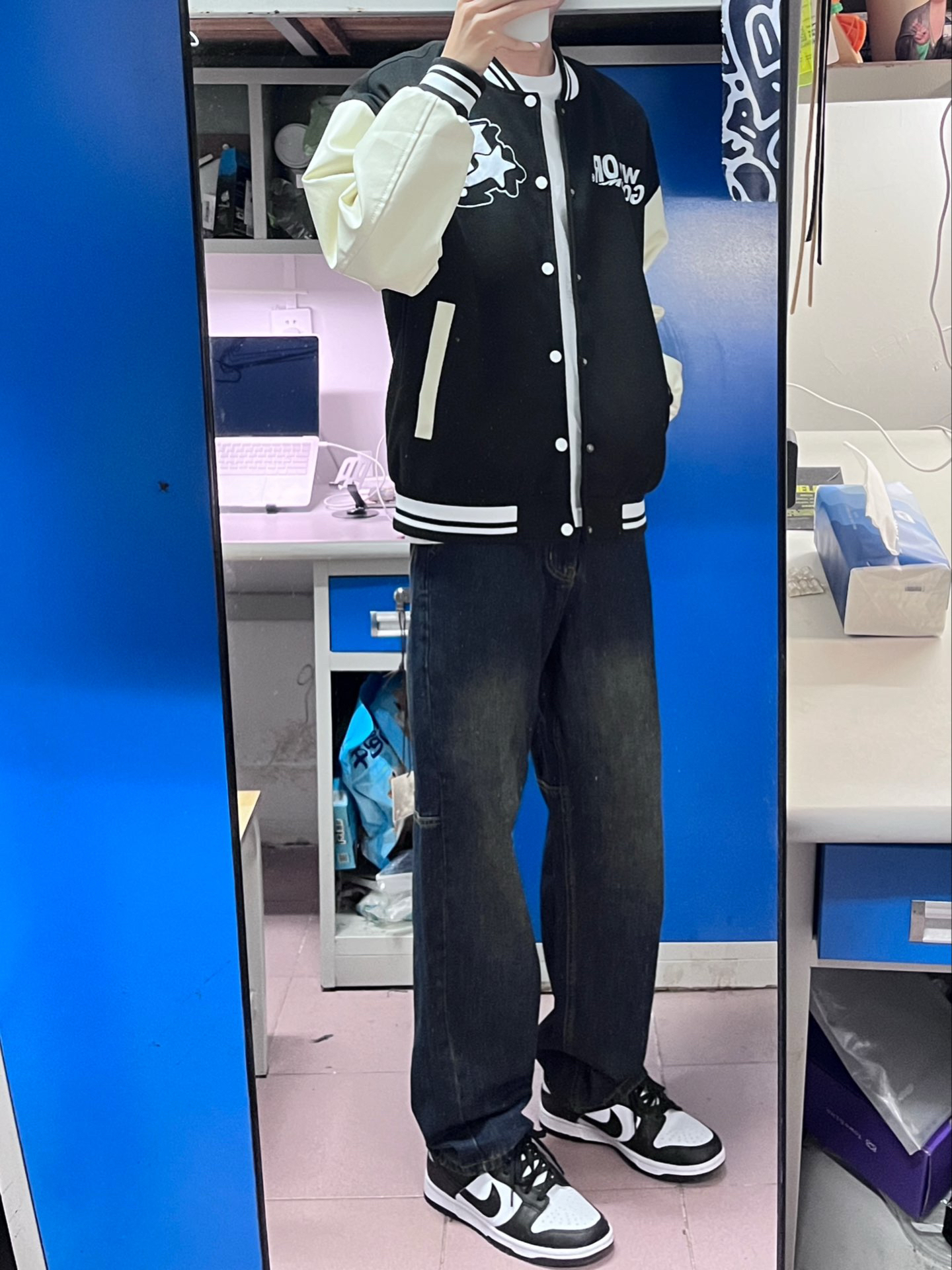 今天穿的是这一身 黑白拼接的棒球服搭配这条黑色的牛仔裤 其实颜色偏深蓝,但是很百搭 版型质感都不错,秋冬换季穿这一身刚刚好👌