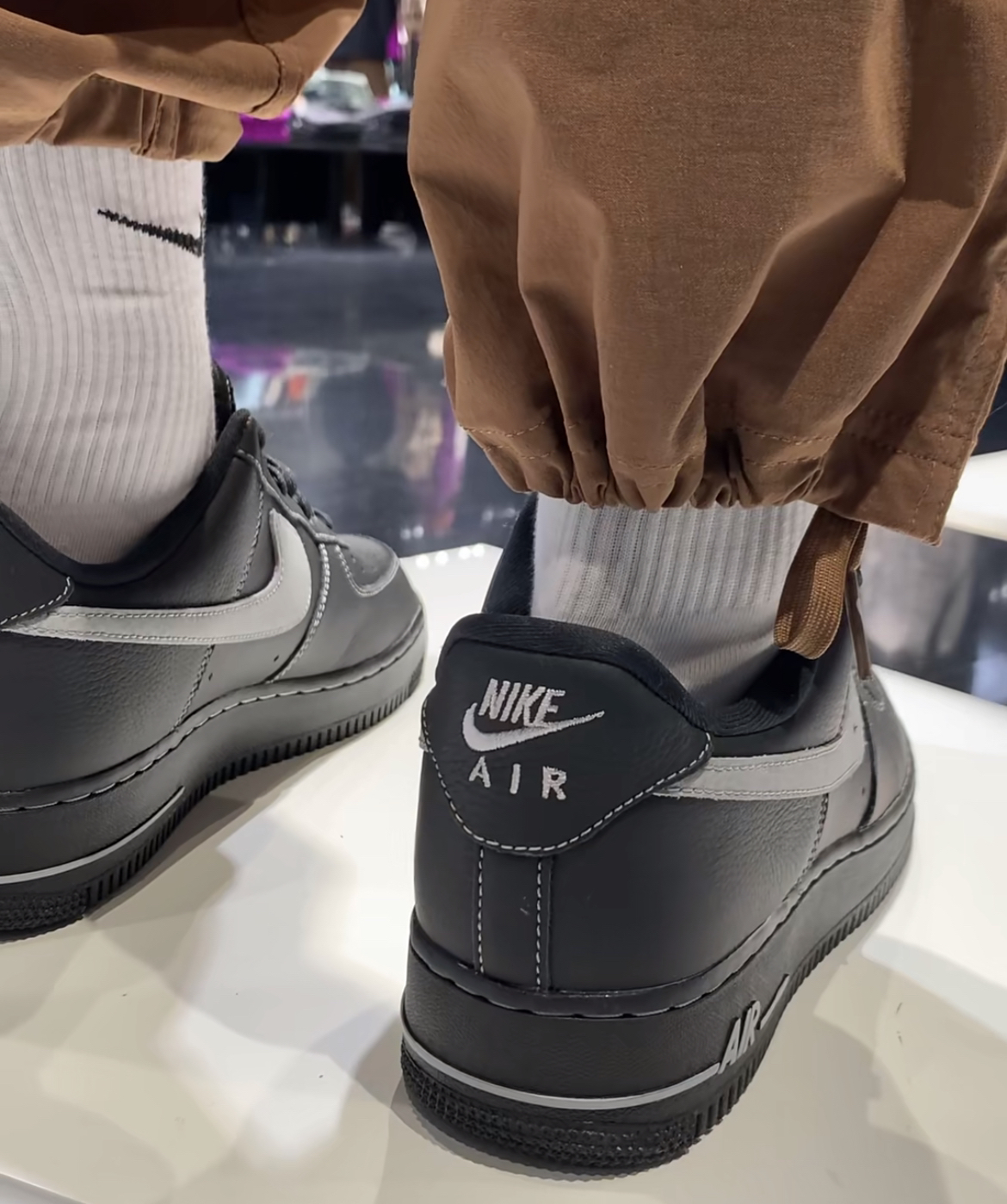 首先鞋型非常正,上脚非常好看,黑灰配色比黑武士配色更有辨识度,而且比白钩更低调,非常好穿搭,皮面是哑光荔枝皮,非常软不会卡脚背,鞋面穿在脚上和跑鞋差不多,鞋底气垫还没完全踩开,但是并不硬,舒适度这一块没的说。不知道我左右脚是不是不一样大,感觉右脚比左脚挤,右脚有一种前掌把鞋撑大的感觉,其他的都很满意