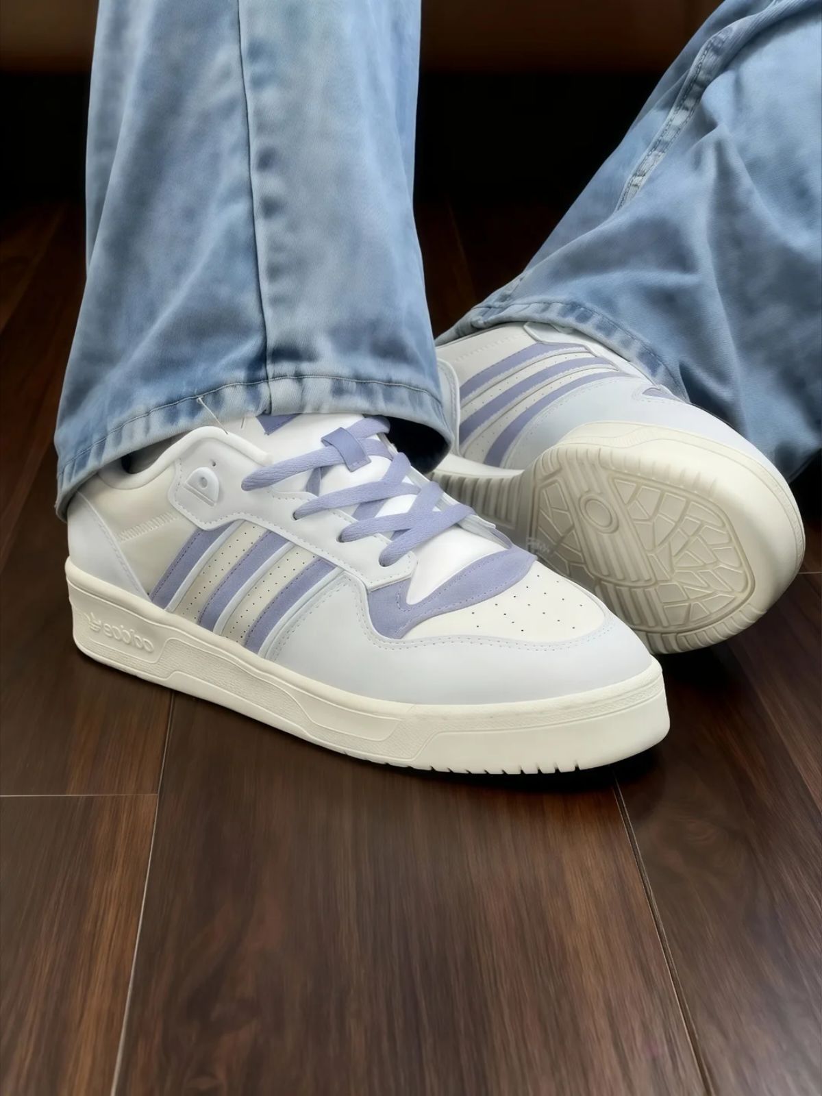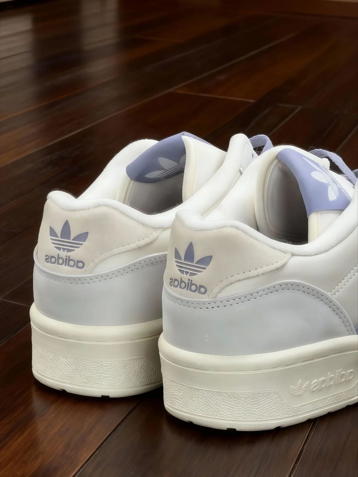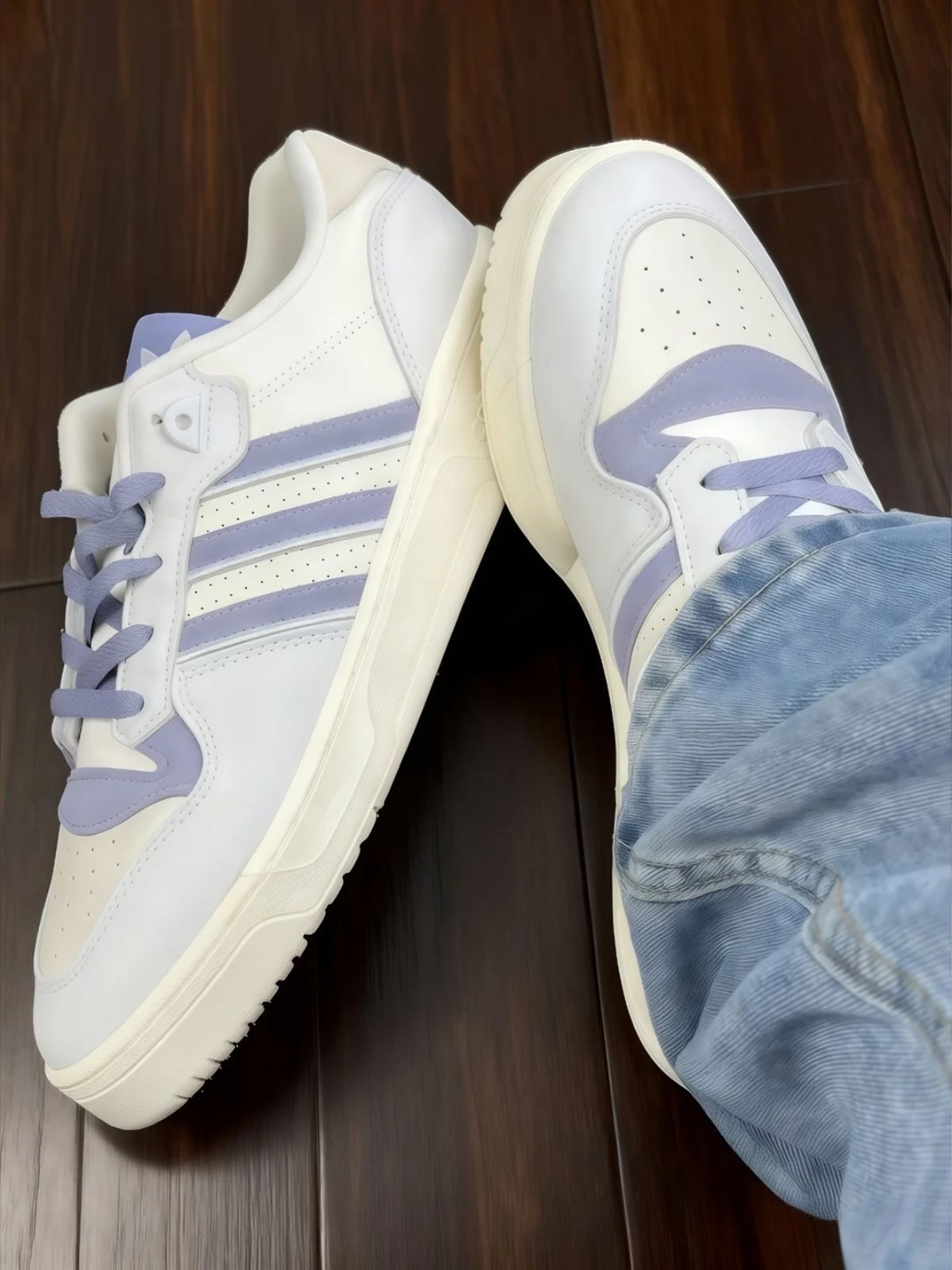 这双Adidas Rivalry Low白紫配色我入手穿了快一个月,分享一下真实的穿着感受。 · 配色清新独特:淡紫色点缀在纯白鞋身上,非常清爽,有种甜而不腻的感觉,春夏搭配裙子或浅色牛仔裤都很出彩。 · 鞋型经典复古:Rivalry Low的鞋型本身就很流畅,上脚秀气,不会显得笨重,侧面的三条杠是绒面材质,质感加分。 · 舒适度及格:作为板鞋,它的脚感不算硬,日常通勤、逛街基本没问题,鞋楦对大...