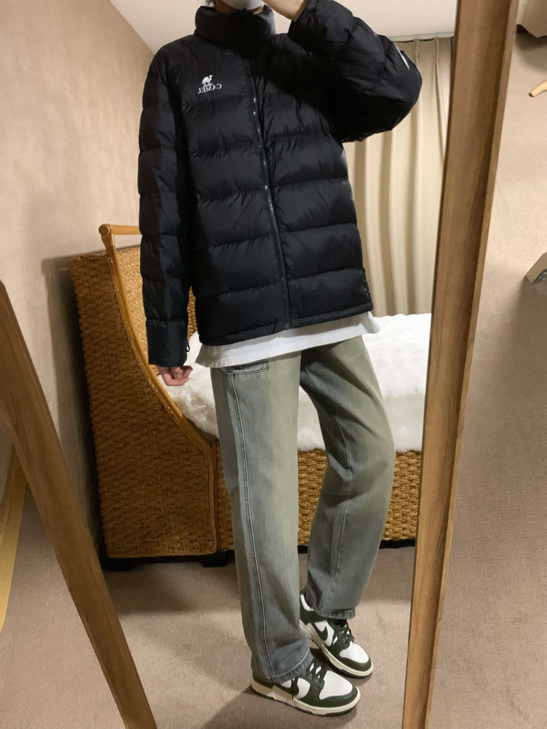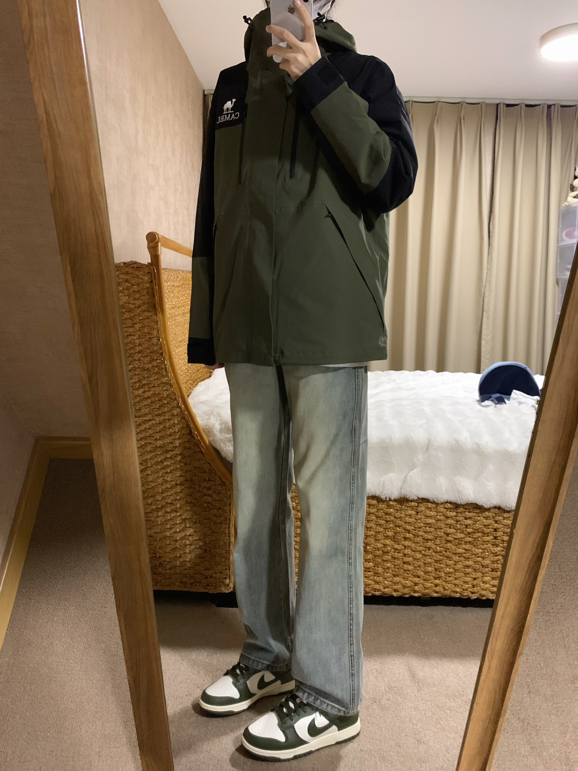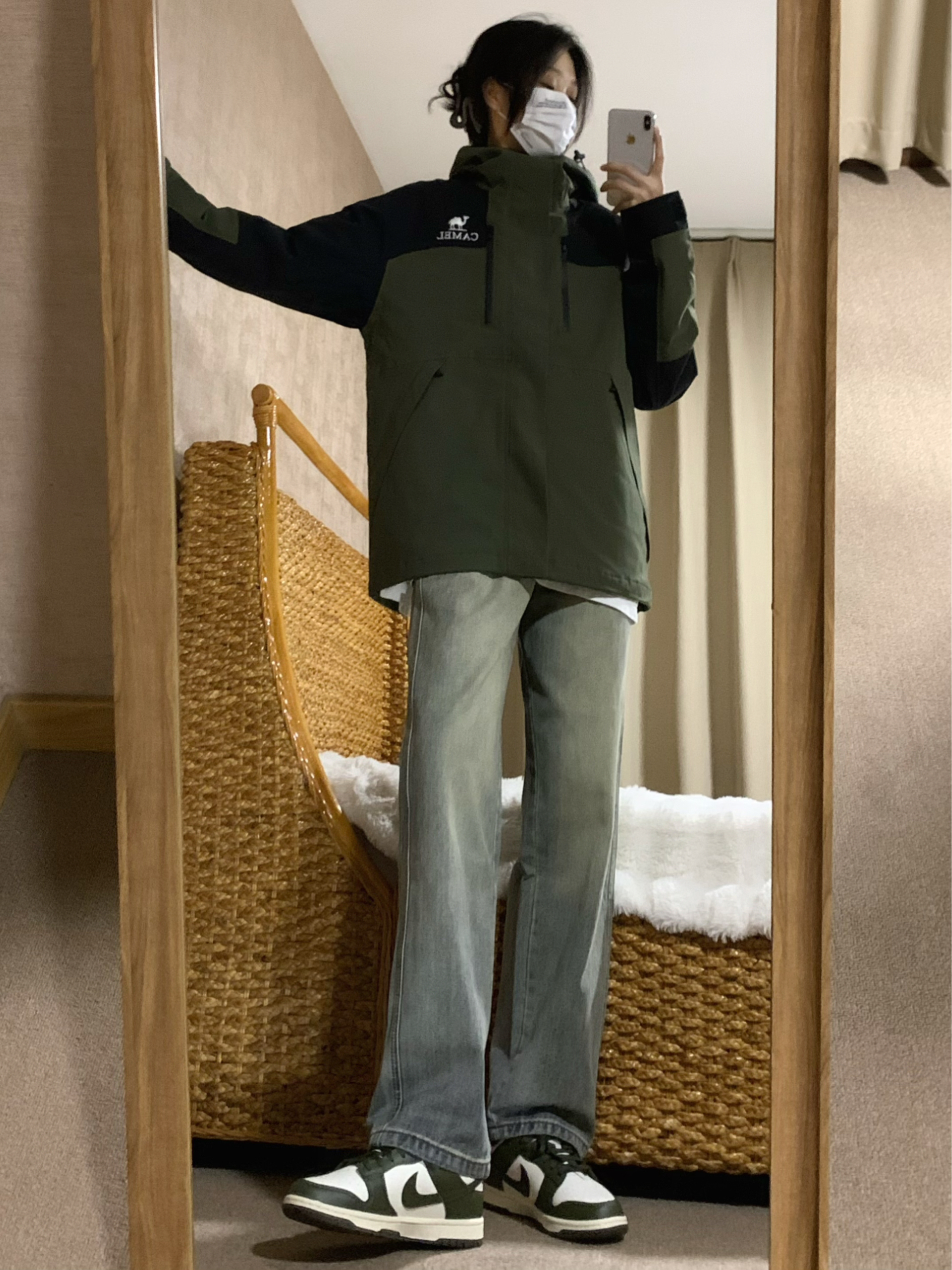 上穿户外山系冲锋衣⛰️ 羽绒内胆三合一 防风立领很实穿 黑绿撞色设计复古又高级 真心好看!! 搭配一条复古蓝色 一年四季百搭神裤! 这身绝啦~