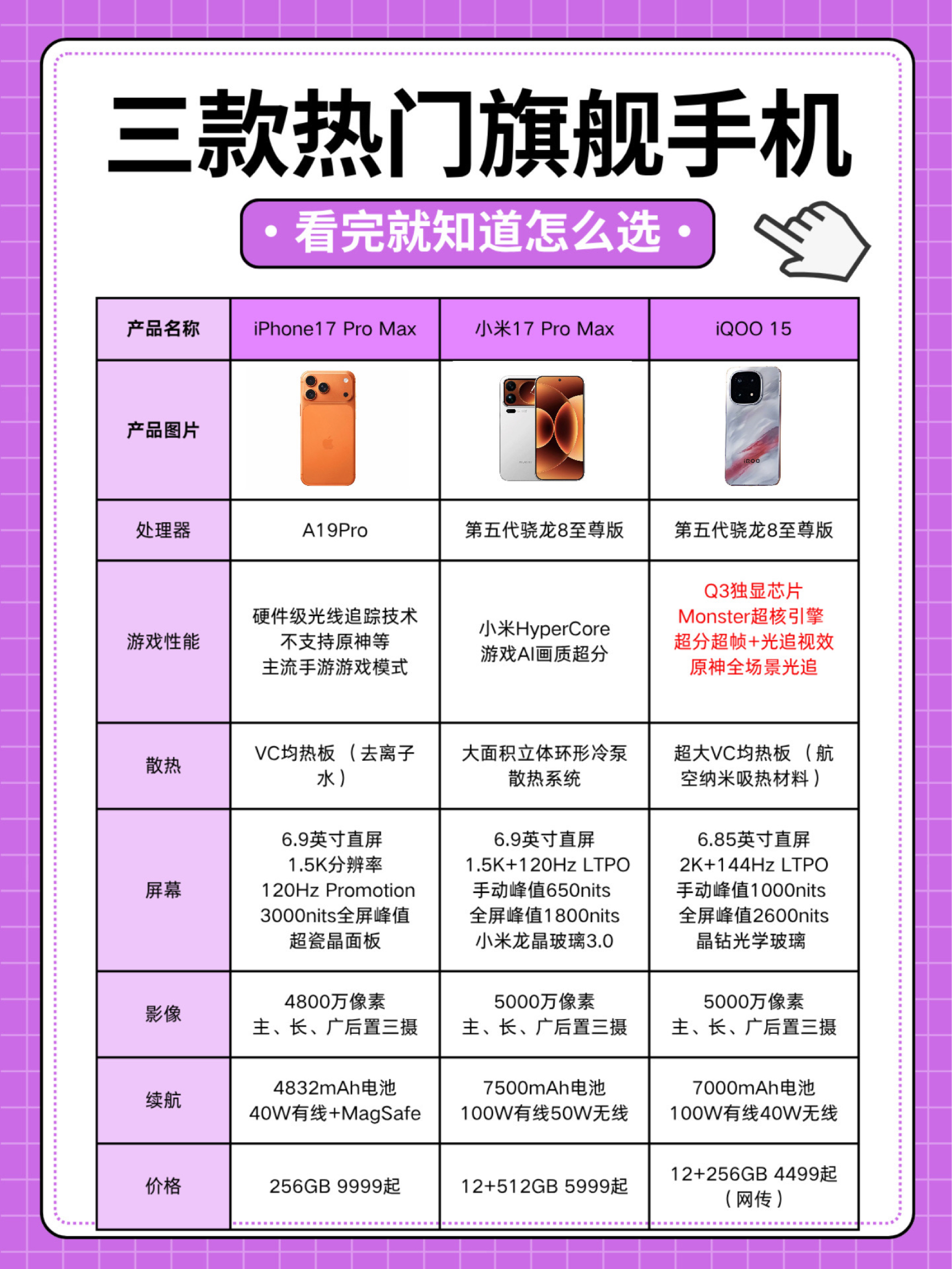 10月份扎堆发布的国产旗舰手机,个个都卯足了劲,虎视眈眈地冲着iPhone17系列而来,它们想对标果子的心情可以理解,和高手过招才能彰显自己是高手的地位。即将发布的iQOO 15是今年国产旗舰手机中我非常看好的机型,既然要对比,咱就别拿标准版来比了,要比就来波狠的,直接和Pro Max比比看。iQOO 15、小米17 Pro Max、iPhone 17 Pro Max这三款机型怎么选?我们来拆分配...