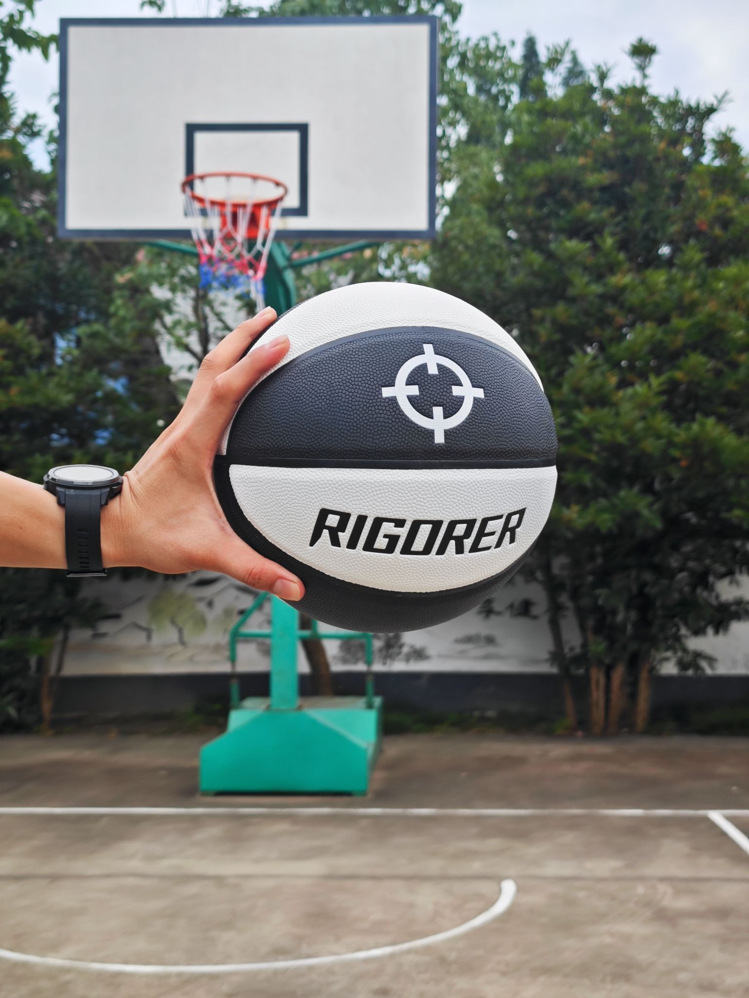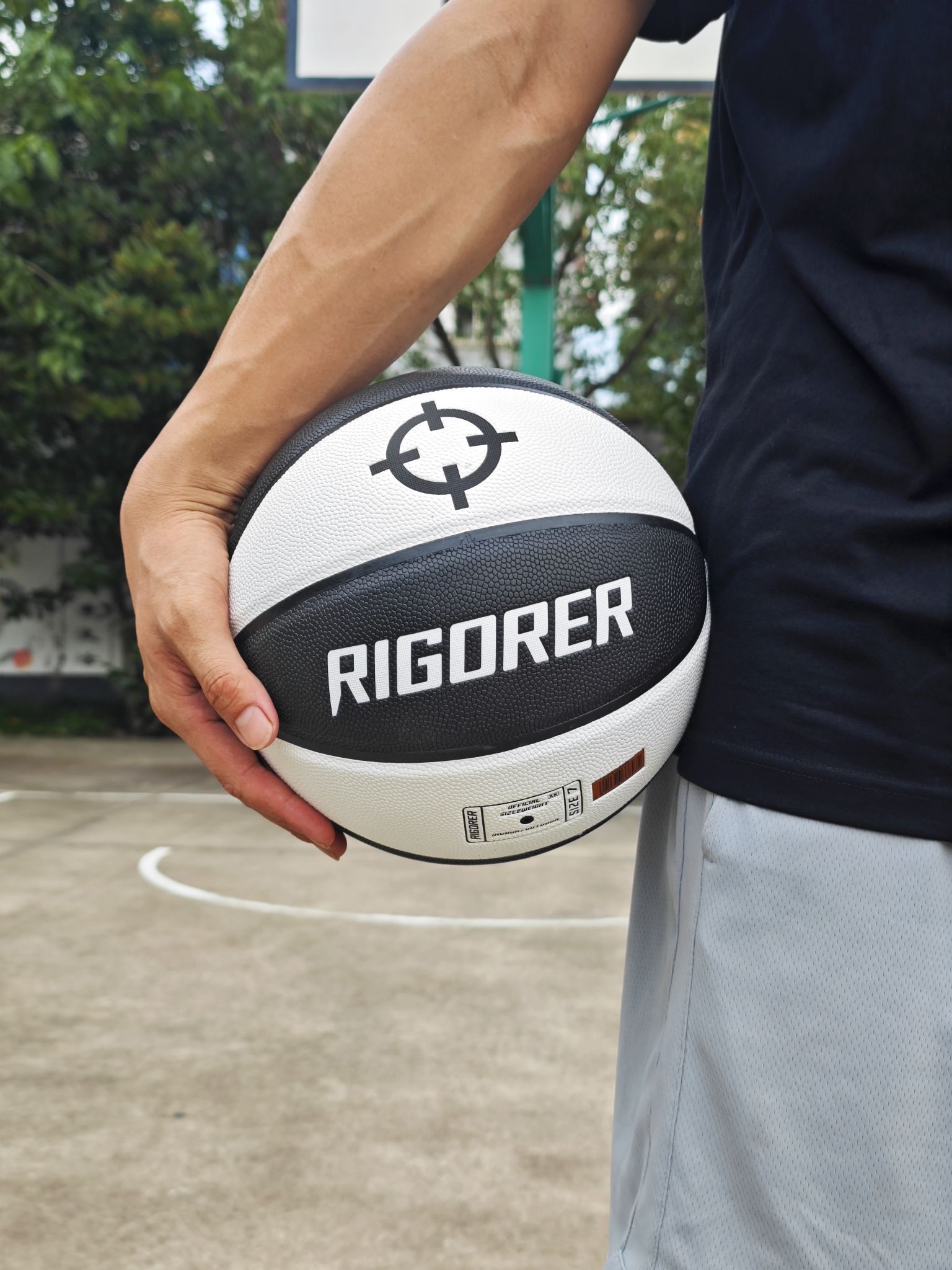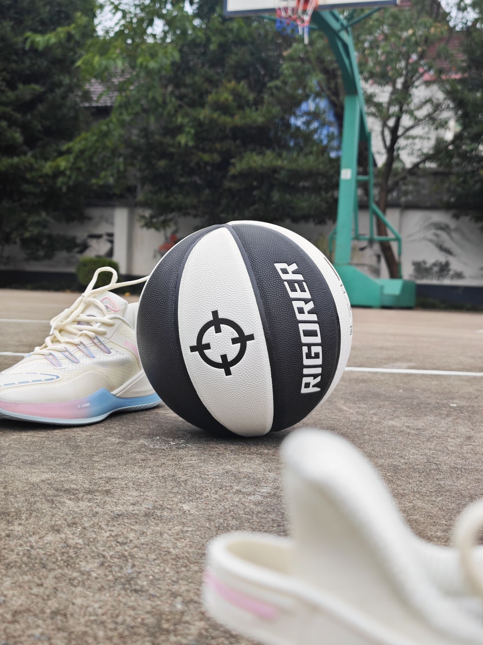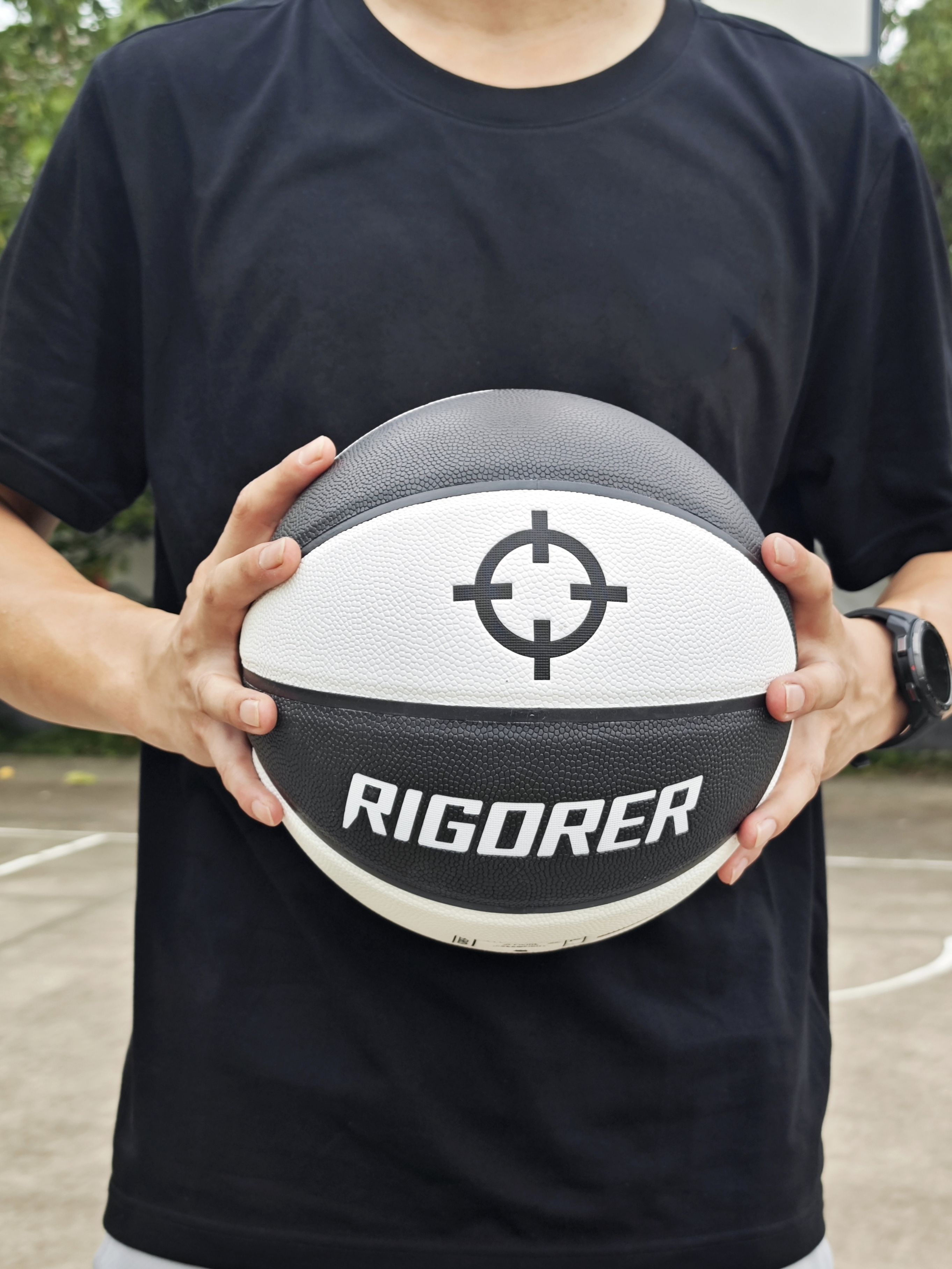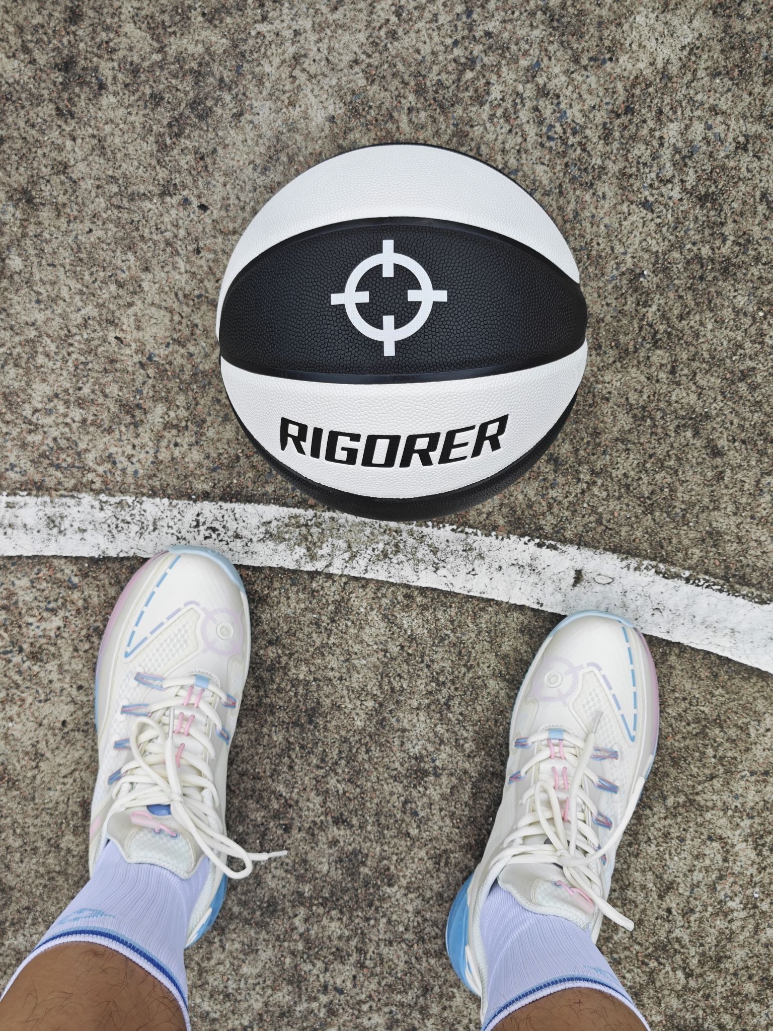 这颗准者狙击1篮球颜值也不错啊, 黑白双拼的配色,颜值也很亮眼 pu皮,手感也很棒,轻松单手抓握 价格实惠,打打水泥地也心疼 搭配准者狙击2篮球鞋,打外场神器