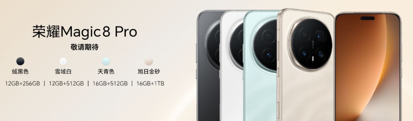 荣耀Magic8 Pro 正式发布 搭载第五代骁龙8至尊版 荣耀这台马上发布 这代对比上代 变化比较大 镜头模组不规则的圆更大了 颜色有 绒黑色 雪域白 天青色 旭日金沙 也就是黑白蓝黄四色 屏幕为6.71英寸 1.5K等深四曲屏 支持6000尼特峰值亮度 4320赫兹PWM调光 支持3D超声波指纹 3D人脸识别 处理器为第五代骁龙8至尊版 性能更强 功耗更低 游戏没有压力 性能很够 影像比较强...
