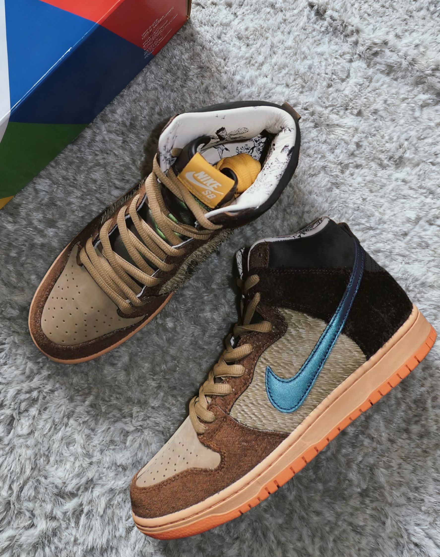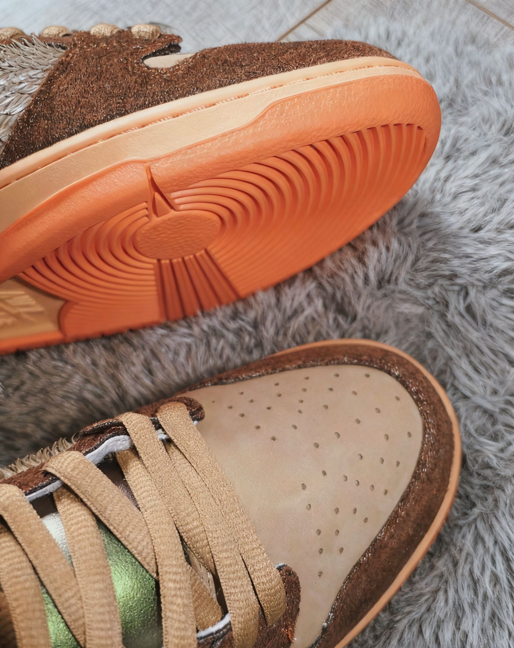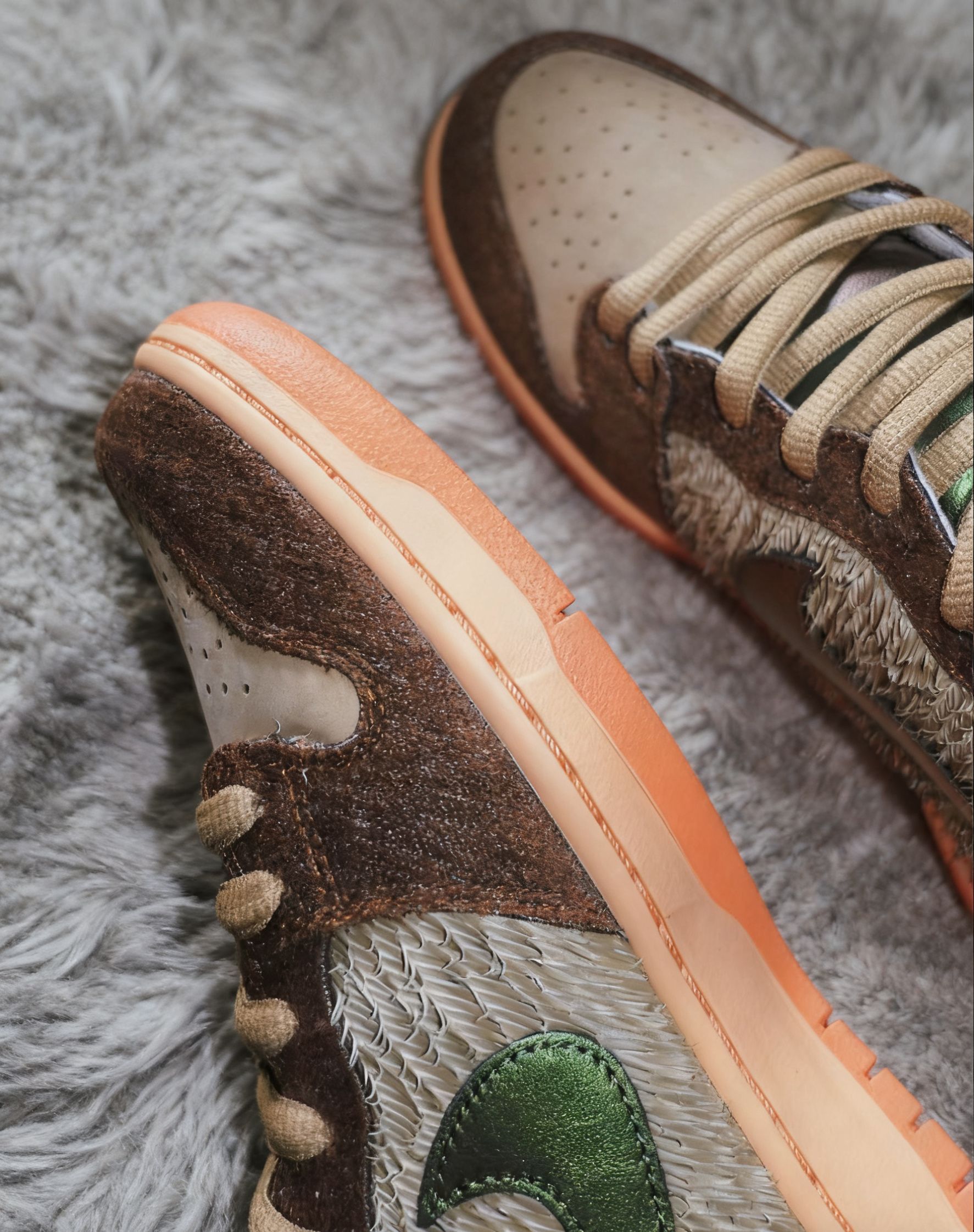 好离谱的设计鞋身两边采用皮革切条营造羽毛效果棕色加浅咖配色活脱脱的烤鸭配色,高邦设计包裹性很好,橡胶花纹大底,防滑还可以,脚感还行,鞋底偏硬,很复古搭配复古牛仔裤很塑型总体还不错,你会选择这样一双复古经典板鞋当日常通勤鞋吗 #超级百搭复古板鞋 #dunk棕灰色 #秋天的第一双板鞋