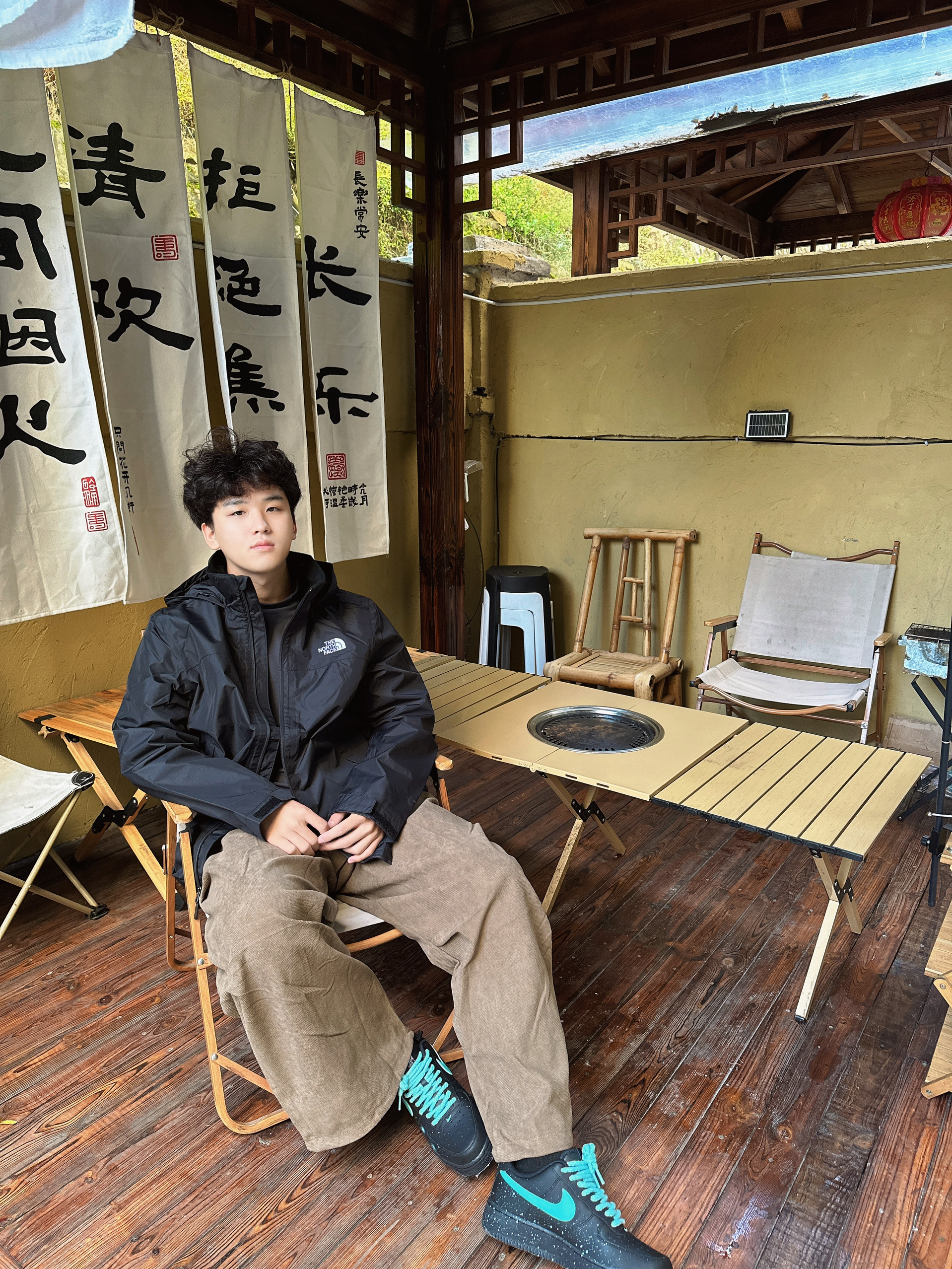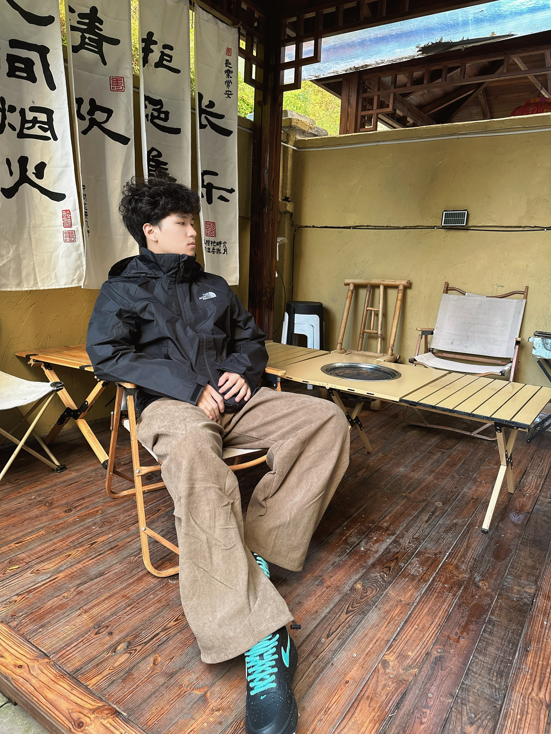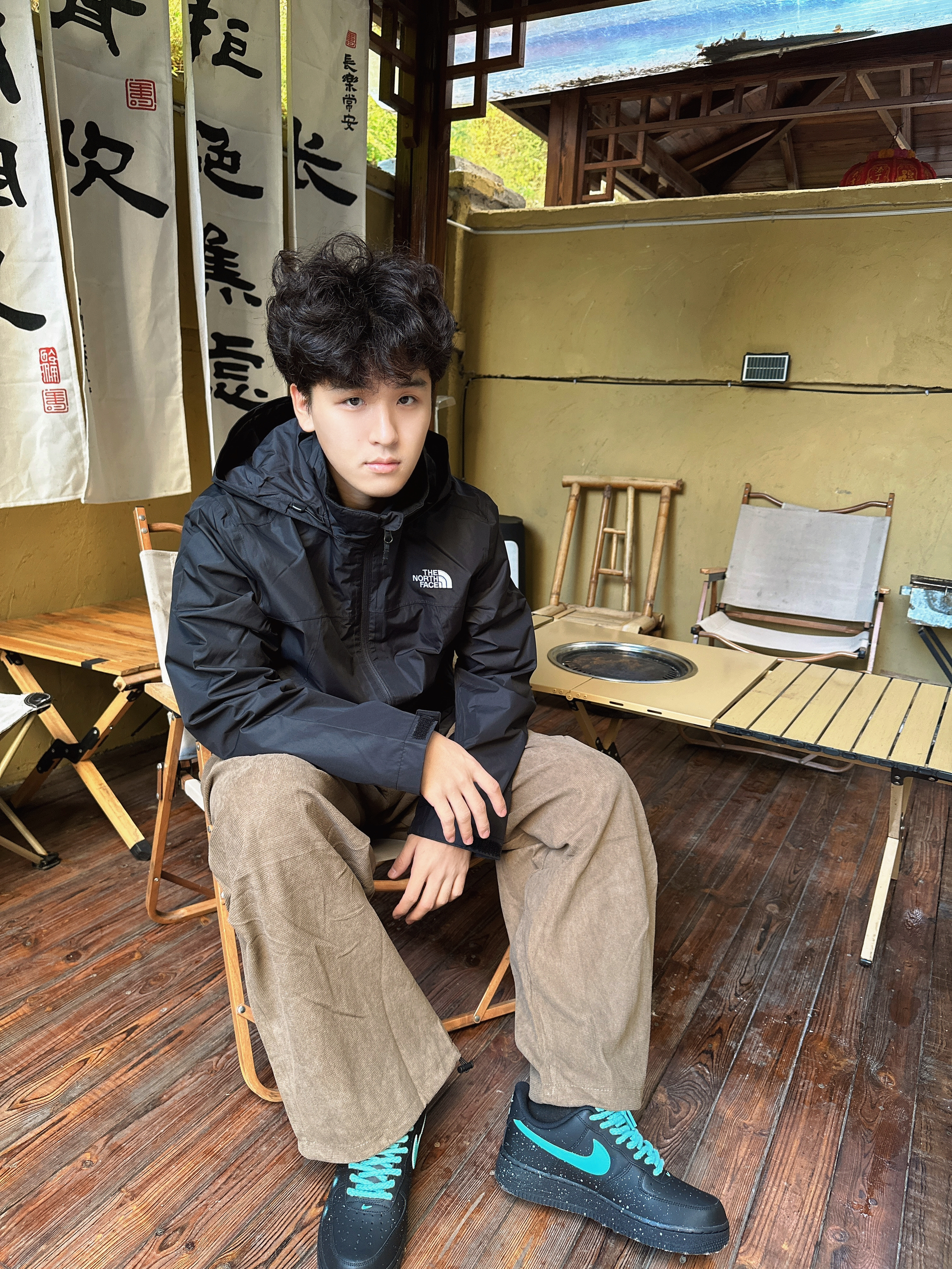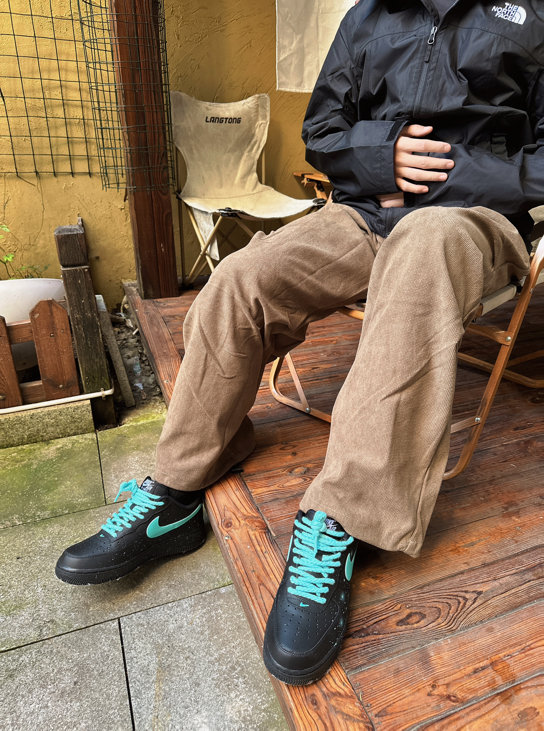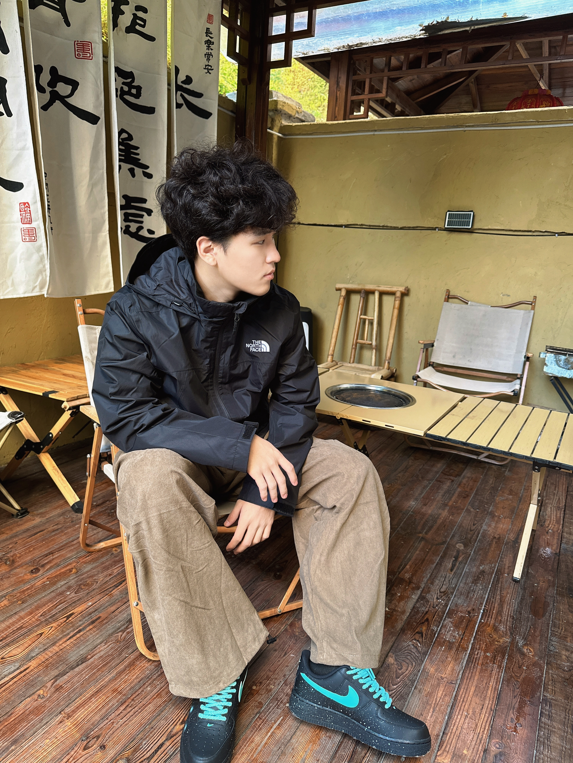 一身黑色北面冲锋衣,硬核户外属性拉满。 内搭简约黑T,叠穿出层次感。 卡其色阔腿裤随性显腿长。 搭配黑绿撞色空军一号,潮酷细节点亮整体 裤子整体舒适宽松 通勤旅游都合适。
