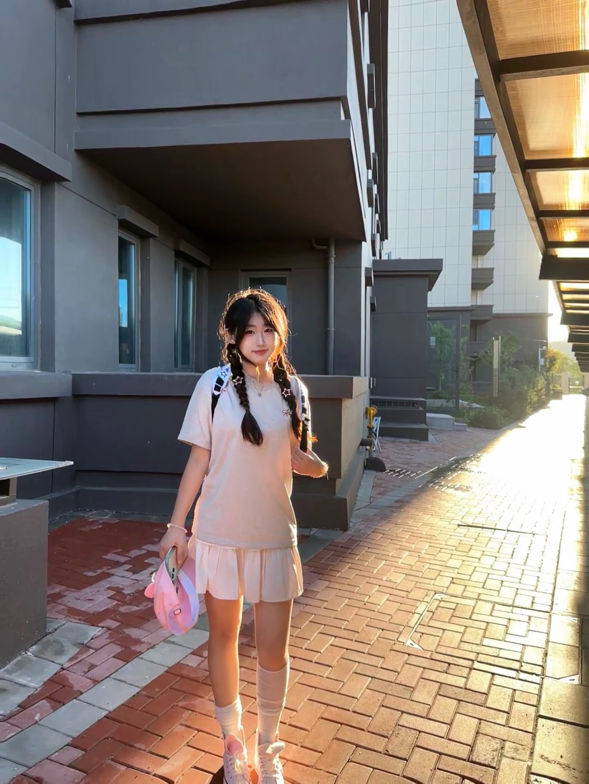 看看谁还不会如此简单穿搭 身高|体重:165|55 🧍♂️ 穿搭风格:学生👩🎓 👔 上衣:始祖鸟半袖 👖 下装:百褶裙 👟 鞋子:粉色匡威 🎒配饰:jordan背包