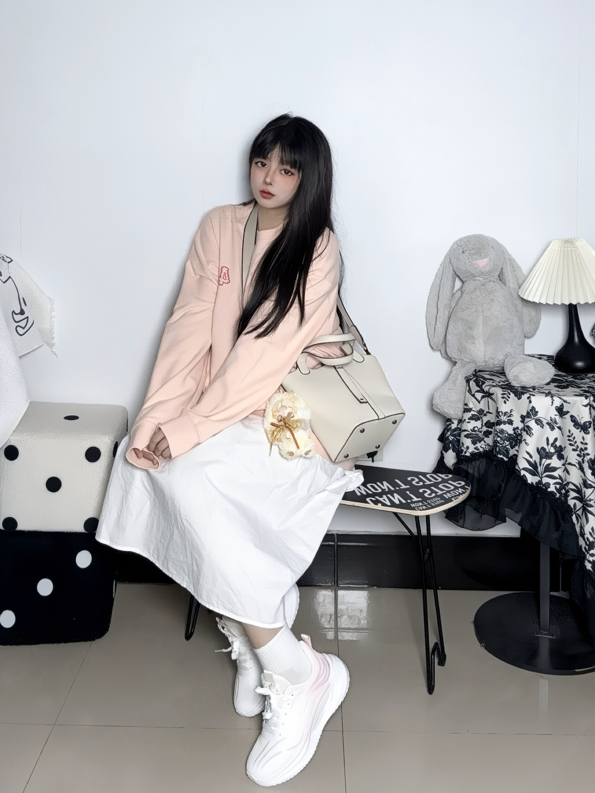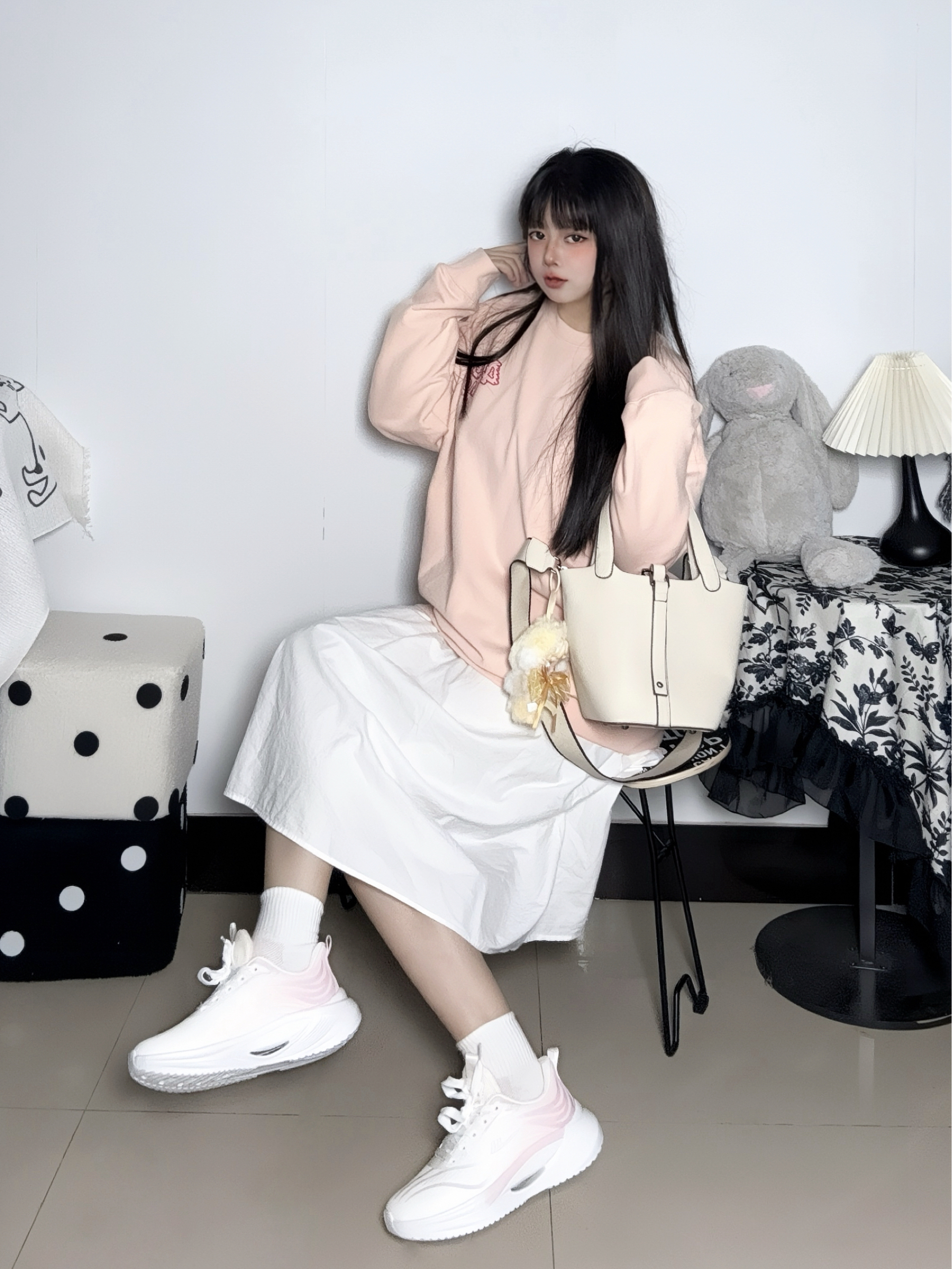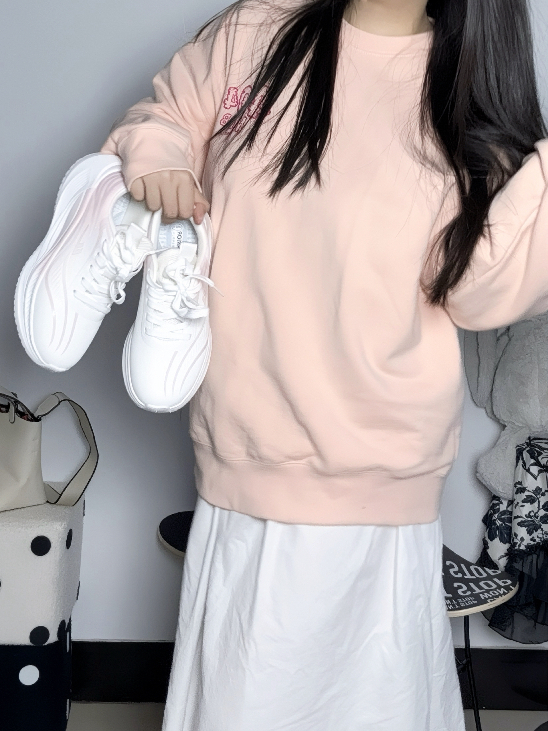 这不是天冷了么 长袖的卫衣已经适穿了 一般我会搭配厚一点的长裙 加一双软底的休闲鞋 这样通勤也不会累 - 软软的鞋底踩一天jio不痛 这个颜色很清新适合女生 是那种渐变的樱花粉 满满活力少女风~💕 配饰我挑的是基础水桶包包 象牙白特别好搭 荔枝皮也和高级呢~ 再挂个SP的毛绒玩偶太可爱了