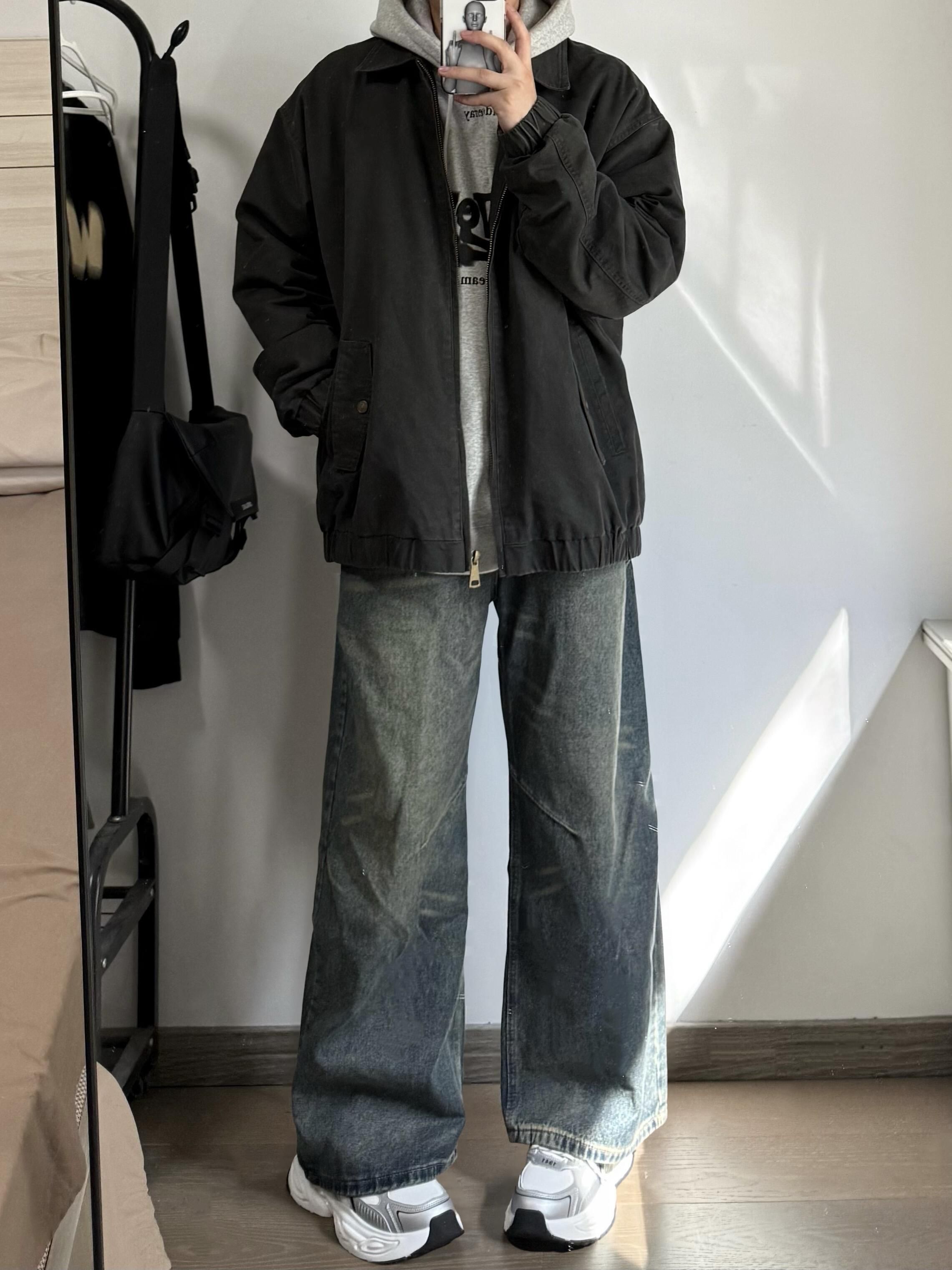 178男生秋冬这样穿 深灰色外套搭配浅灰色连帽卫衣 复古牛仔裤搭配老爹鞋