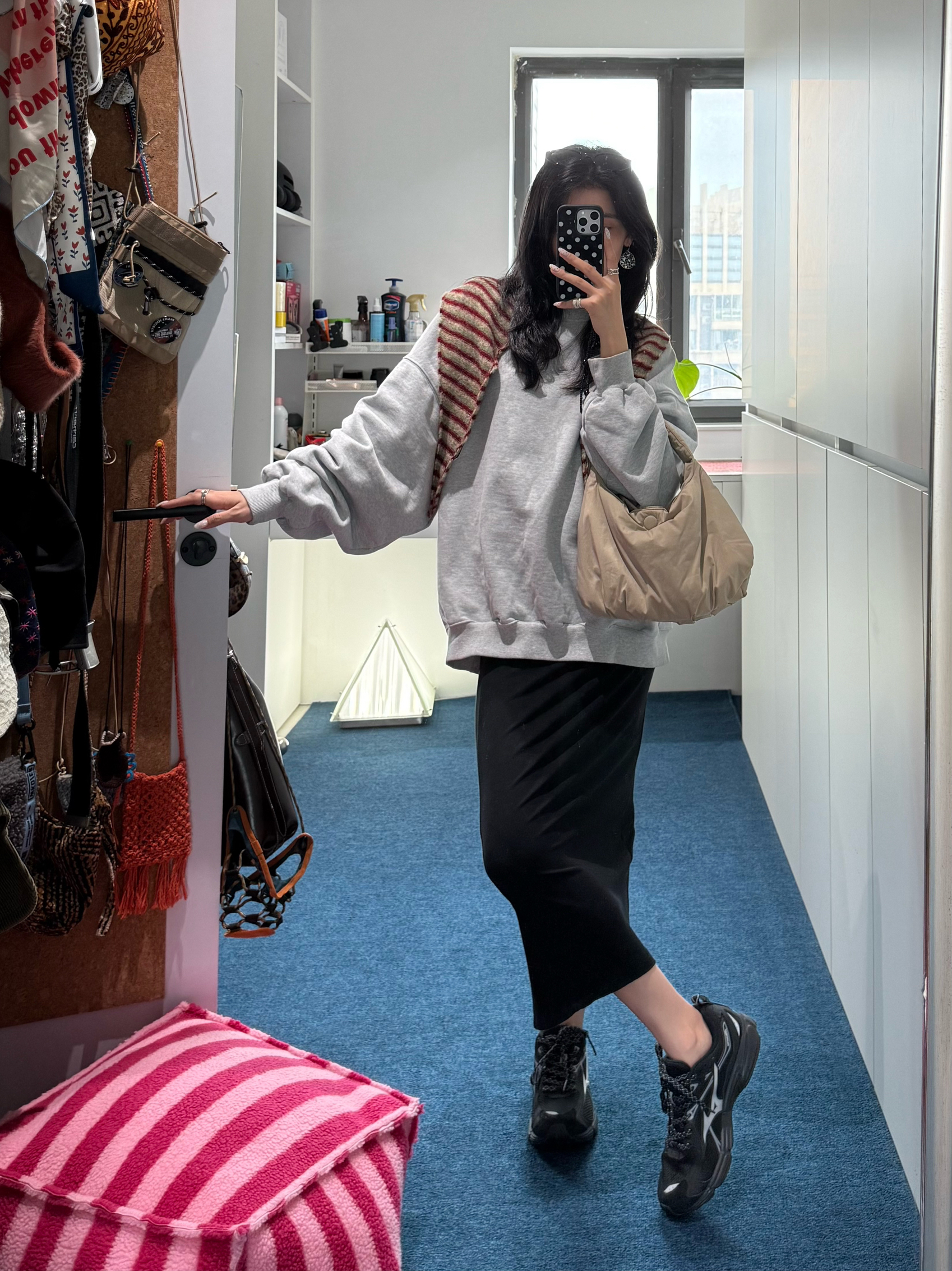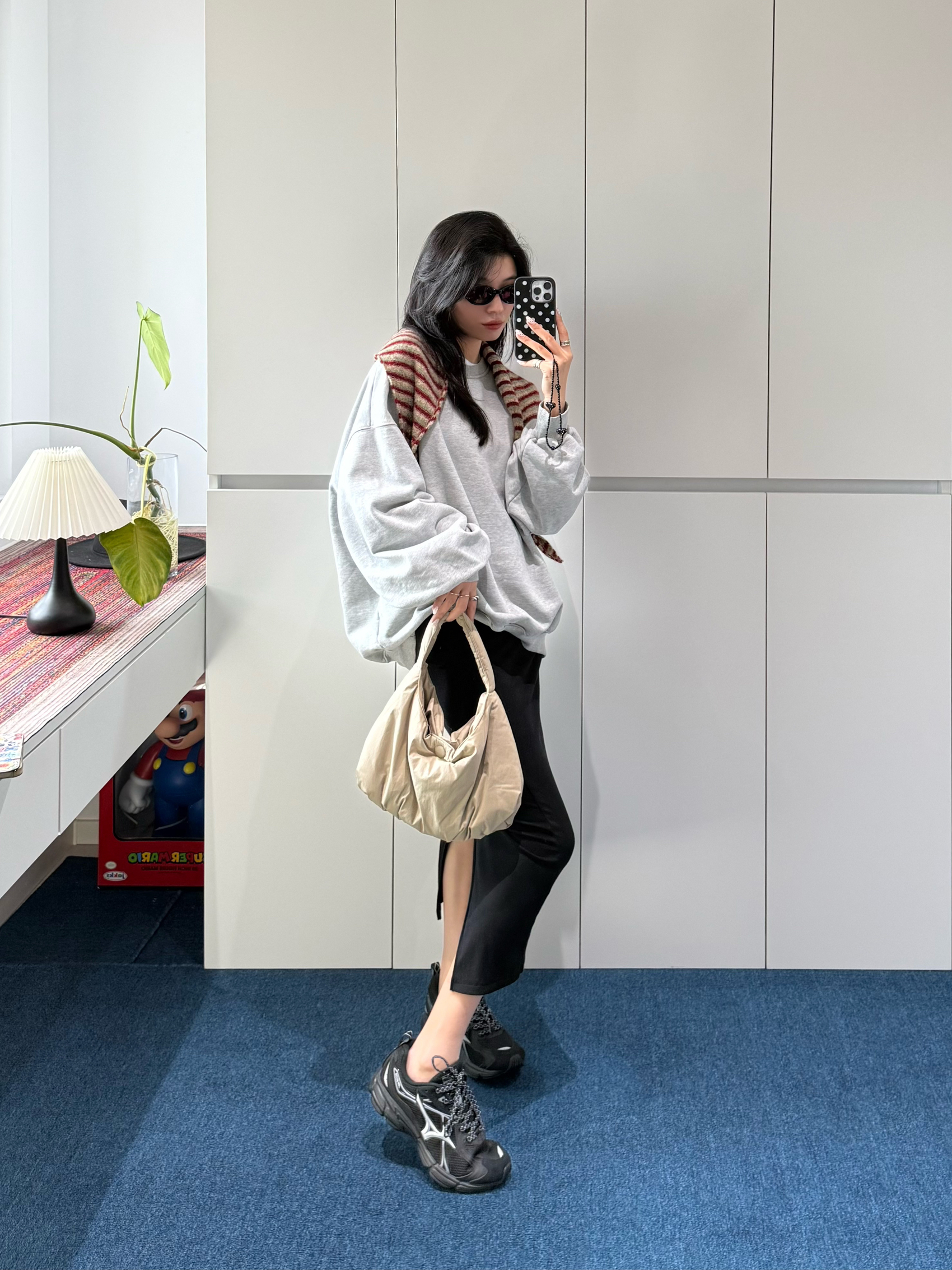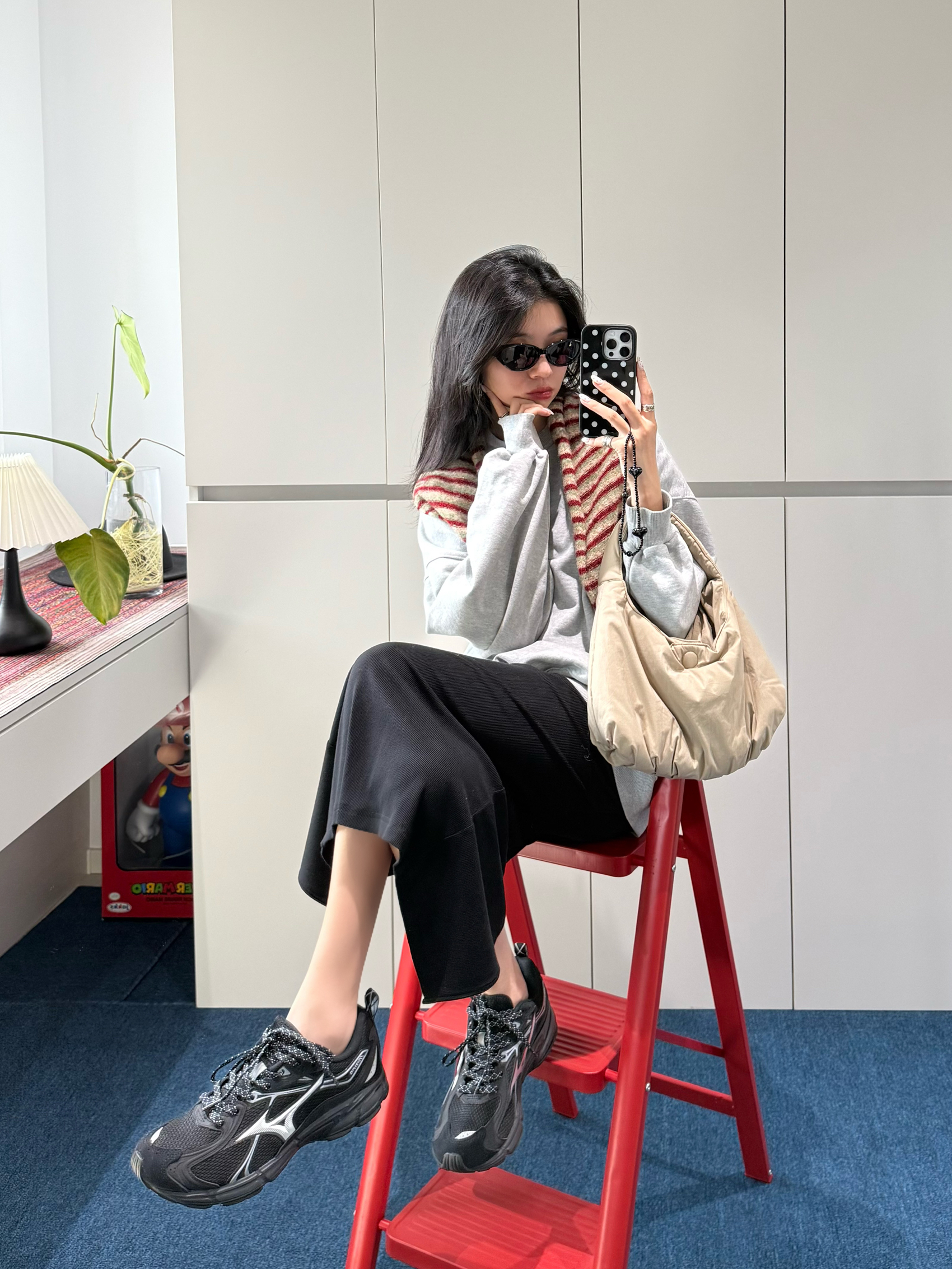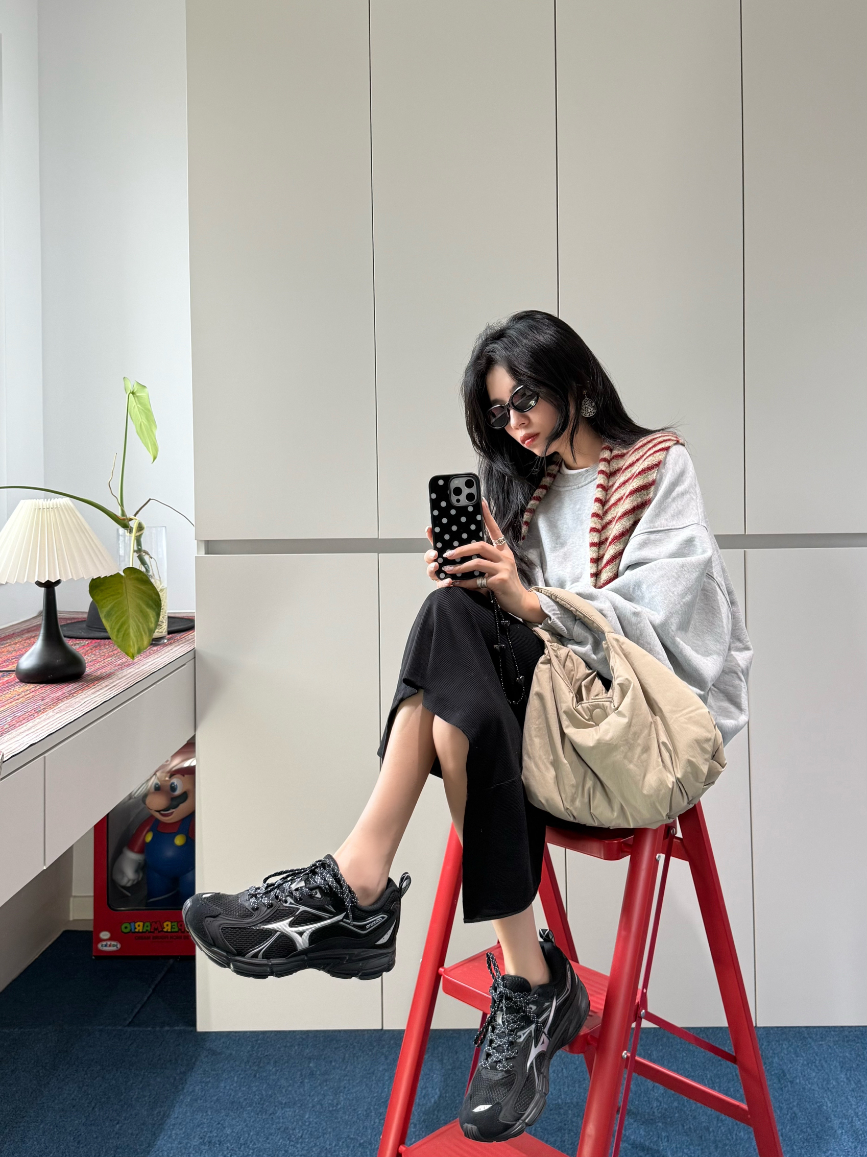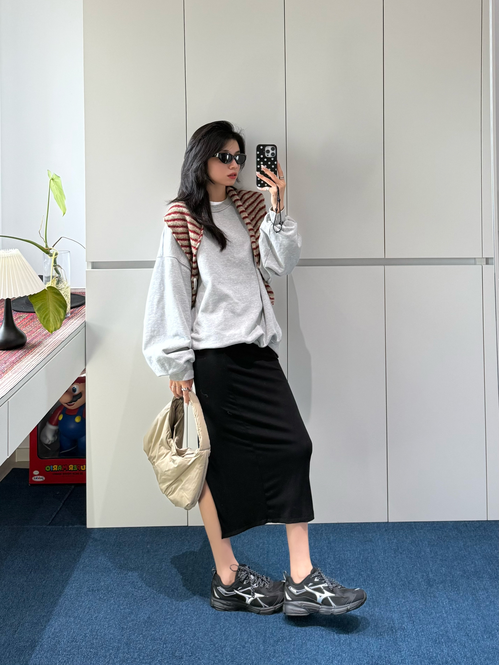 灰色卫衣叠搭条纹针织小坎肩,复古感十足 黑色开衩半裙增添女人味👗 再踩上美津浓Speed 10s跑鞋,舒适度和造型感双在线👟 这套混搭谁穿谁时髦,你们还想看啥风格的穿搭,评论区问我~