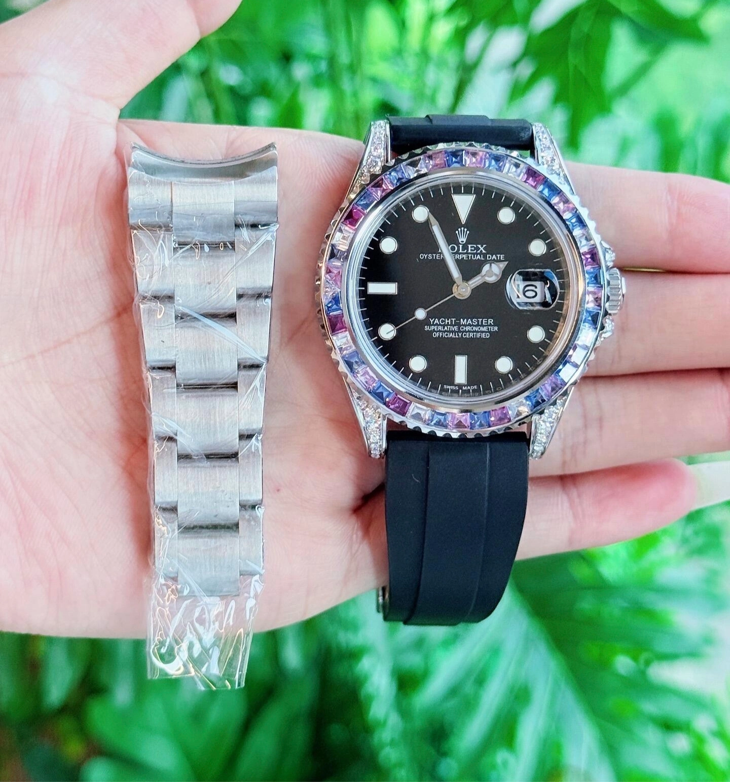 橡胶表带比金属轻便,上班、周末出门搭衣服都不难。但18K白金壳太娇气,磕碰易留痕,我戴时得特小心😟。 橡胶带夏天出汗多了会闷,价格也让我肉疼,要不是真心喜欢真舍不得。 现在休闲或商务休闲风我会戴它,特正式场合还是得换皮带表~