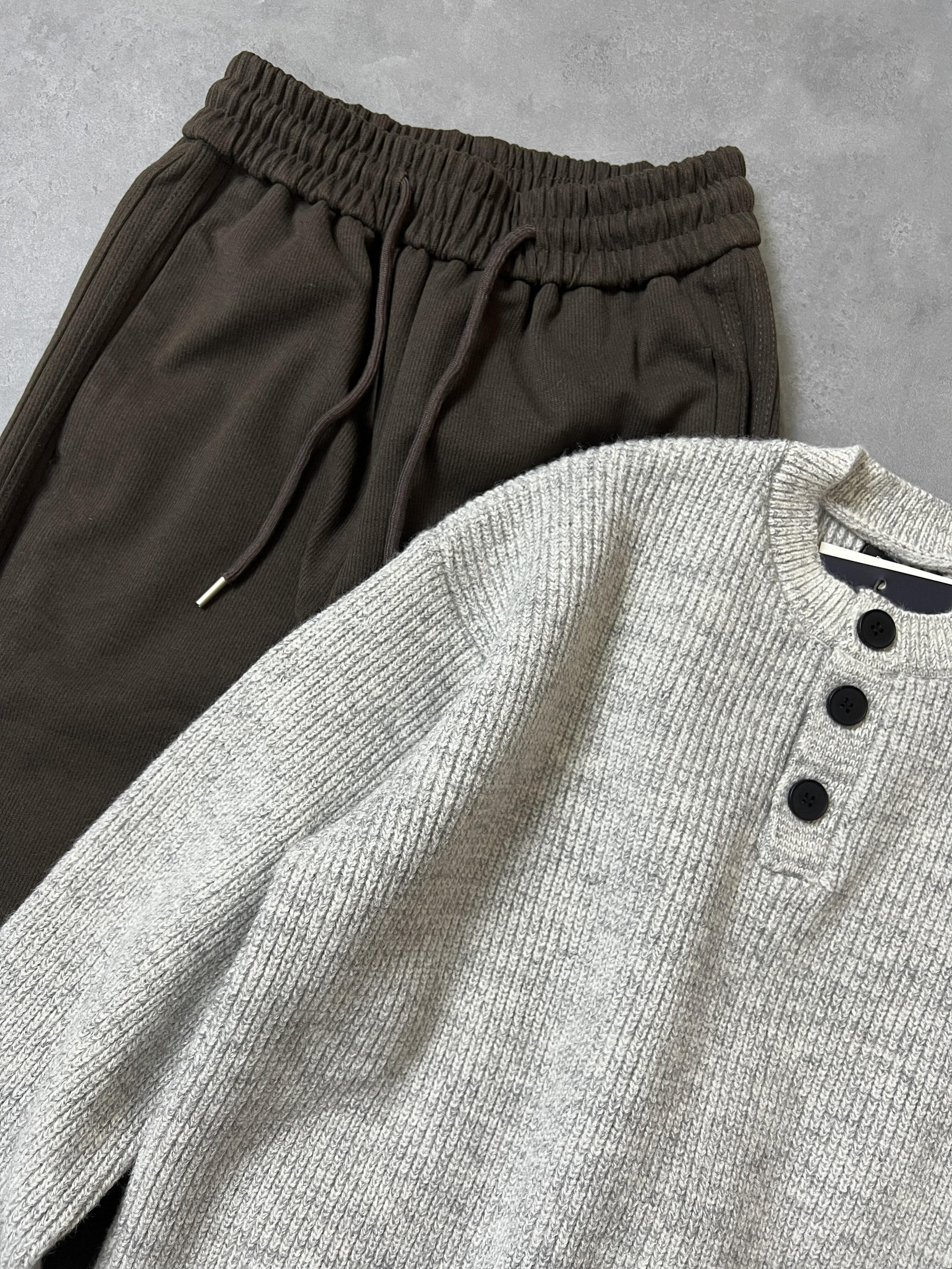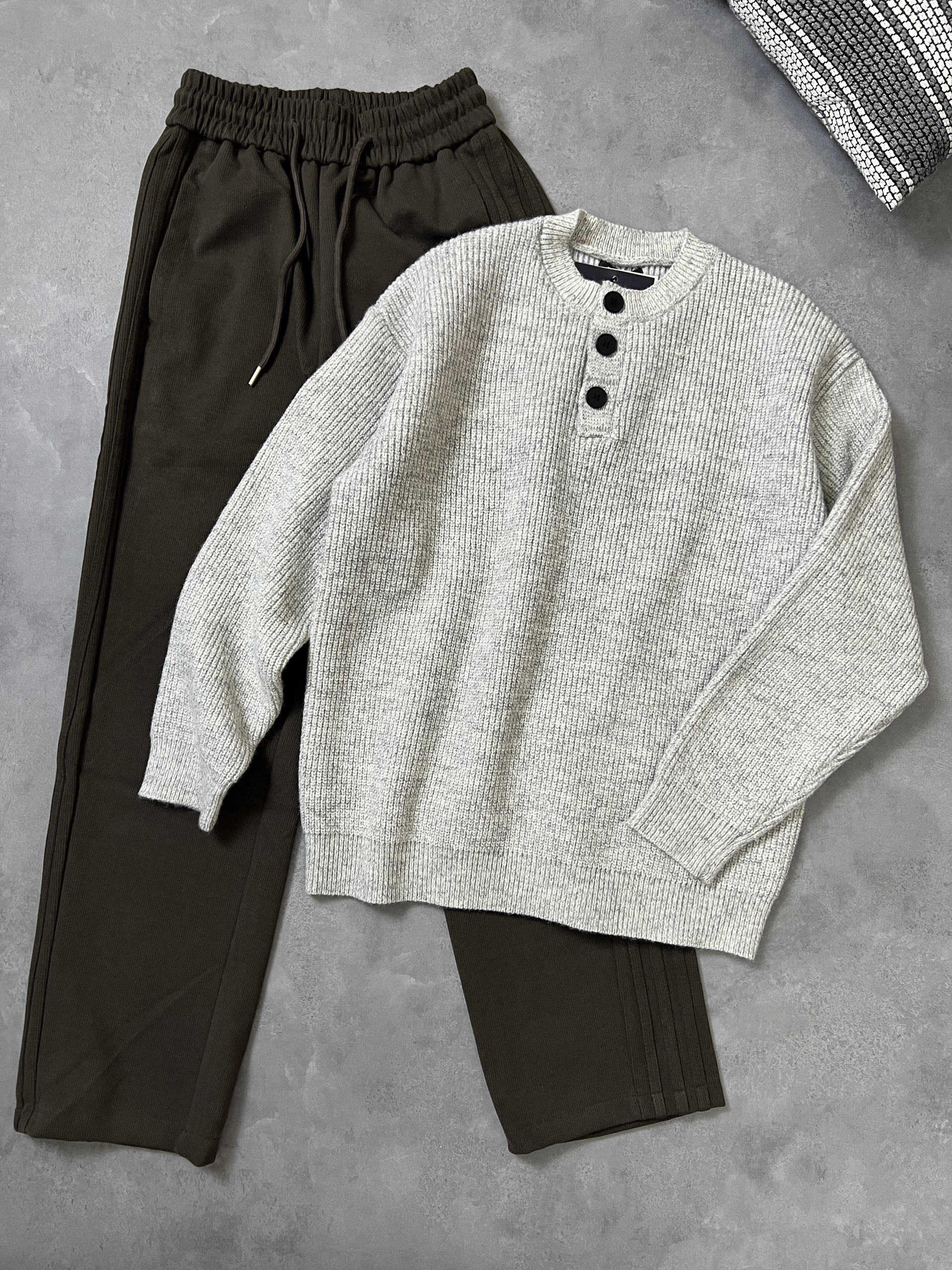 这套毛衣穿搭太帅了吧 兄弟们! 整体是稳重的风格又不失时尚感,领口做了纽扣设计正面不会太单调,最喜欢的是后背的小细节皮标!就很高级! 搭配这件咖啡色休闲裤真的太帅了啊啊 面料手感很厚实保暖效果很好 真是保暖和帅气兼得! 单穿推荐搭配一个白色打底衫 增加层次感~ 版型是宽松不挑身材的 男女生都可以穿的一款,真的秋冬必备的一件毛衣!帅帅帅!!!