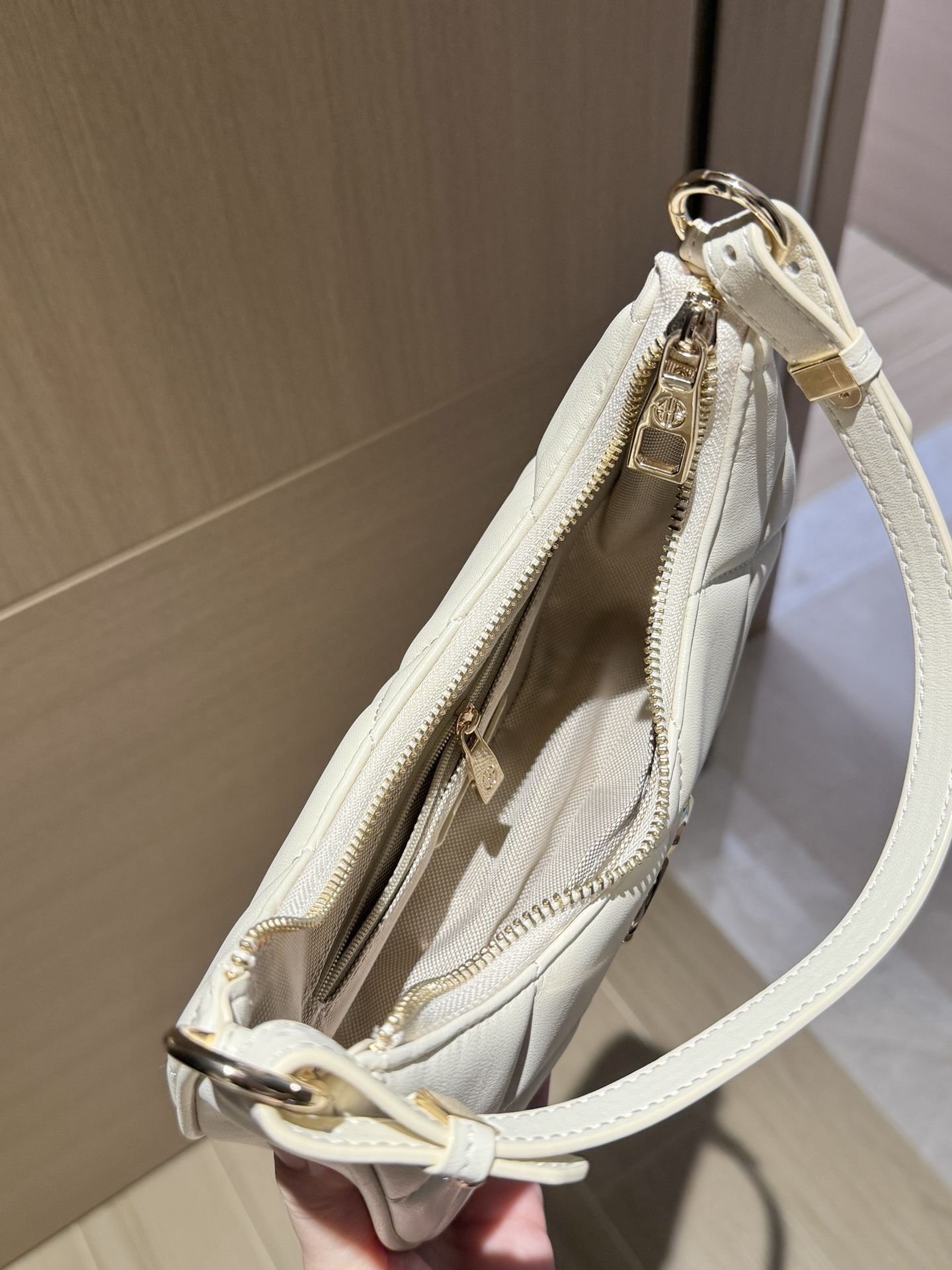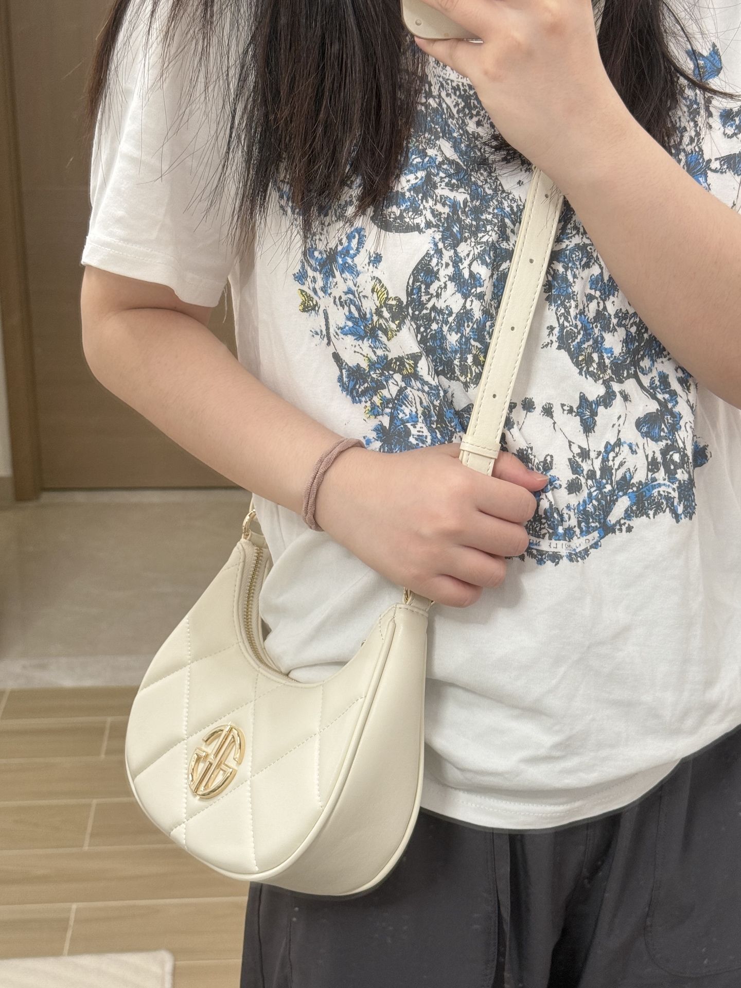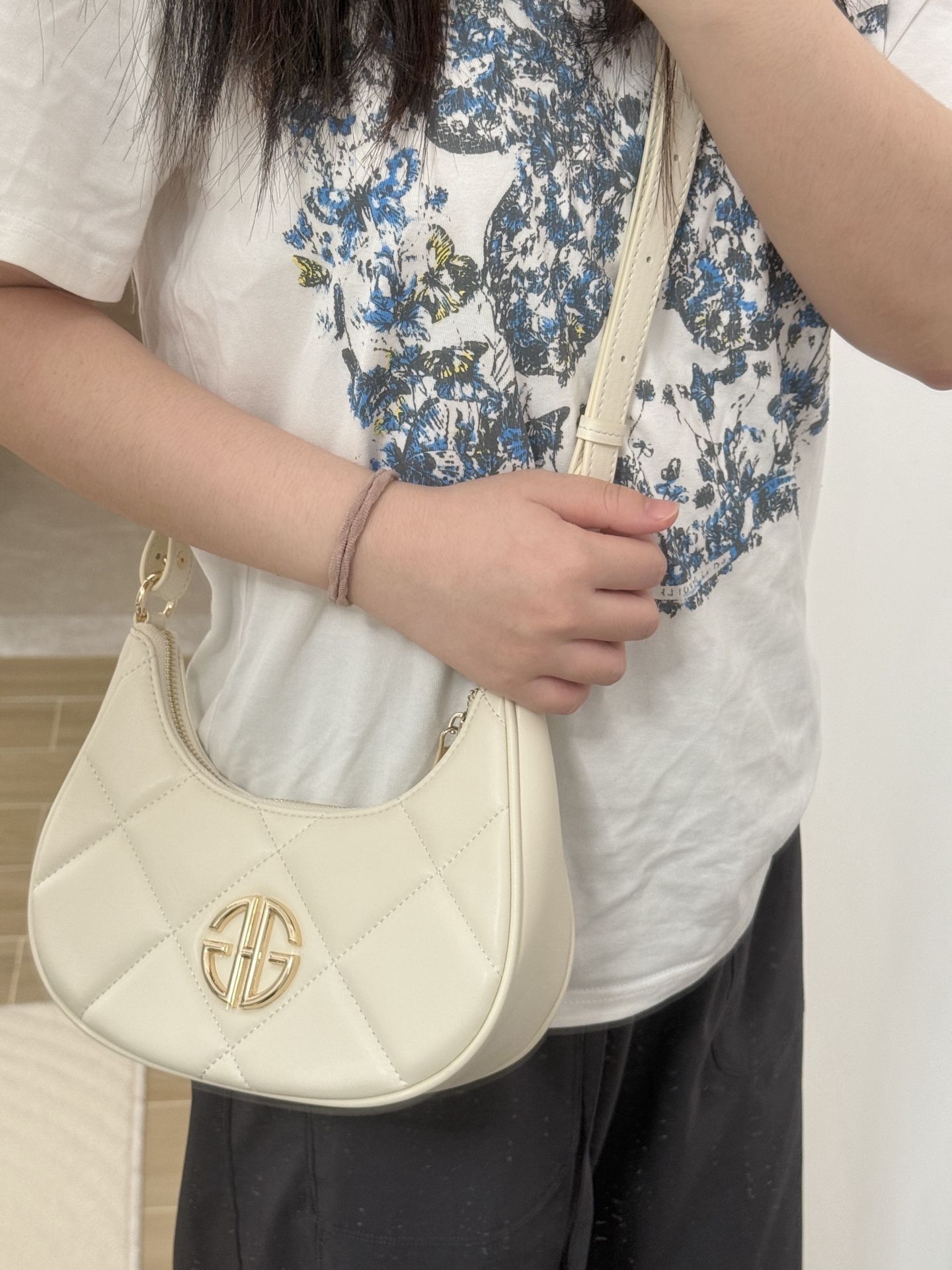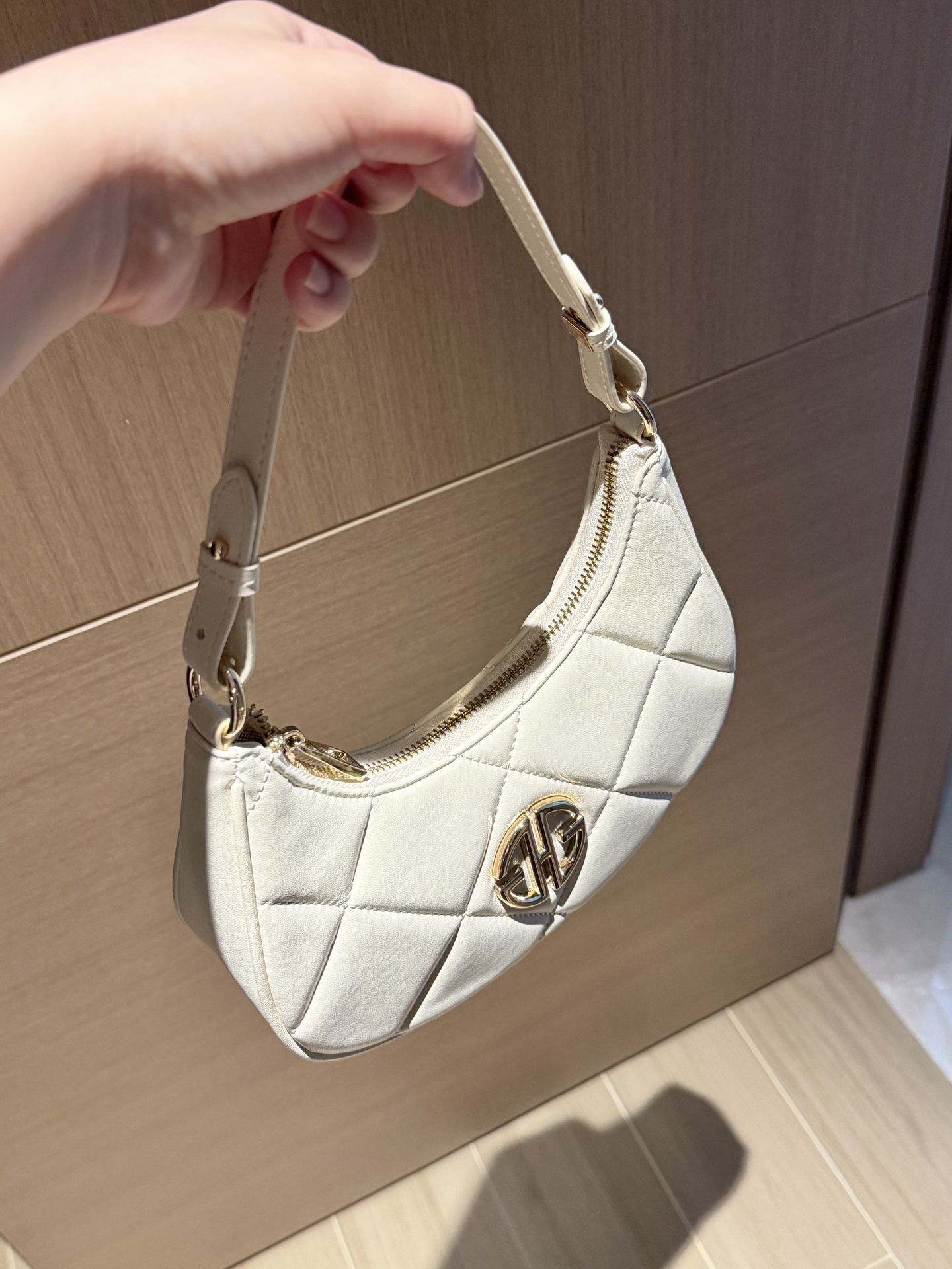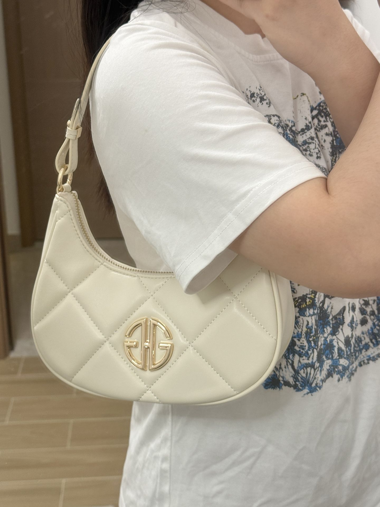 是 GHG 菱格月牙包啦 我觉得这个奶油白和夏天适配度蛮高哒 皮质摸着挺柔软,容量也足够了 日常直接手提出门,也🉑当斜挎包 百搭不挑衣服~