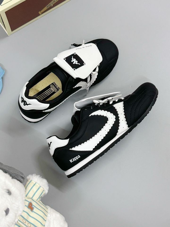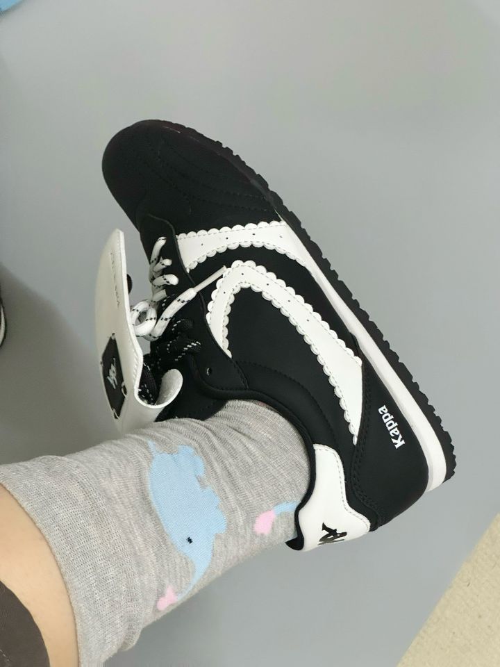 家人们谁懂啊!Kappa这双鞋太绝了,黑白配色经典又高级,花边设计还贼可爱,细节直接拉满~ 上脚舒服到飞起,品质没话说,搭配我的小象袜子,一整个时尚感爆棚,妥妥的穿搭神器,家人们冲就完事!