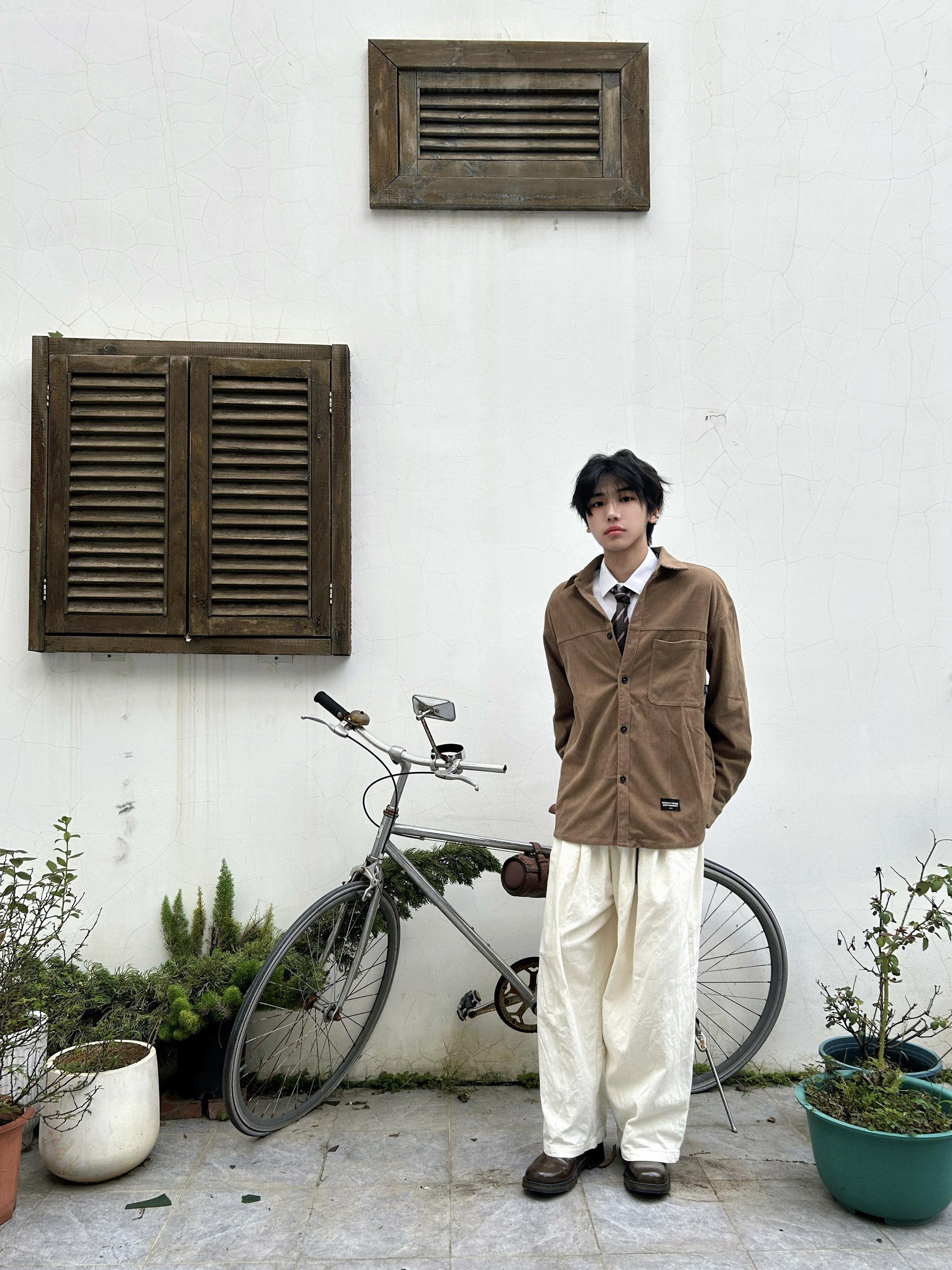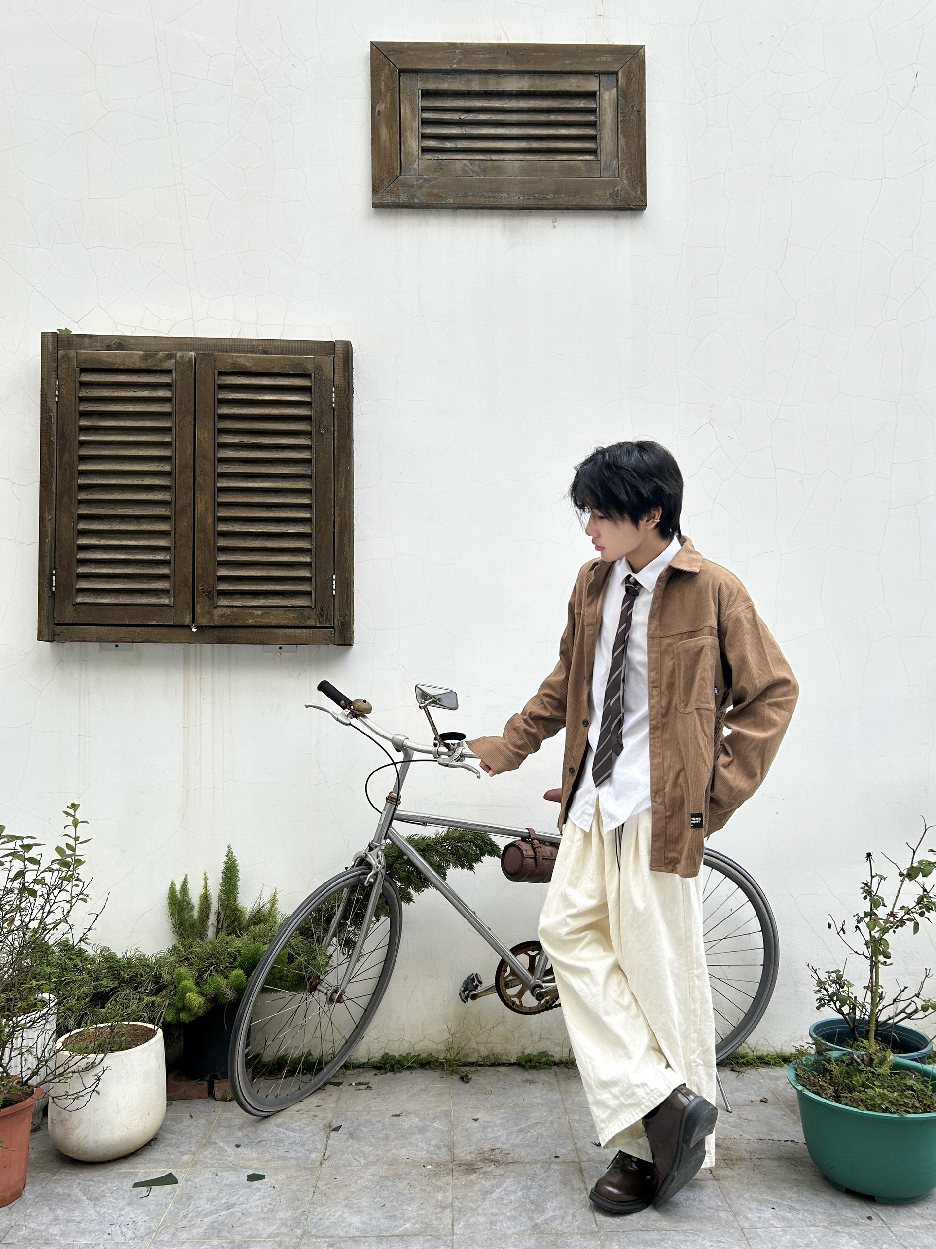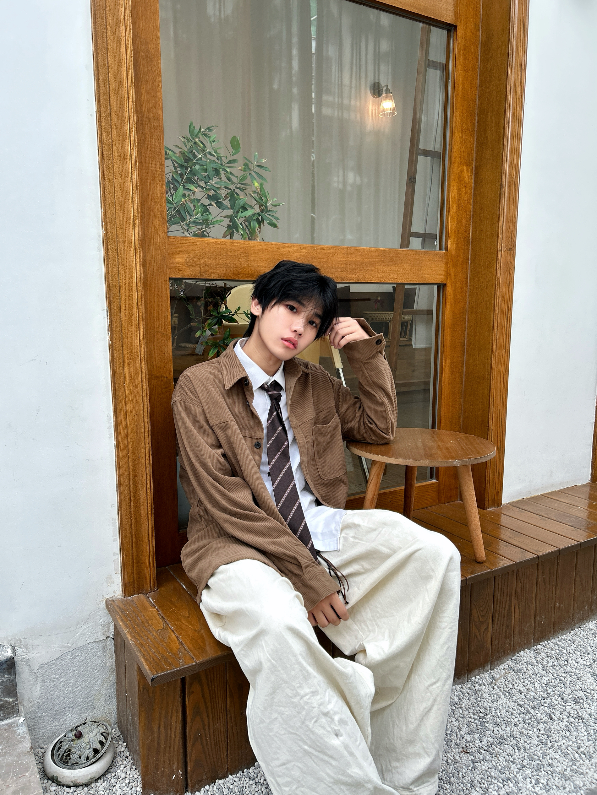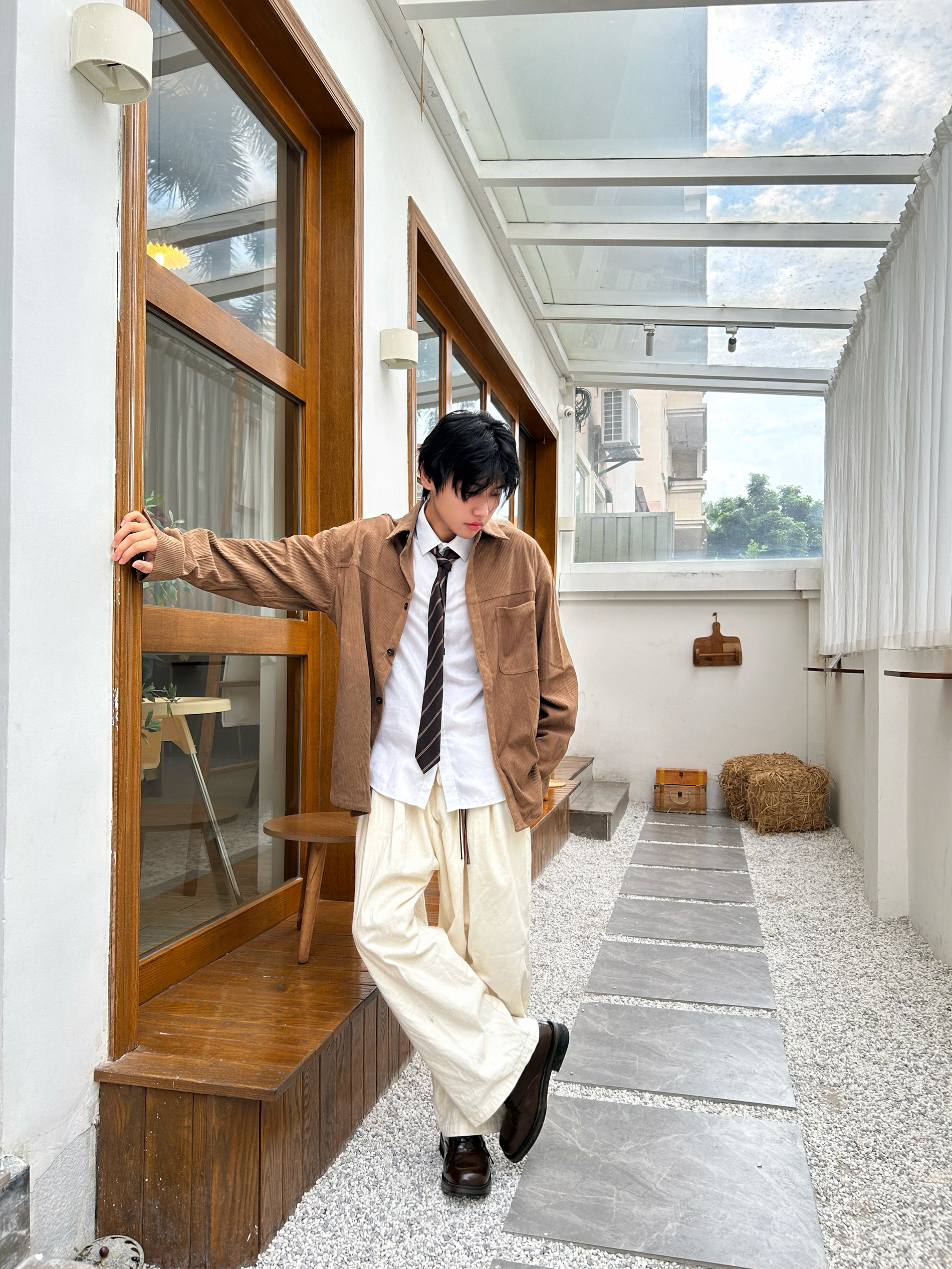 当秋日的阳光带着暖棕调的饱和度洒落 是时候让美拉德风在穿搭里上演静默复古剧了 一件卡其棕灯芯绒衬衫 自带复古肌理感 内搭白衬衫+格纹领带 是学院风与复古感的巧妙碰撞 再配米白色阔腿裤,慵懒又显格调 踩上一双深棕皮鞋 从色调到风格把秋日的复古氛围感和穿搭层次拿捏得恰到好处 是复古男孩的质感牌面~