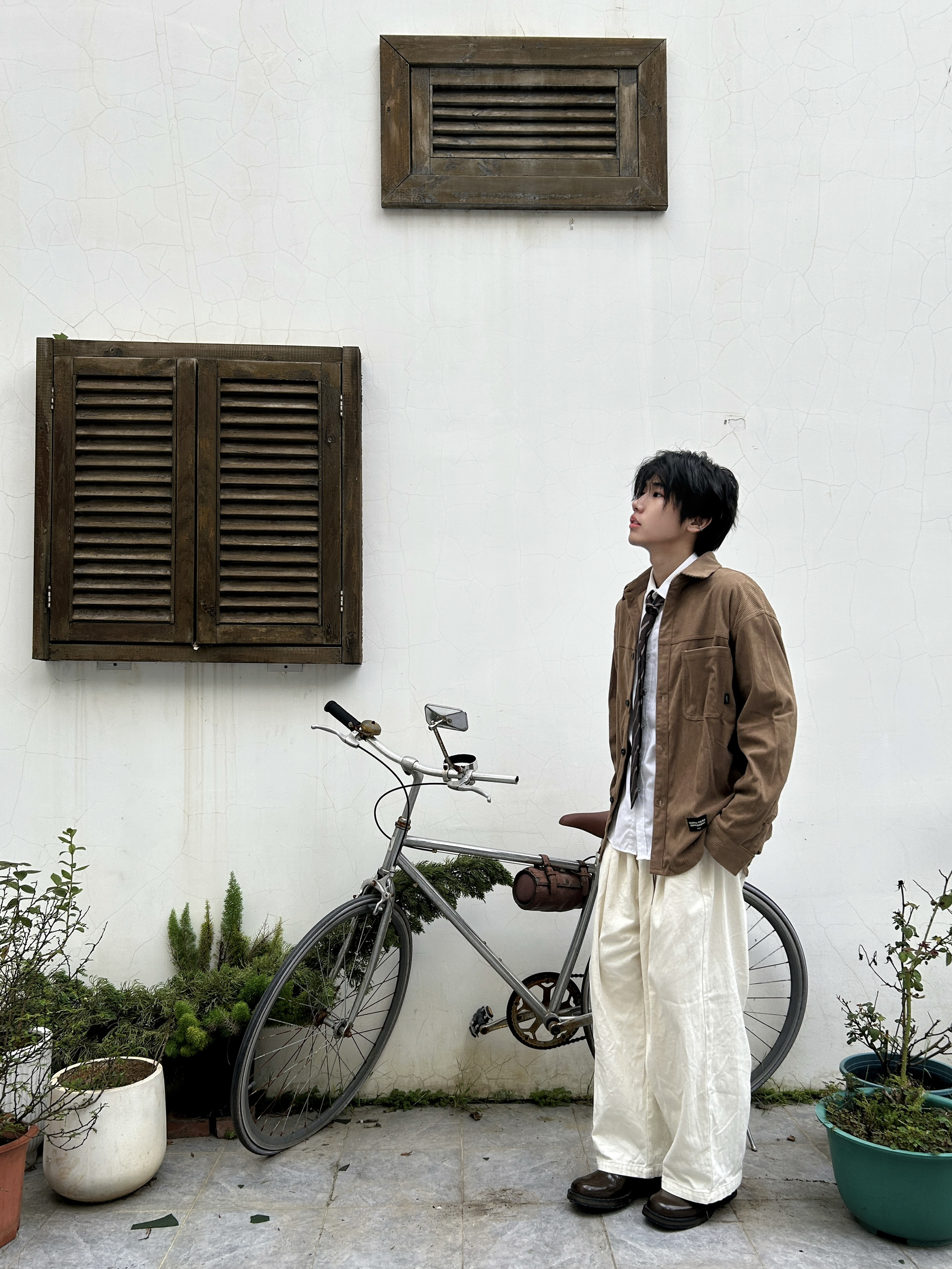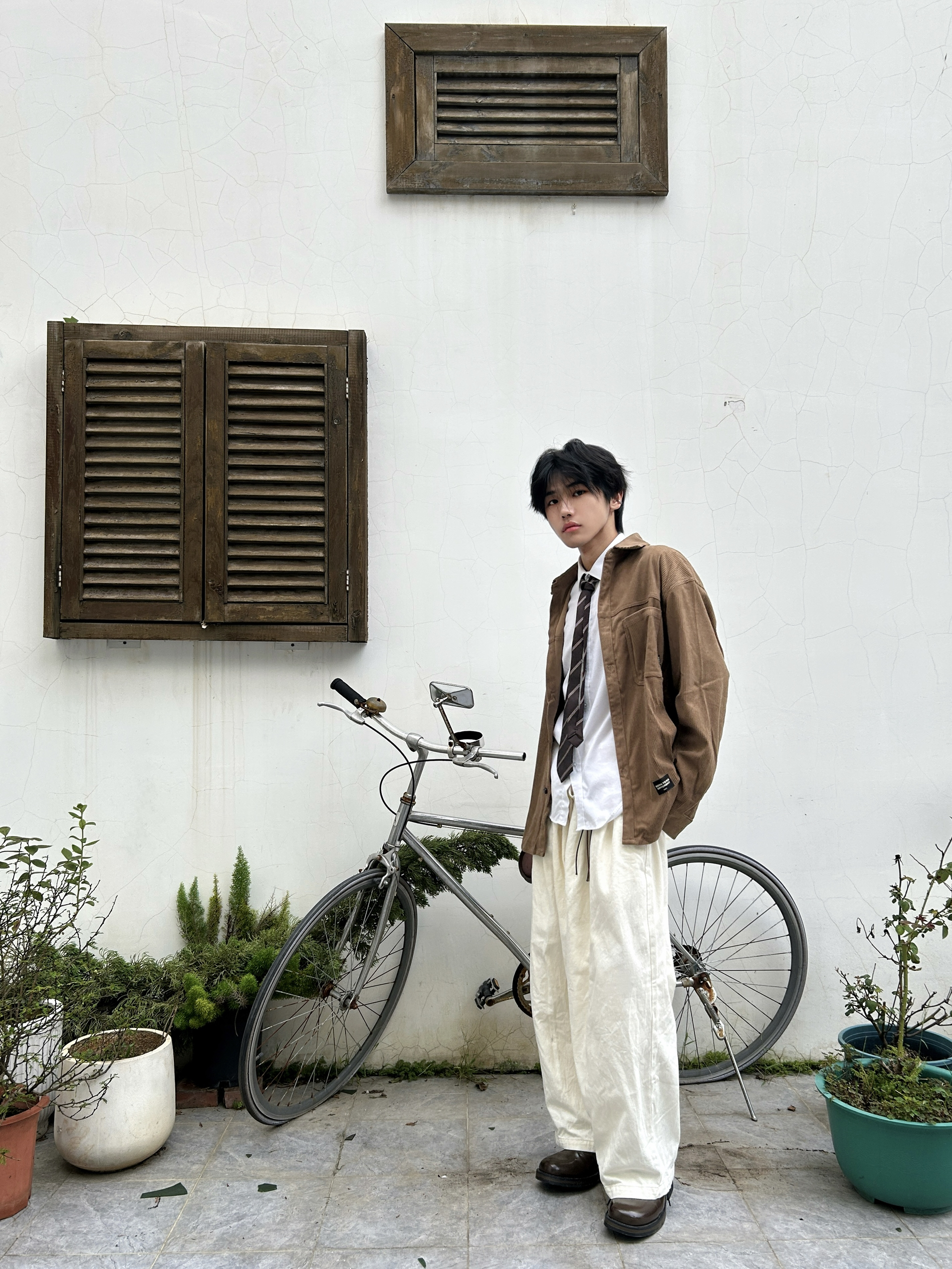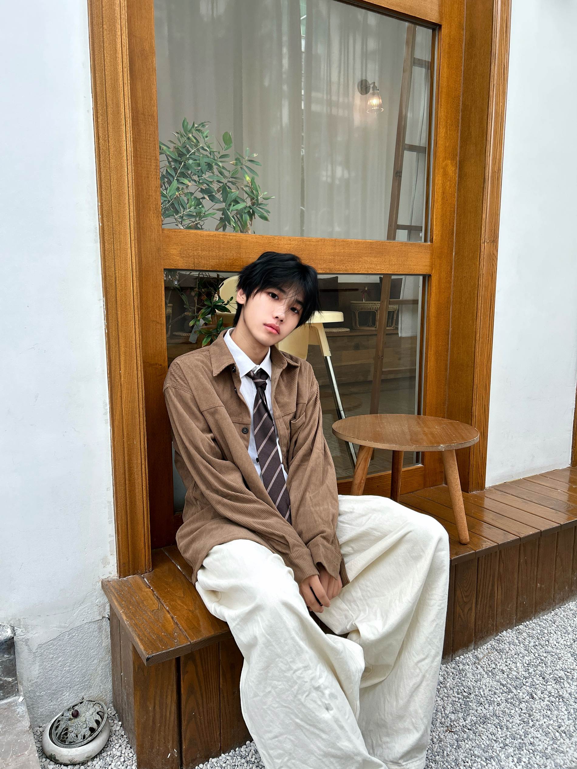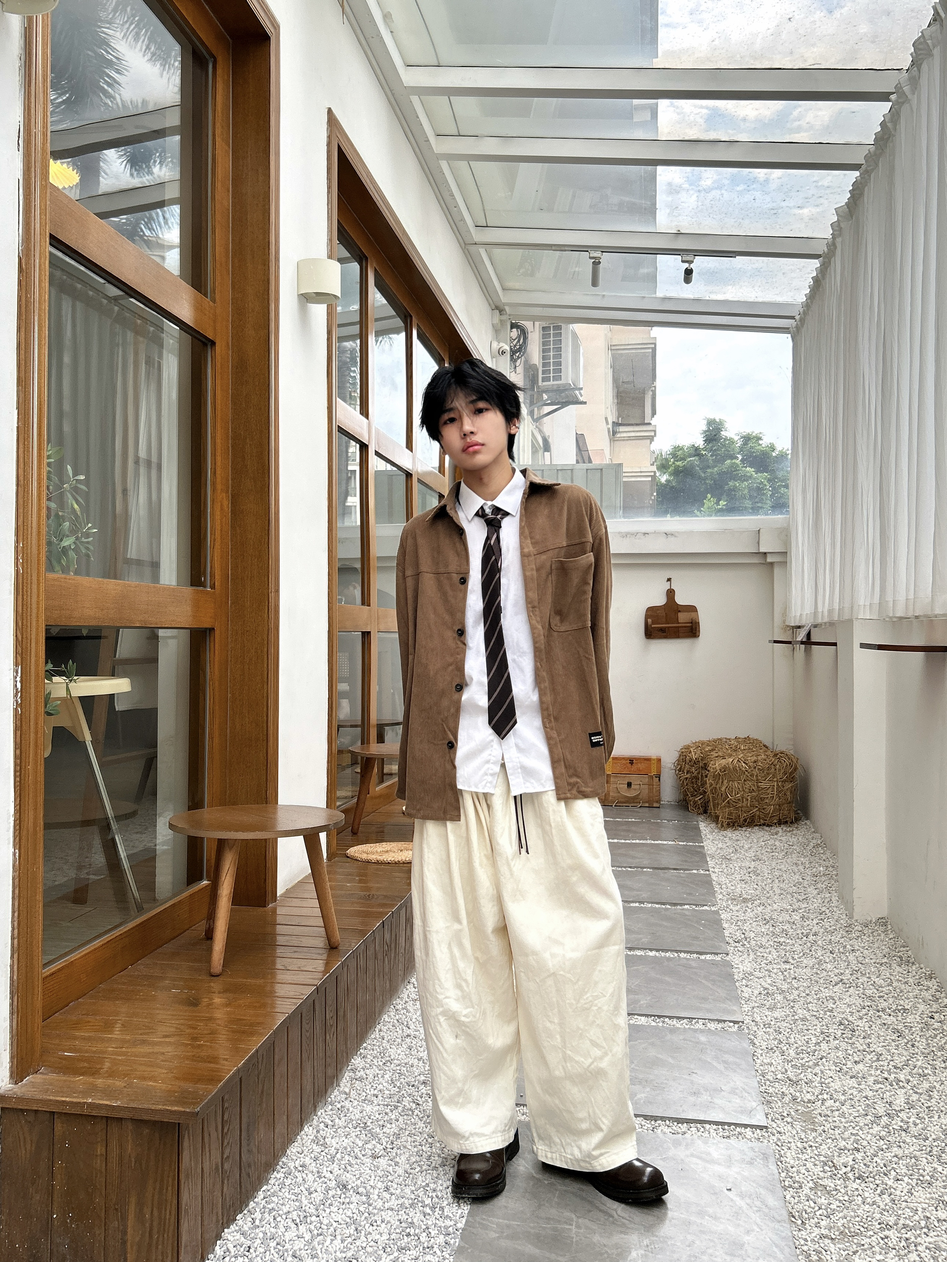 当秋日的阳光带着暖棕调的饱和度洒落 是时候让美拉德风在穿搭里上演静默复古剧了 一件卡其棕灯芯绒衬衫 自带复古肌理感 内搭白衬衫+格纹领带 是学院风与复古感的巧妙碰撞 再配米白色阔腿裤,慵懒又显格调 踩上一双深棕皮鞋 从色调到风格把秋日的复古氛围感和穿搭层次拿捏得恰到好处 是复古男孩的质感牌面~