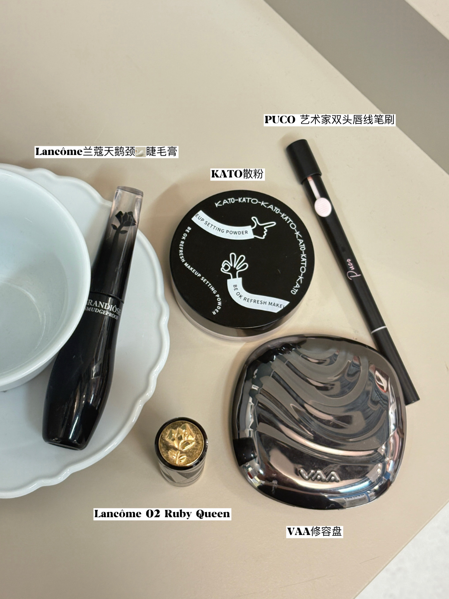 ①Lancôme兰蔻天鹅颈睫毛膏 是真的牛,刷头弯弯的,睫毛刷完又翘又密,完全不会苍蝇腿~ ②KATO散粉 我基本上化妆一直都在用这个,出油了拍一拍立马哑光,持妆能打。 ③PUCO唇线笔 太适合勾勒唇形了,新手也能画出饱满唇峰,然后叠涂Lancôme兰蔻02口红,这红宝石色一上嘴,又纯又欲的小野猫感直接拉满 ④还有VAA修容盘,鼻影色自然得像天生高鼻梁,侧影收脸颊也很绝,不会显得脏脏的。 整套画...