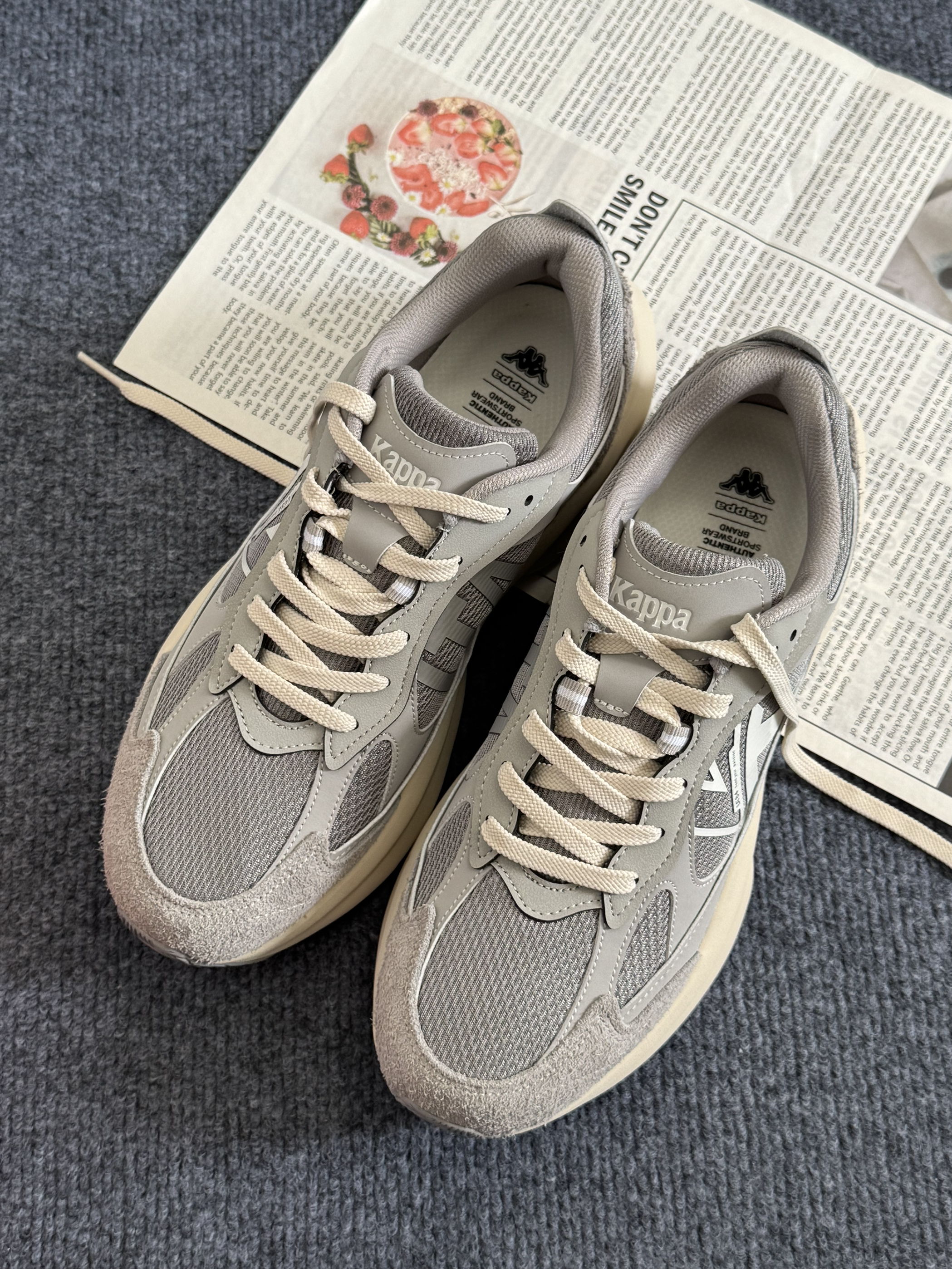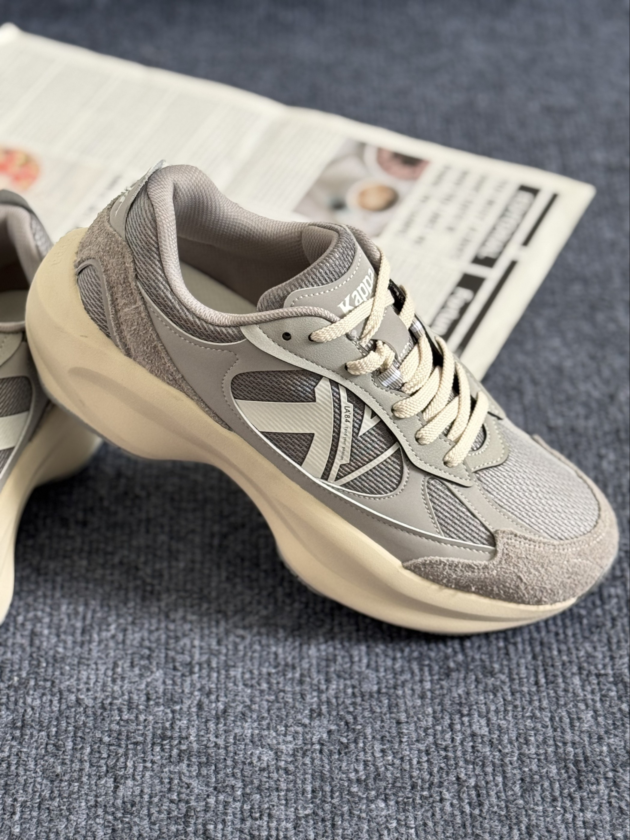 hello,这里是阿玖,最近种草了一款kappa宝藏休闲运动鞋👟 鞋身以灰色为主,搭配上米色的中底,带有一点复古的气息🍂,鞋侧和鞋尾卡帕logo的设计,也增加了整体的辨识度✨ 鞋面翻毛皮➕网面织物拼接,不仅有质感,而且还保证了透气效果,夏天穿也不会感到闷脚,EVA发泡的中底,踩上去软软的,hin舒服😌 关键还有5cm的跟高,对小个子来说还挺友好的,而且搭配也简单,休闲裤、卫裤、短裤也都能驾驭🫴,尺...