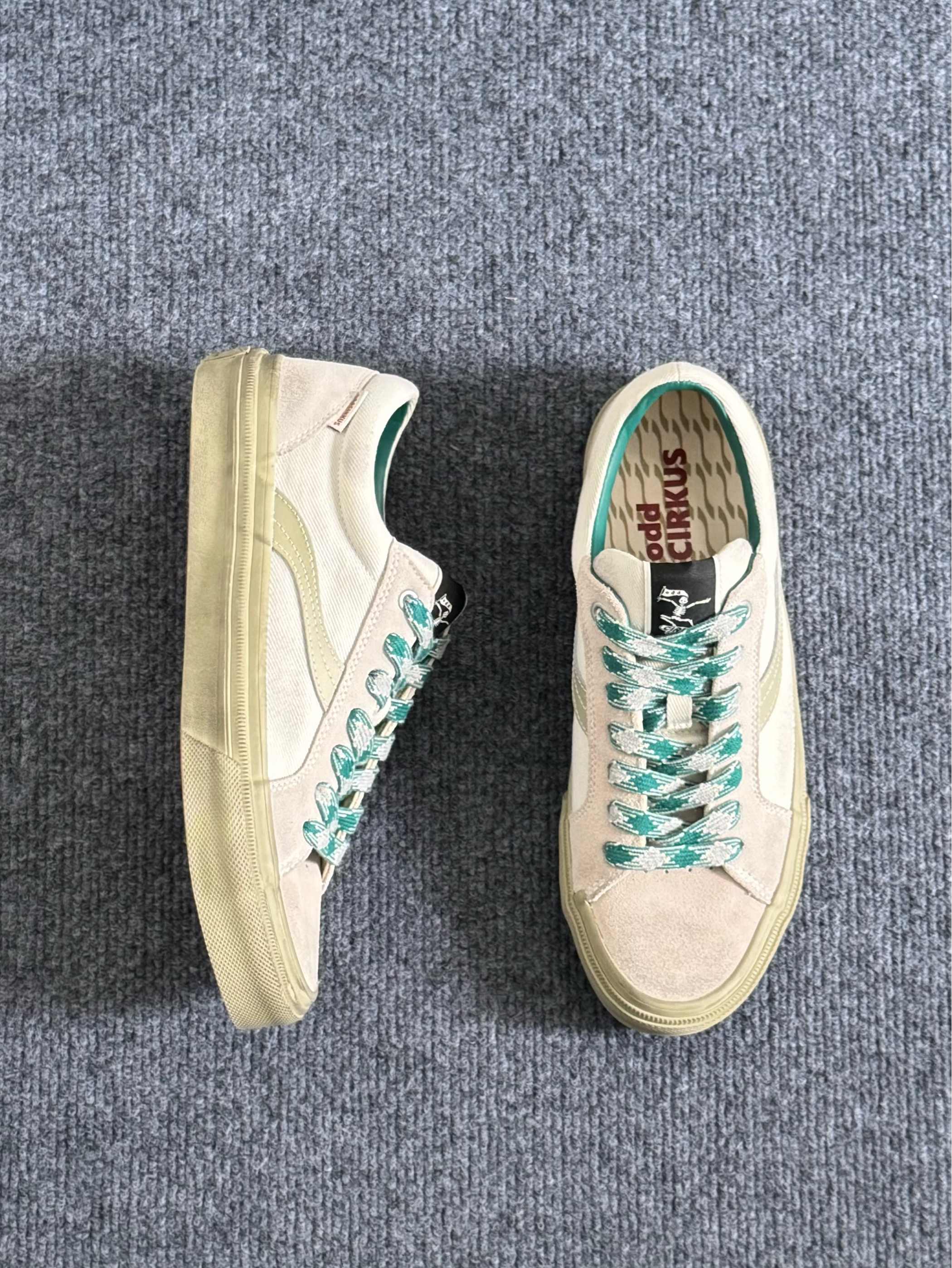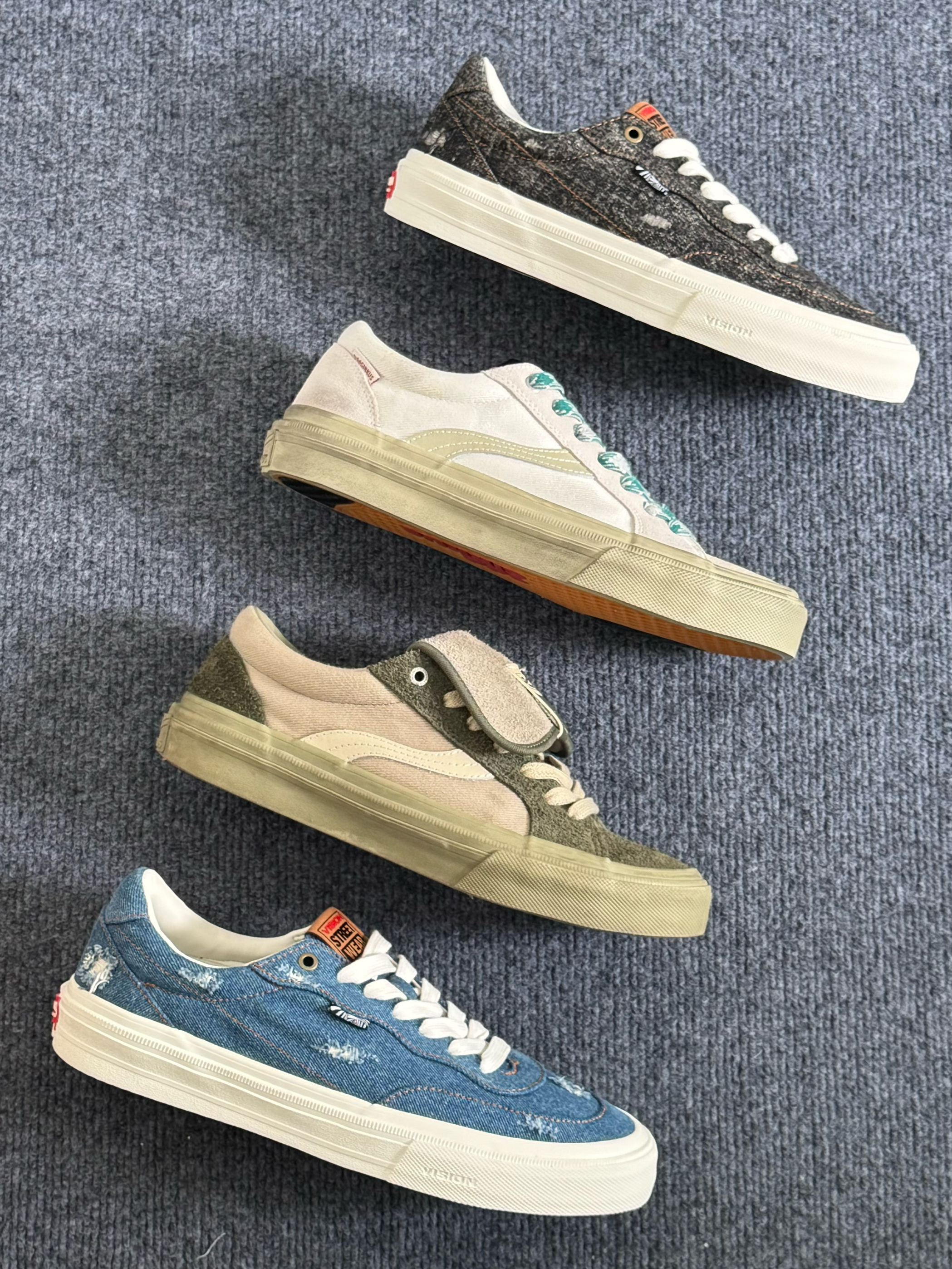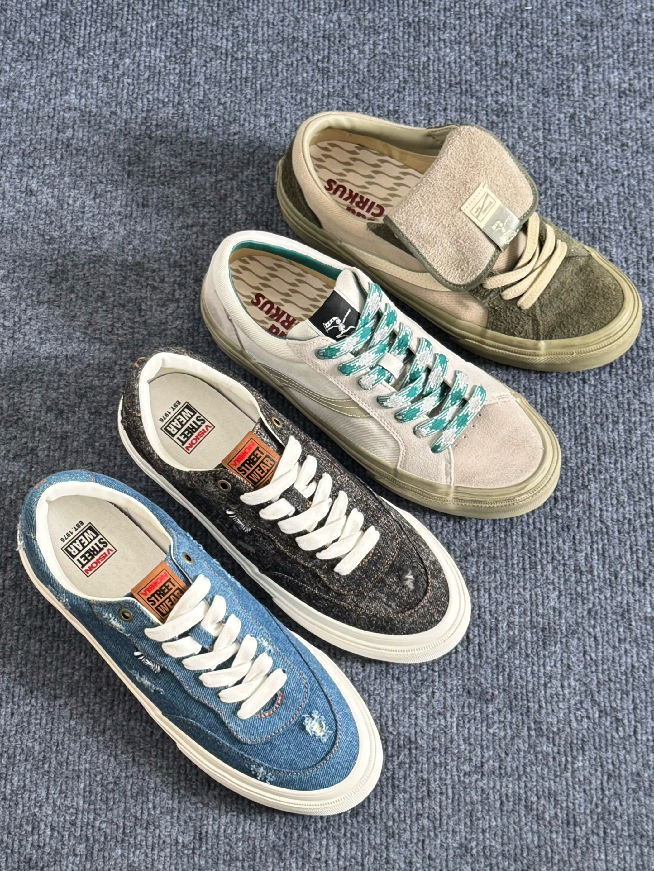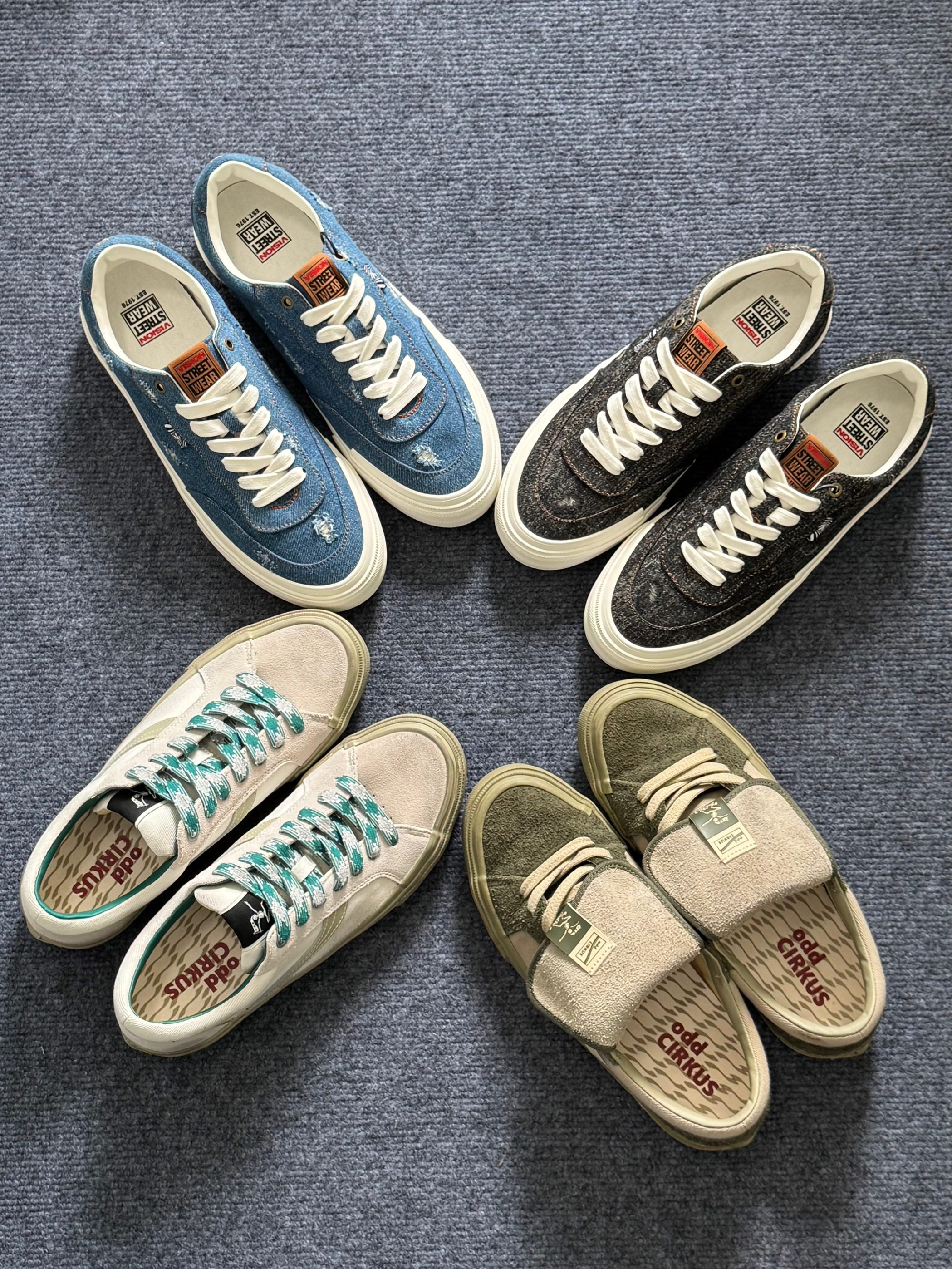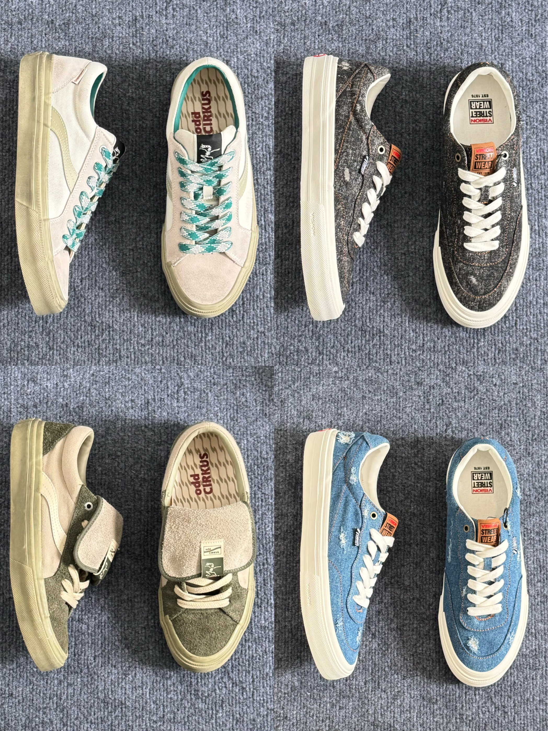 hello,这里是阿玖 今日分享四款帆布鞋👟 1️⃣oddCIRKUS 水泥白☁️ 暗绿色鞋带和内里点缀,结合鞋面做旧的处理,整体比较复古🍂 2️⃣oddCIRKUS 抹茶绿🍵 手工擦旧的设计,结合翻盖的鞋舌,带有满满的时尚气息🌬 3️⃣Vision 牛仔蓝👖 破洞牛仔的设计,整体让我感觉hin有少年感🍃 4️⃣Vision 黑牛仔🐦⬛ 同样也是手工擦破的设计,但整体比较百搭,而且更加耐脏✌️
