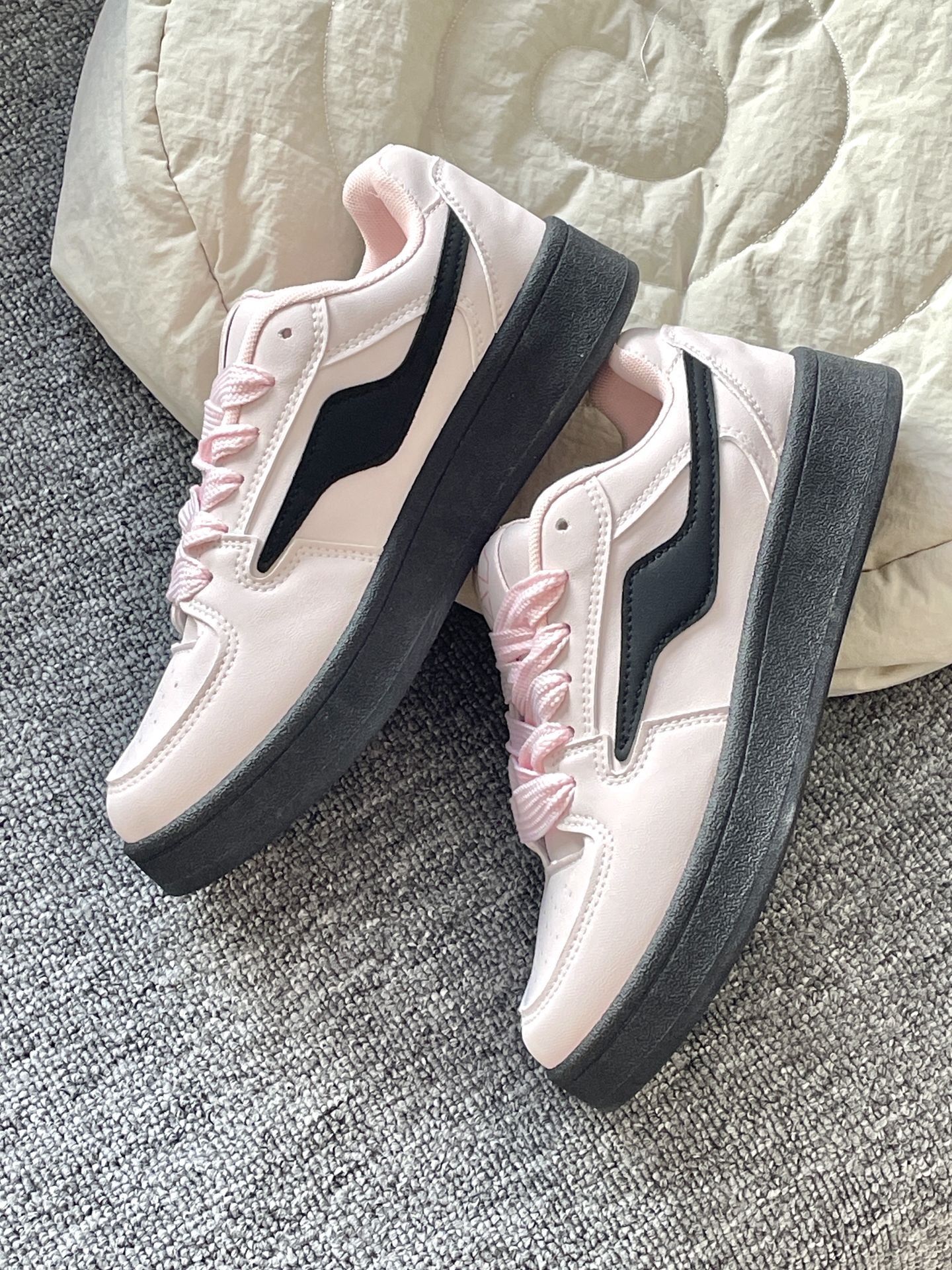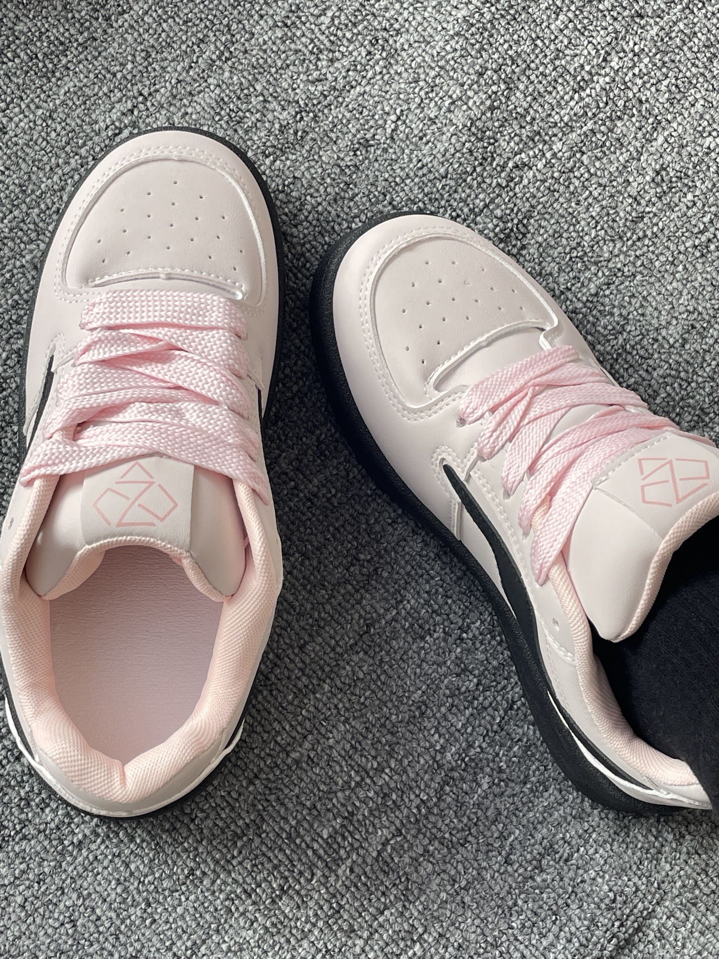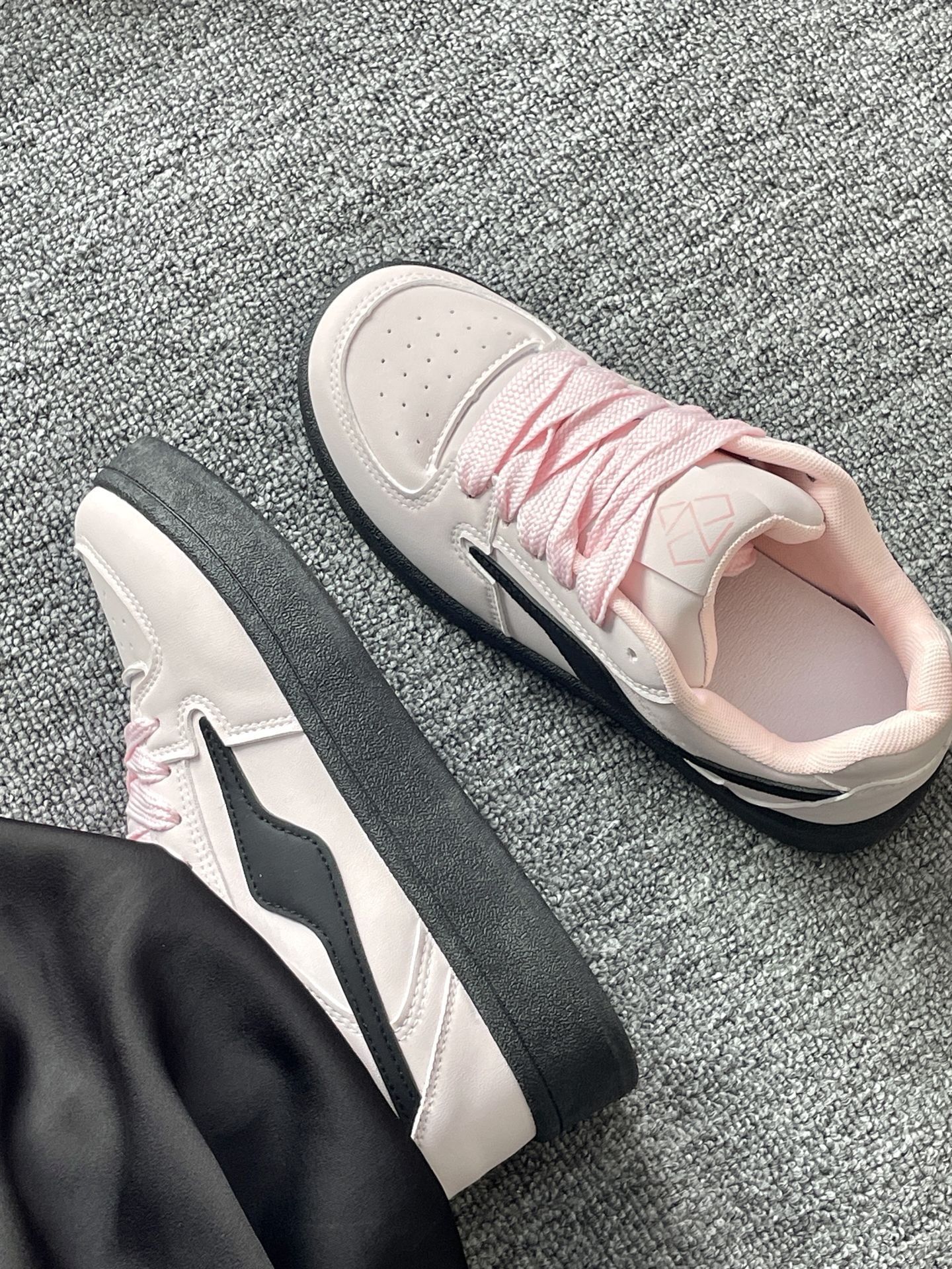 好喜欢介个黑粉配色的板鞋哇~ 鞋子穿着软软的 穿着还蛮舒服的耶 而且还是黑色和粉色配色 我觉得也太酷啦 鞋码很正哇 我平时搭配牛仔裤什么的 显得腿还挺细的哦 我觉得很不错耶