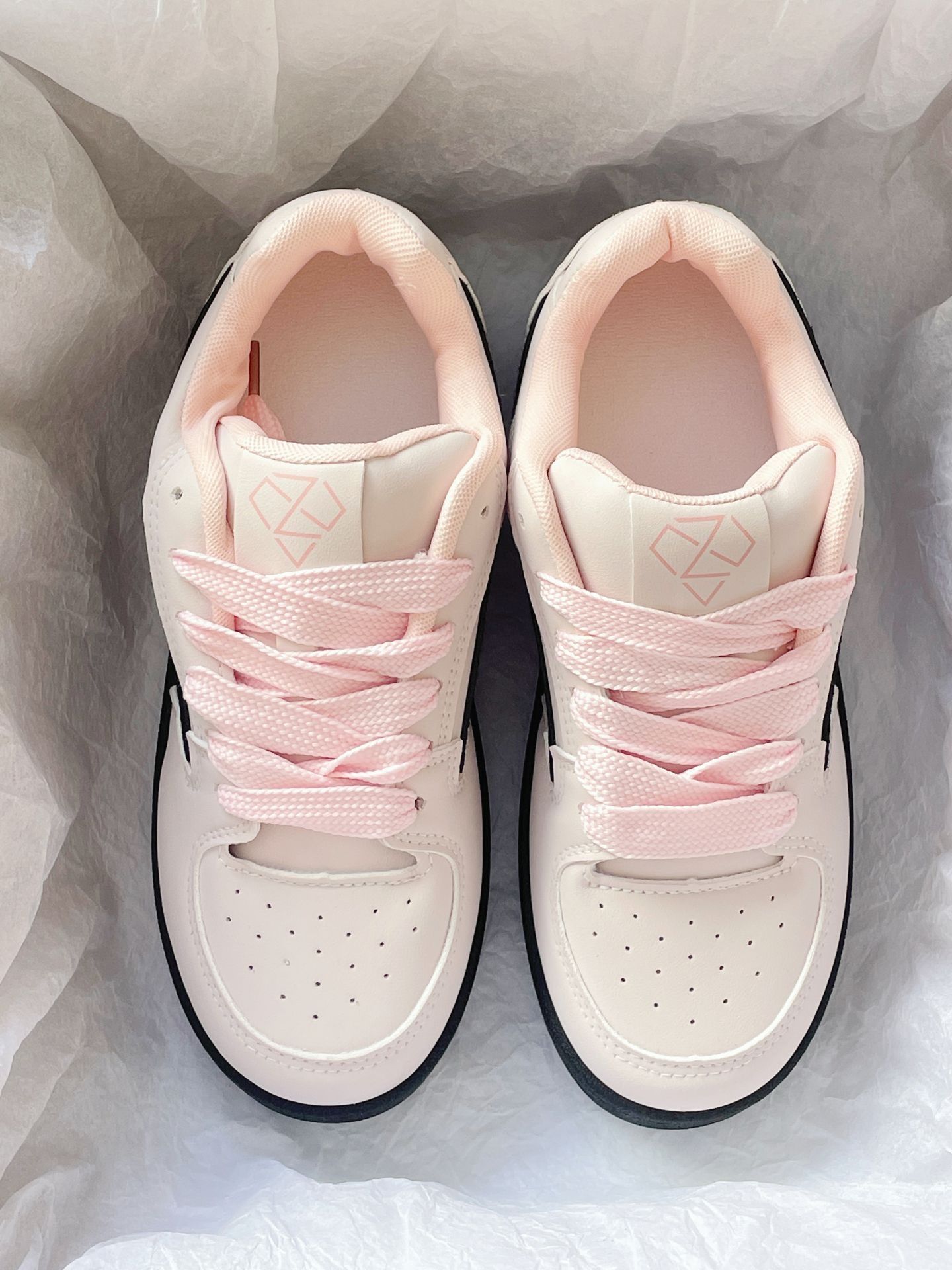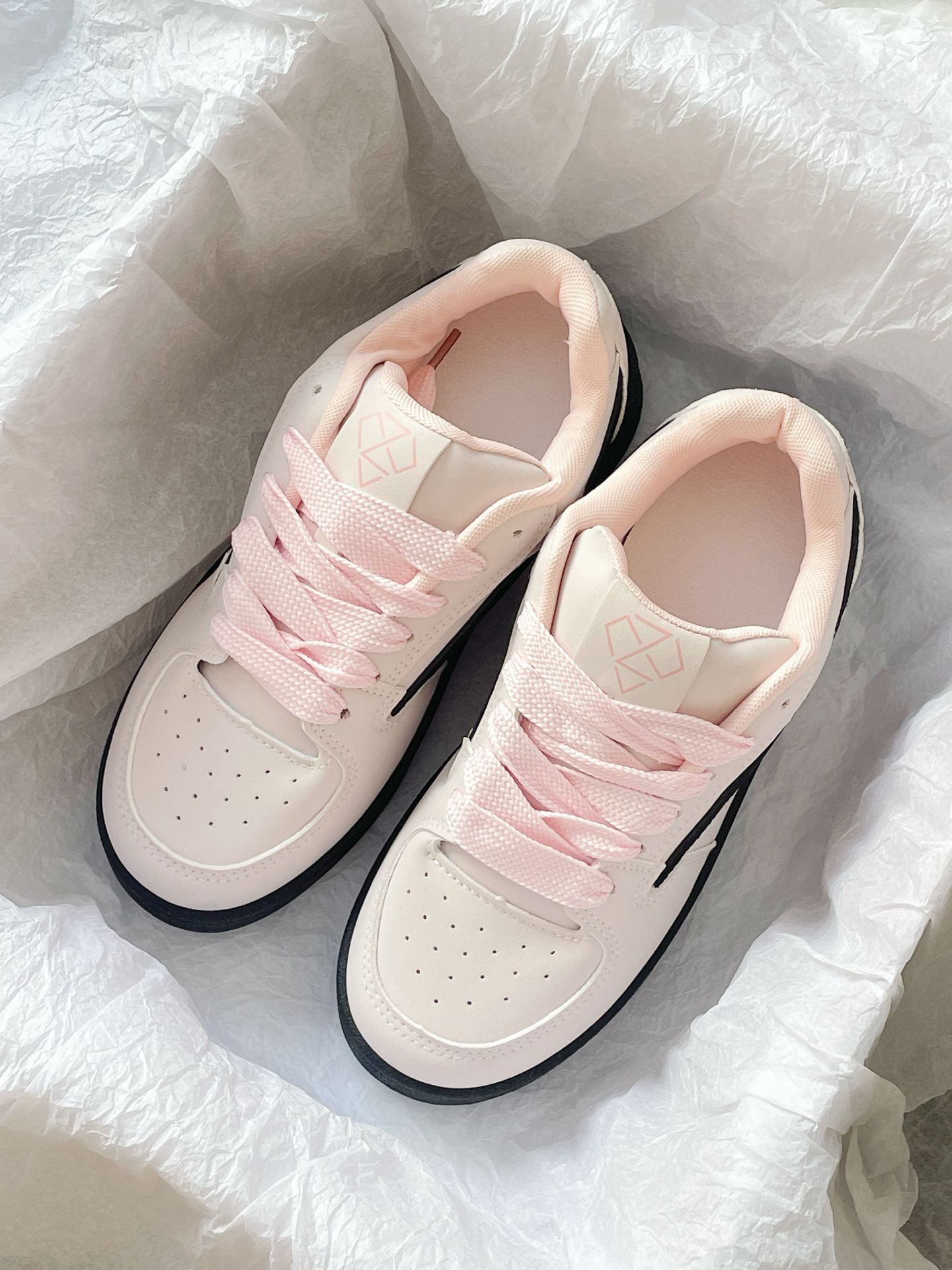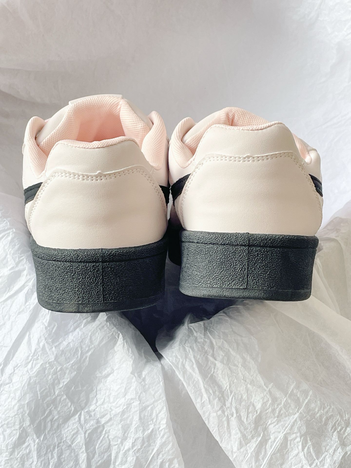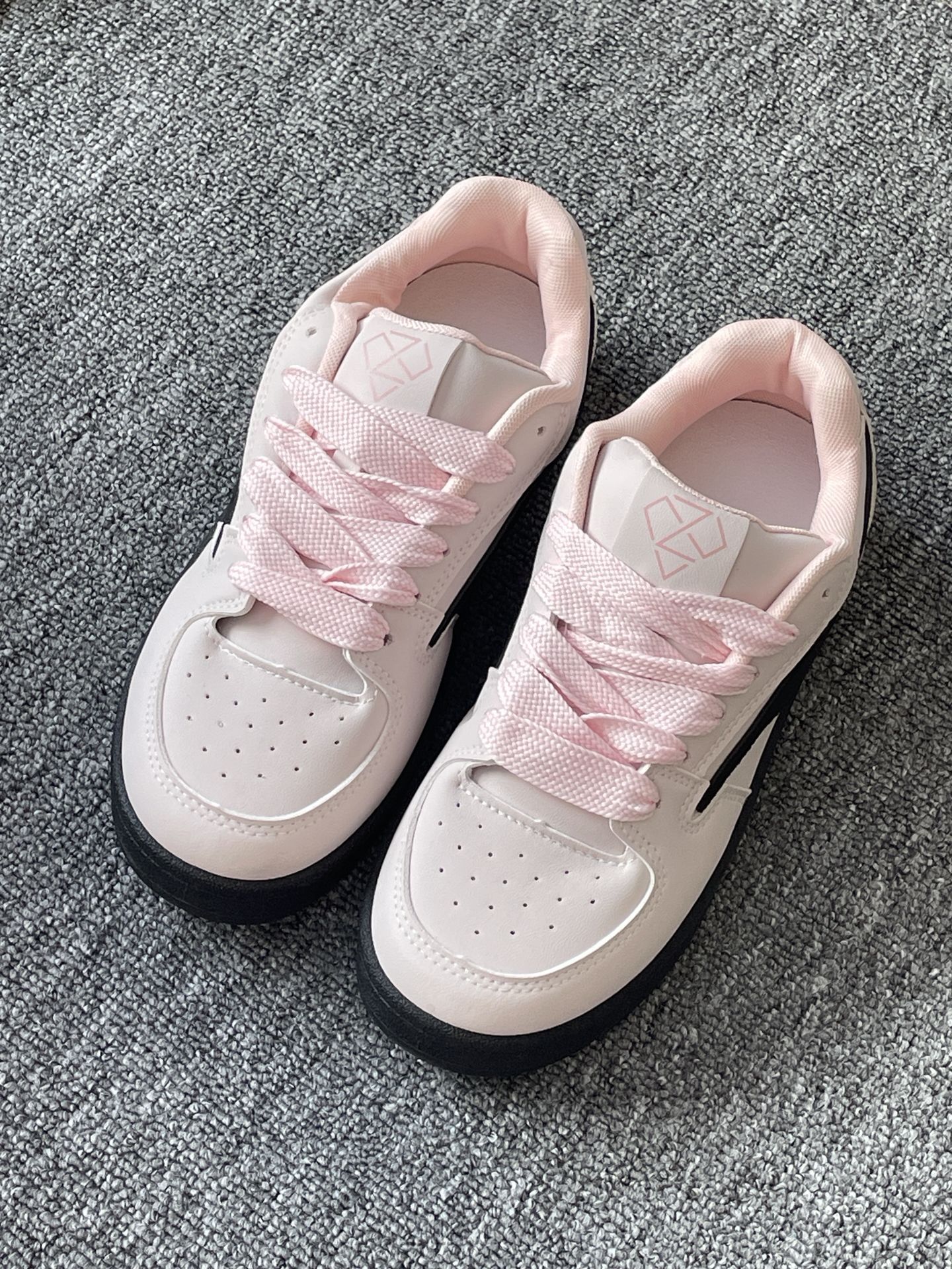 好喜欢介个黑粉配色的板鞋哇~ 鞋子穿着软软的 穿着还蛮舒服的耶 而且还是黑色和粉色配色 我觉得也太酷啦 鞋码很正哇 我平时搭配牛仔裤什么的 显得腿还挺细的哦 我觉得很不错耶