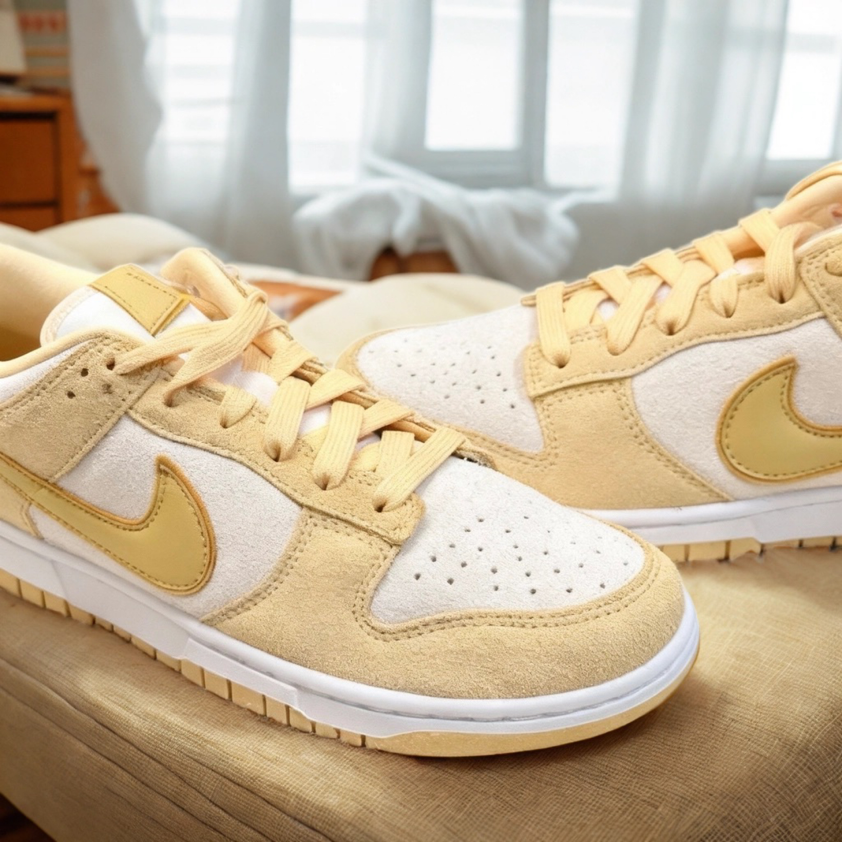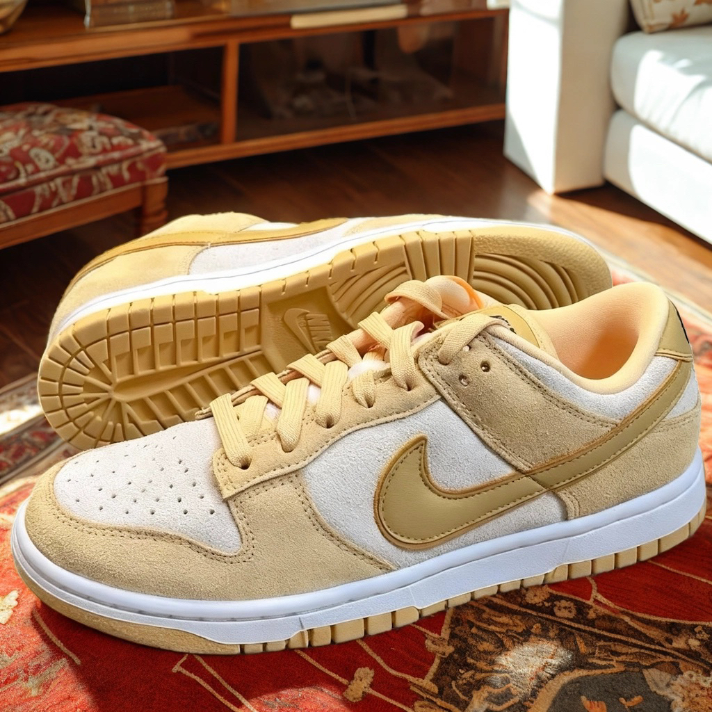 鞋面用的是这种短绒麂皮材质,摸起来手感软软糯糯的,就像在摸一块天鹅绒蛋糕,质感特别棒。上脚的感觉也很舒服,鞋型对脚型的包容度很好,不会挤脚。经典的Dunk鞋底提供了足够的支撑,我穿着它出去逛街、约会,走一下午也不会觉得累,脚感很踏实